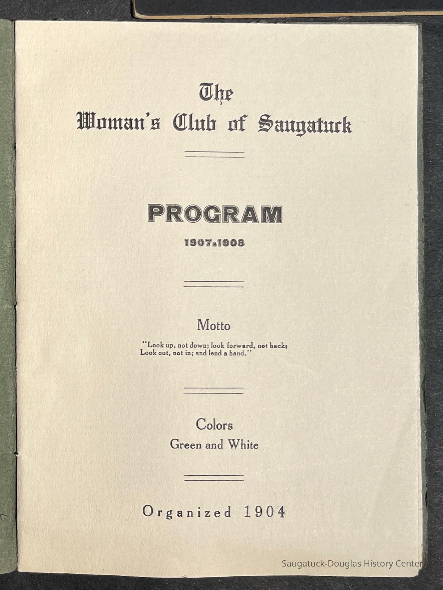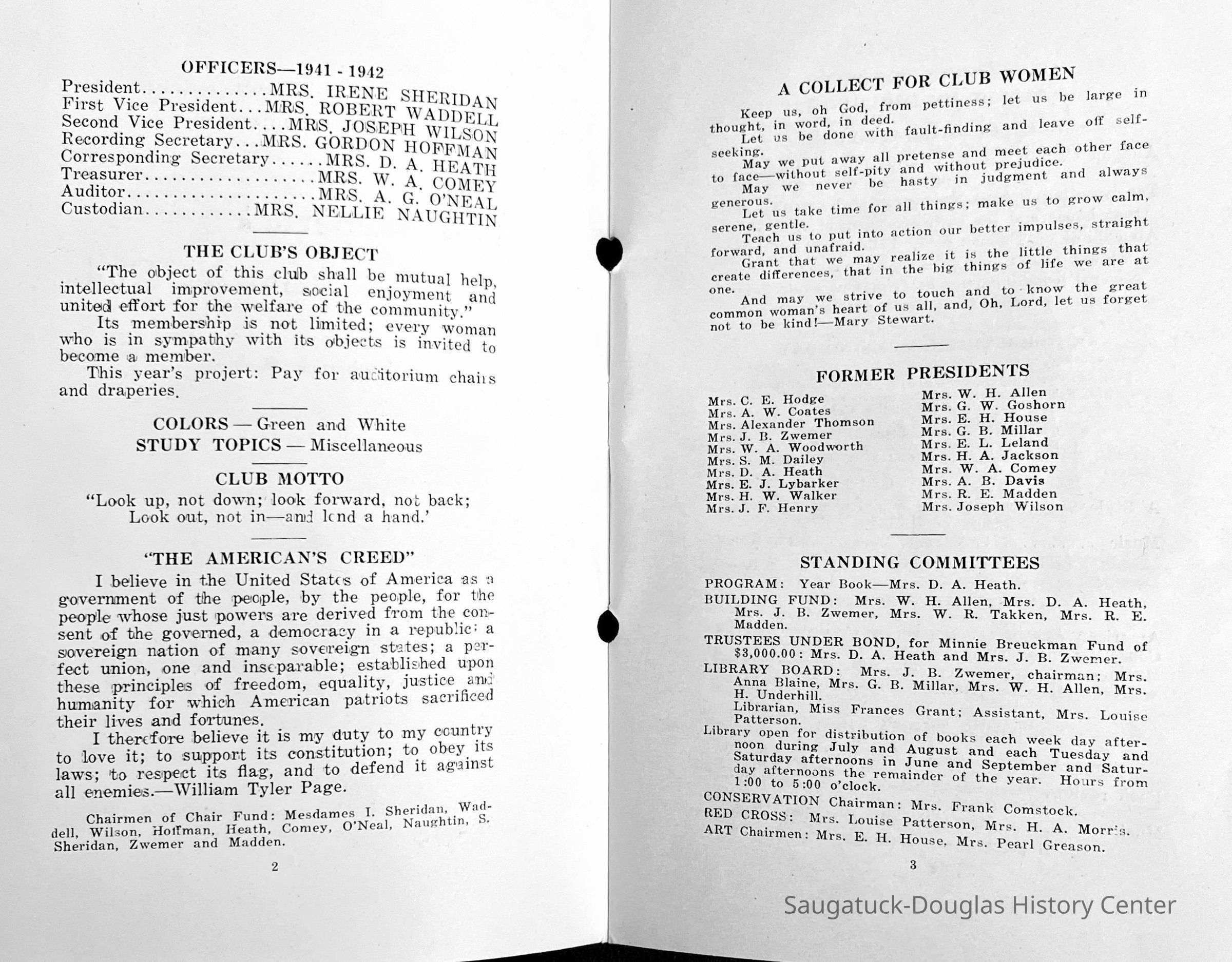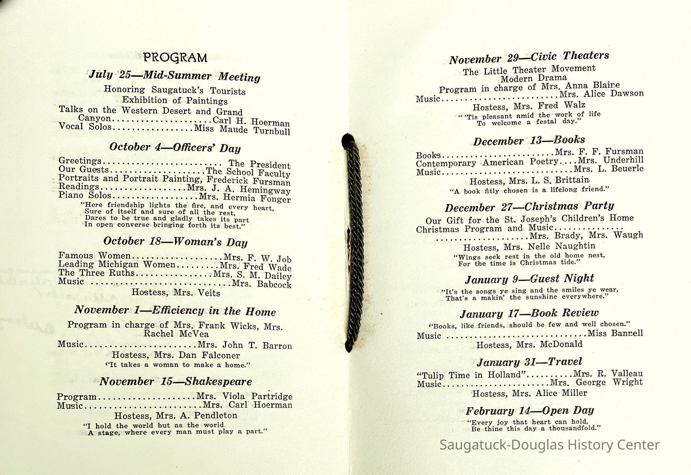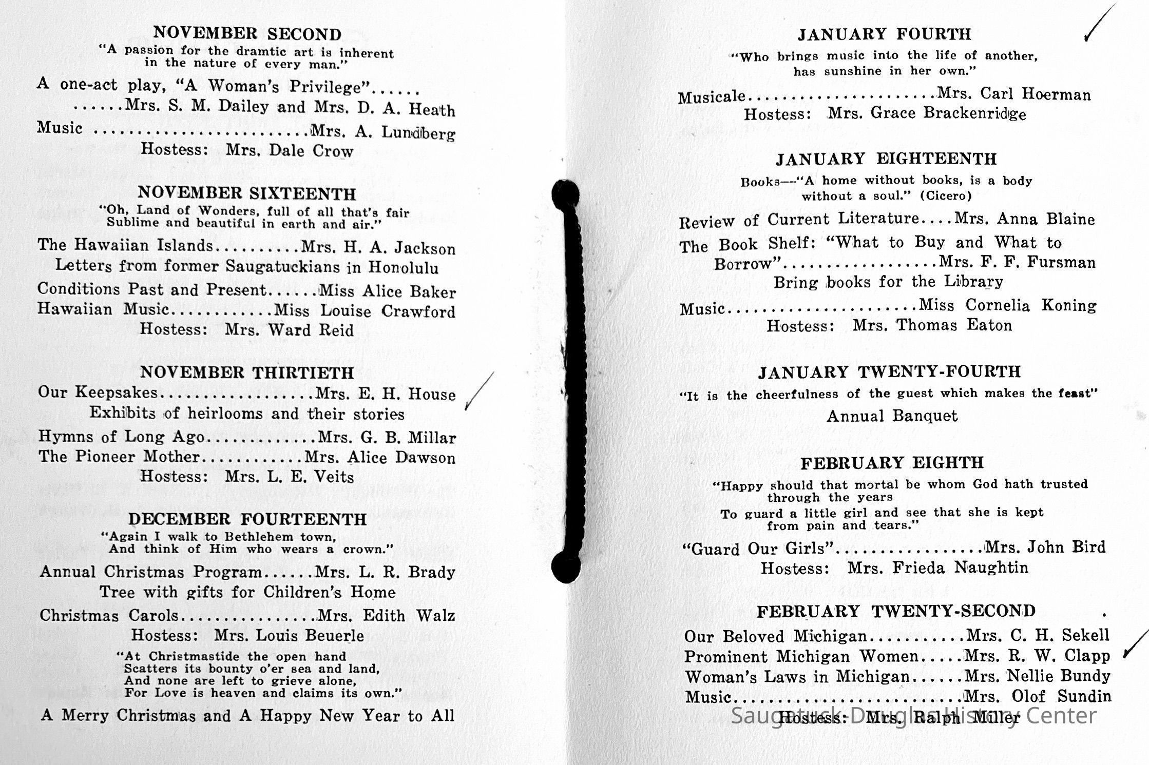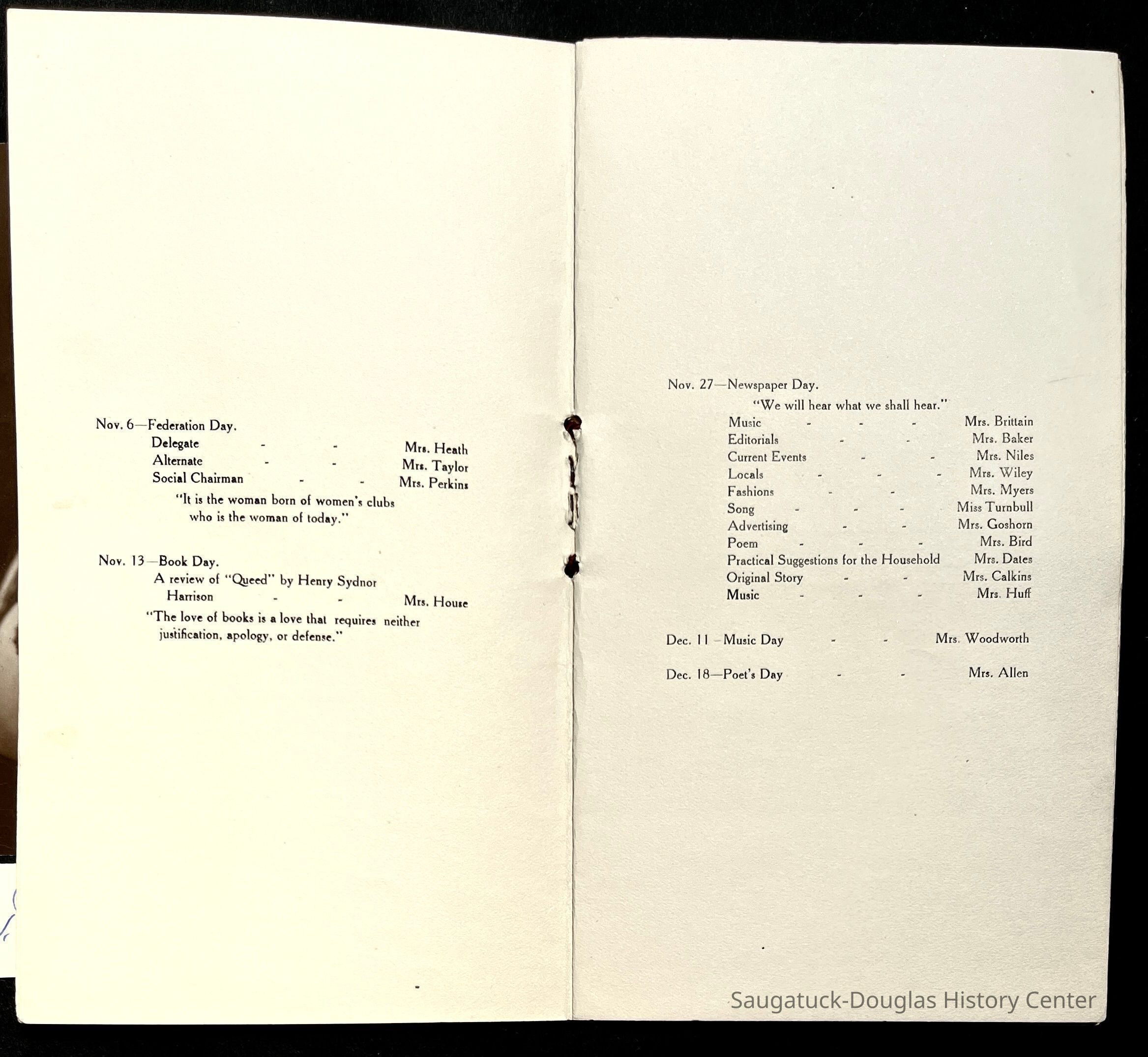 Saugatuck Woman's Club 1904-present, Saugatuck Woman's Club auditorium 1935-present, Heath, May (Francis) 1873-1961, Bird, Harriet “Hattie” Louise (Moffat) (Wright) 1855-1944, Breuckman, Minnie 1869-1934, Coates, Adella "Della" (Holmes) 1864-1950, Thomson, Jeanette Elvira (Harris) 1862-1956, Fox, Johnson 1918-2009, Hodge, Emma Ursula (Gunzenhauser) 1864-1950, Dailey, Margaret, E. (Calkins) 1866-1940, Zwemer, Saburna G. (Woodworth) 1875-1949, Henry, Isabel (Shore) 1856-1936, Woodworth, Alice C. (Redway) Mather 1848-1930, 439 Butler/Butler Pantry/Wilkins/Koning/Nies Hardware, Allen, Flora Elizabeth (Sprang) 1863-1943, Walker, Adelaide Elizabeth (Wade) 1885-1932, Goshorn, Hattie Louise (DePuy) 1874-1953, House, Celia Martin (Gamble) (1890-1976), Millar, Nellie Grant (Raymond) 1861-1956, Jackson, Rhea Bernice (Allen) 1892-1979, Leland, Ruth F. (Baker) 1878-1949, Comey, Alice Maude (Grant) 1870-1944, Davis, Edna Mae (Gaylord) 1896-1980, Wilson, Grace (Cobb) 1897-1992, Sheridan, Irene (Weible) 1883-1967, Waddell, Sadie R. 1882-1947, Wicks, Caroline Jane "Carrie" (Millar) Stillson 1884-1983, Hoffman, Elizabeth S. "Betty" (Gregory) 1894-1960, Brady, Winifred E. (Randall) 1893-1961, Peirce, Roberta "Bobbie" Margaret (Fredrickson) 1914-2004, Carr, Elsie Virginia (Kaufman) 1906-1997, Bieler or Beler, Mrs. Ernest 1904-1954?, Bainbridge, Marguerite (Holladay) 1888-1974, Edgcomb, Ruth M. (Severance) 1915-1997, Taylor, Mrs. Harold