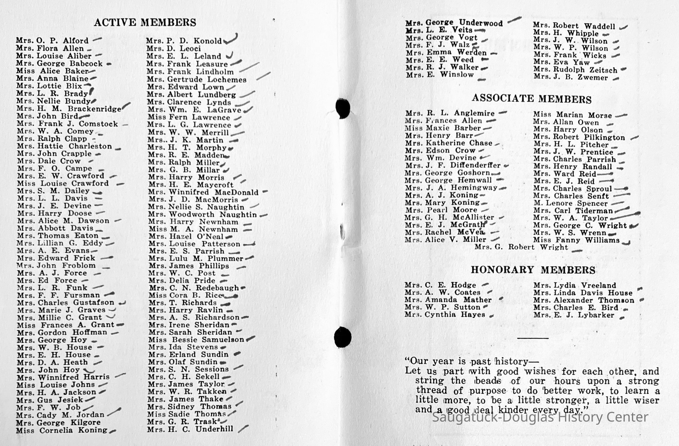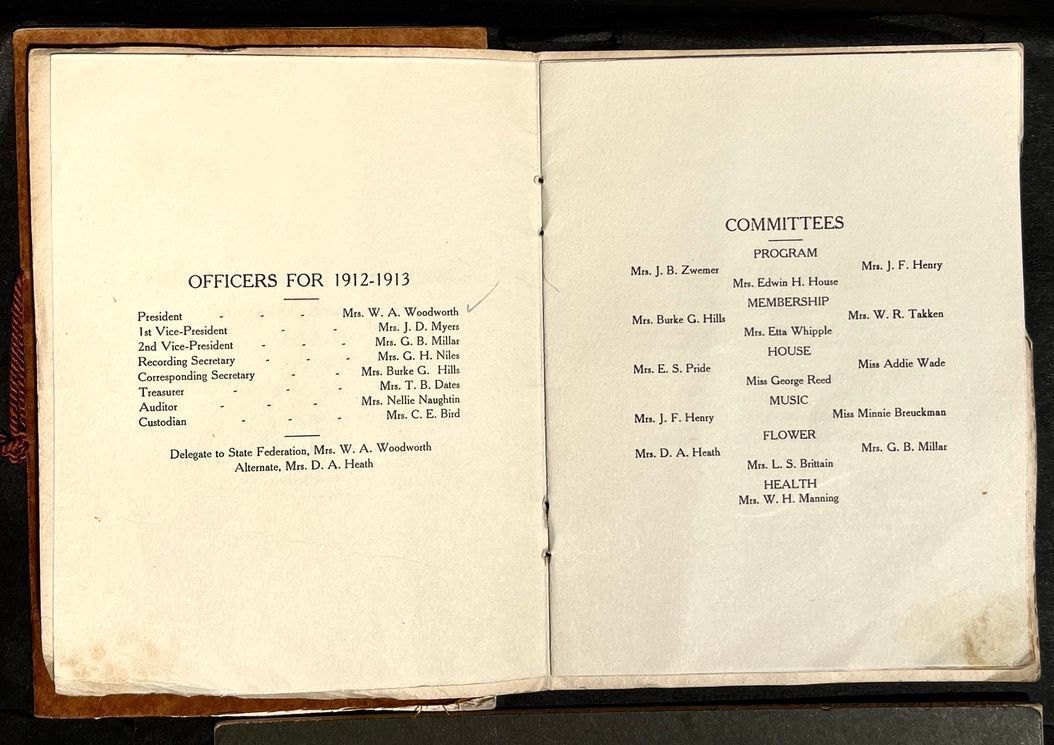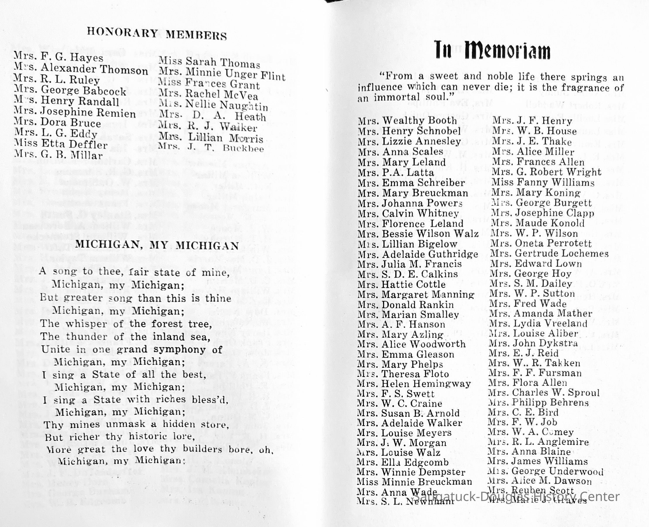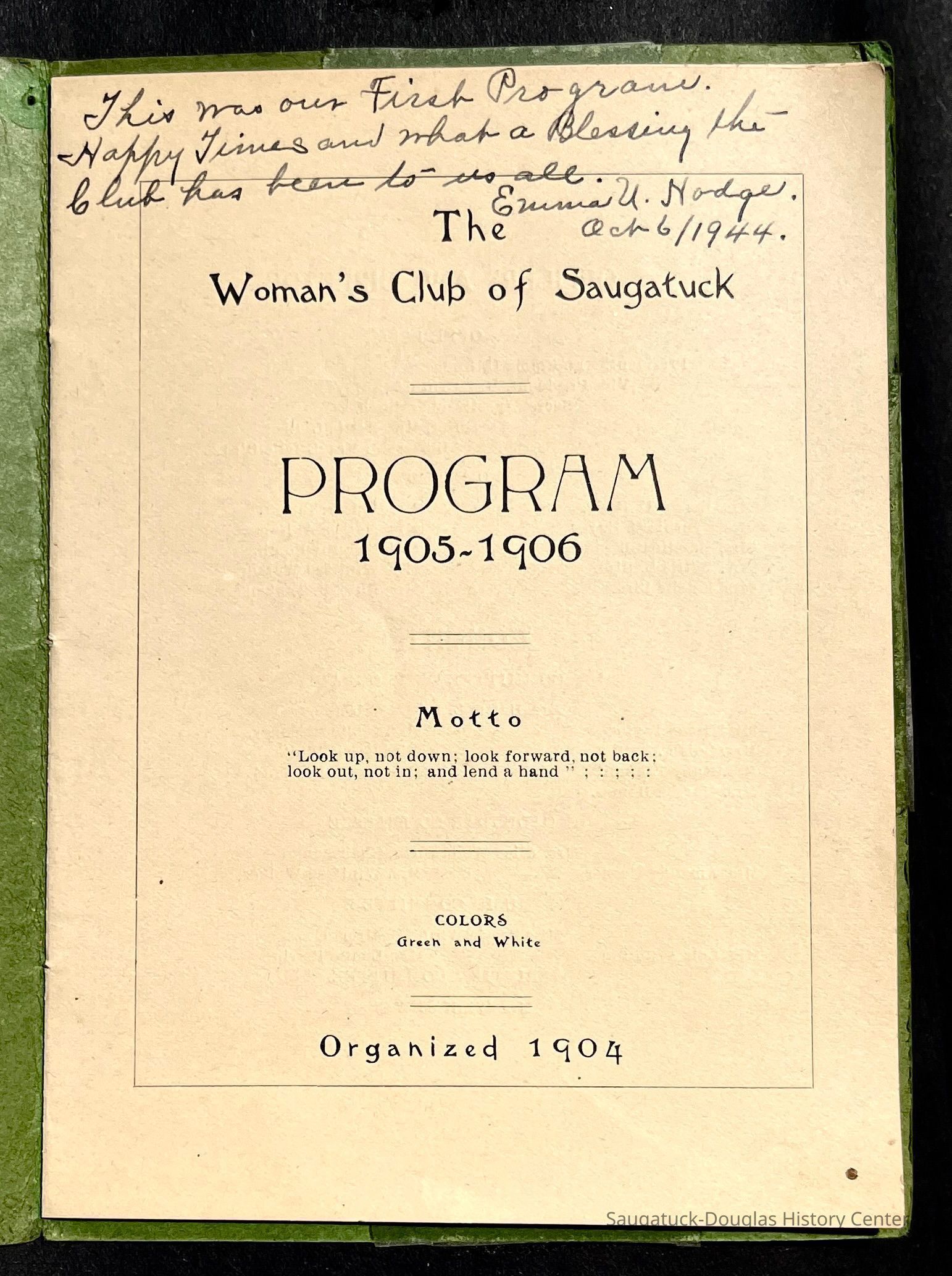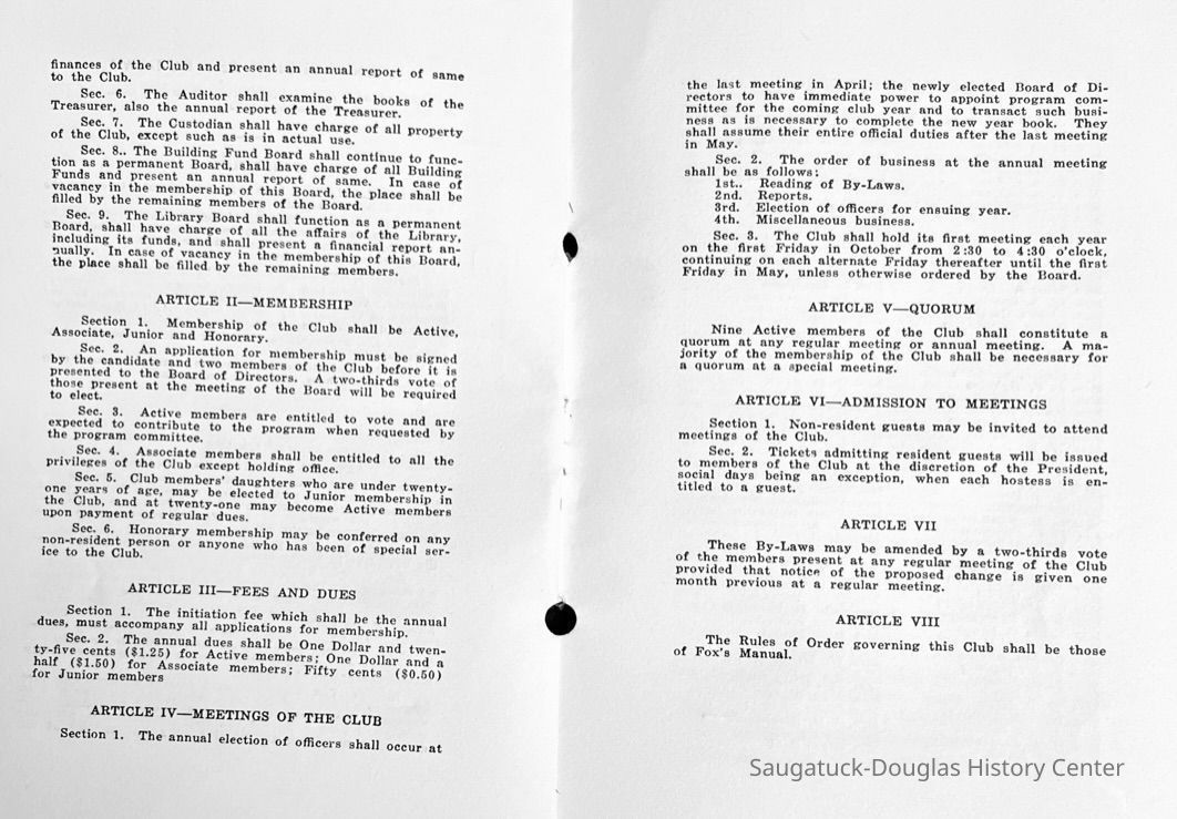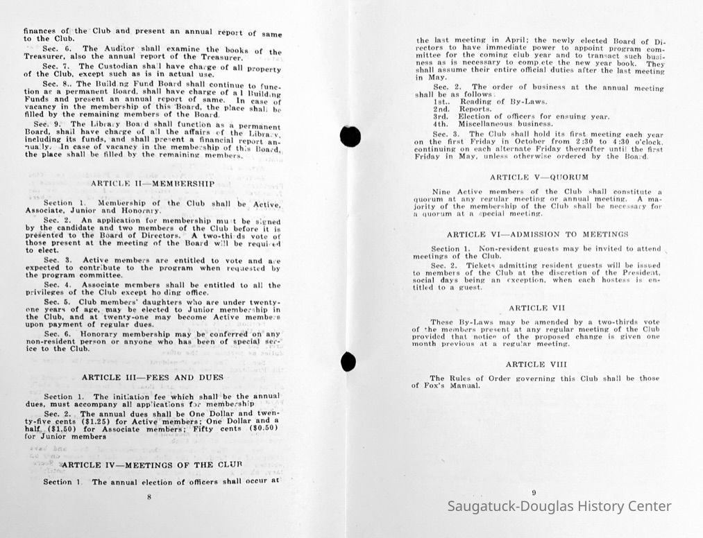 Saugatuck Woman's Club 1904-present, Saugatuck Woman's Club auditorium 1935-present, Heath, May (Francis) 1873-1961, Bird, Harriet “Hattie” Louise (Moffat) (Wright) 1855-1944, Breuckman, Minnie 1869-1934, Coates, Adella "Della" (Holmes) 1864-1950, Thomson, Jeanette Elvira (Harris) 1862-1956, Fox, Johnson 1918-2009, Hodge, Emma Ursula (Gunzenhauser) 1864-1950, Dailey, Margaret, E. (Calkins) 1866-1940, Zwemer, Saburna G. (Woodworth) 1875-1949, Henry, Isabel (Shore) 1856-1936, Woodworth, Alice C. (Redway) Mather 1848-1930, 439 Butler/Butler Pantry/Wilkins/Koning/Nies Hardware, Allen, Flora Elizabeth (Sprang) 1863-1943, Walker, Adelaide Elizabeth (Wade) 1885-1932, Goshorn, Hattie Louise (DePuy) 1874-1953, House, Celia Martin (Gamble) (1890-1976), Millar, Nellie Grant (Raymond) 1861-1956, Jackson, Rhea Bernice (Allen) 1892-1979, Leland, Ruth F. (Baker) 1878-1949, Comey, Alice Maude (Grant) 1870-1944, Davis, Edna Mae (Gaylord) 1896-1980, Wilson, Grace (Cobb) 1897-1992, Sheridan, Irene (Weible) 1883-1967, Waddell, Sadie R. 1882-1947, Wicks, Caroline Jane "Carrie" (Millar) Stillson 1884-1983, Hoffman, Elizabeth S. "Betty" (Gregory) 1894-1960, Brady, Winifred E. (Randall) 1893-1961, Peirce, Roberta "Bobbie" Margaret (Fredrickson) 1914-2004, Carr, Elsie Virginia (Kaufman) 1906-1997, Bieler or Beler, Mrs. Ernest 1904-1954?, Bainbridge, Marguerite (Holladay) 1888-1974, Edgcomb, Ruth M. (Severance) 1915-1997, Taylor, Mrs. Harold