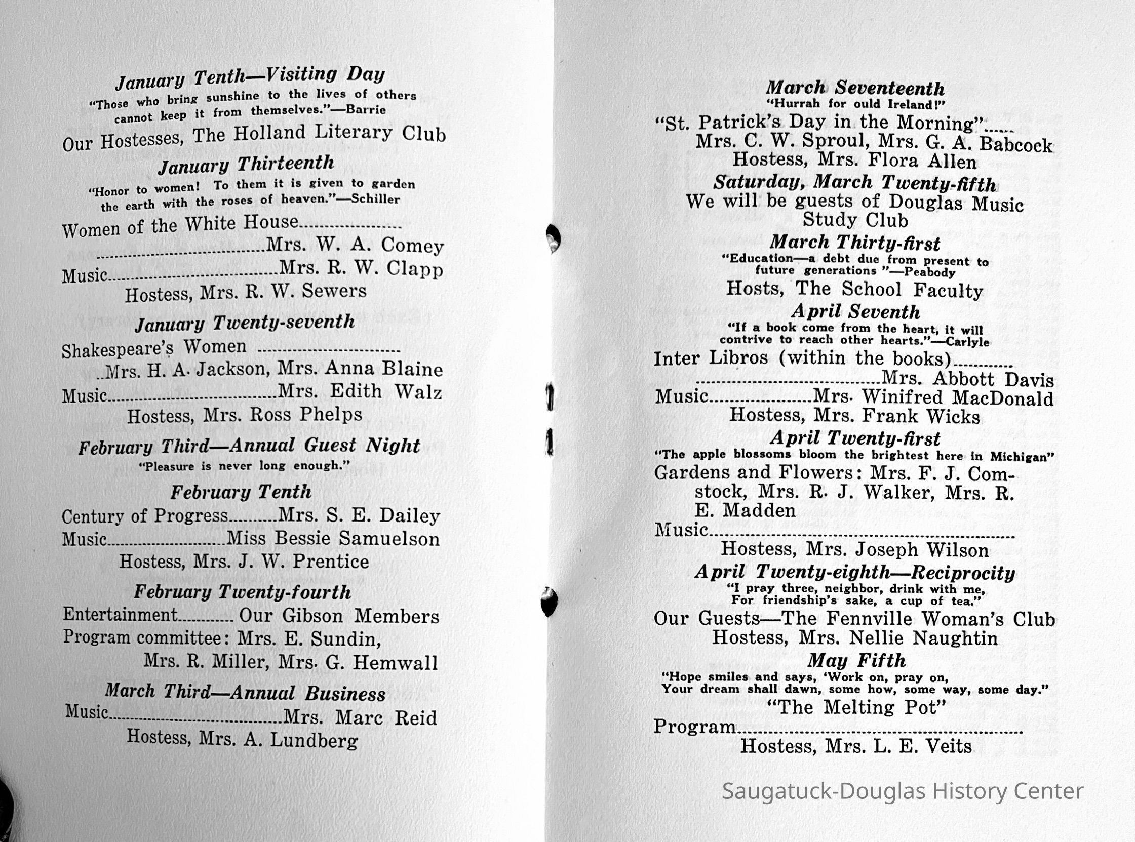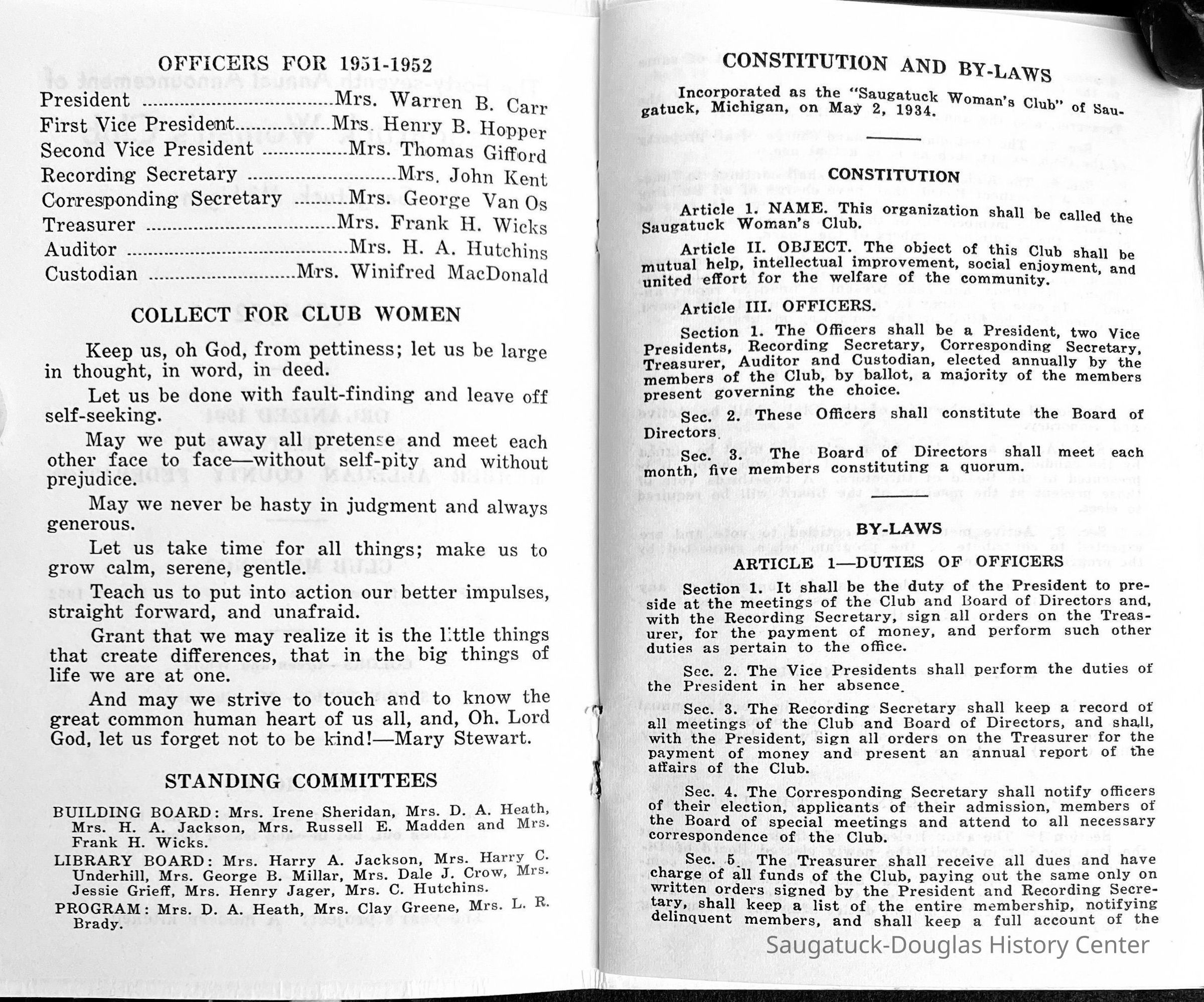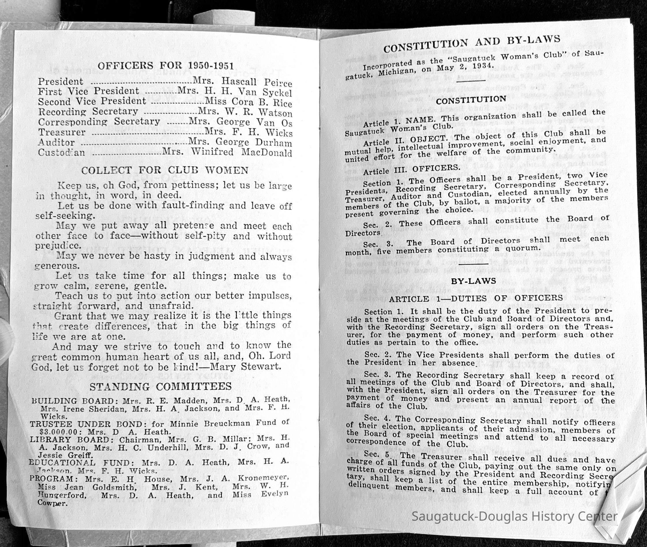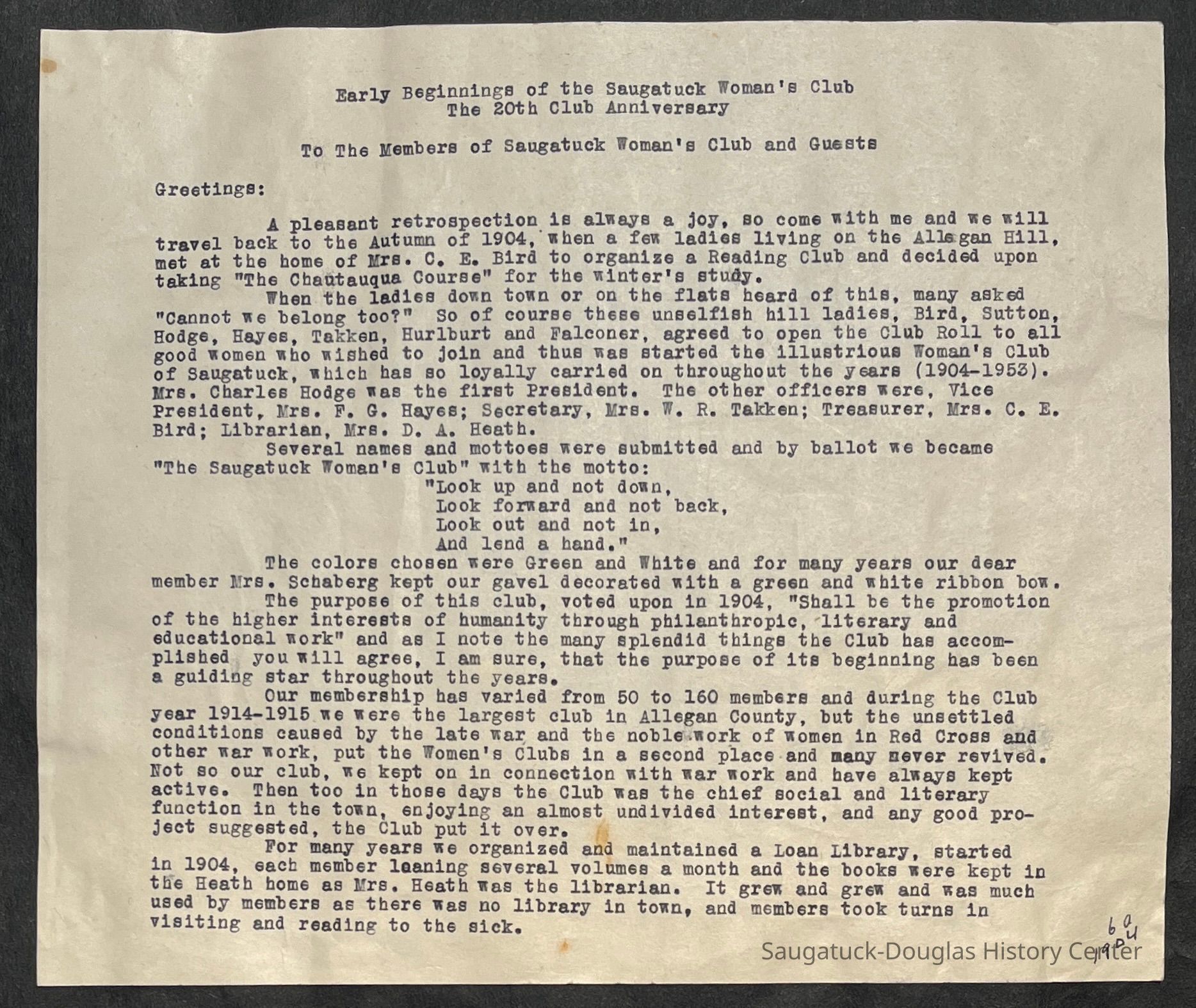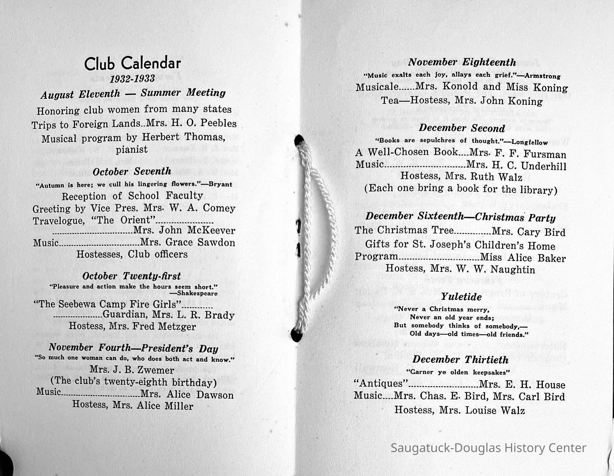 Saugatuck Woman's Club 1904-present, Saugatuck Woman's Club auditorium 1935-present, Heath, May (Francis) 1873-1961, Bird, Harriet “Hattie” Louise (Moffat) (Wright) 1855-1944, Breuckman, Minnie 1869-1934, Coates, Adella "Della" (Holmes) 1864-1950, Thomson, Jeanette Elvira (Harris) 1862-1956, Fox, Johnson 1918-2009, Hodge, Emma Ursula (Gunzenhauser) 1864-1950, Dailey, Margaret, E. (Calkins) 1866-1940, Zwemer, Saburna G. (Woodworth) 1875-1949, Henry, Isabel (Shore) 1856-1936, Woodworth, Alice C. (Redway) Mather 1848-1930, 439 Butler/Butler Pantry/Wilkins/Koning/Nies Hardware, Allen, Flora Elizabeth (Sprang) 1863-1943, Walker, Adelaide Elizabeth (Wade) 1885-1932, Goshorn, Hattie Louise (DePuy) 1874-1953, House, Celia Martin (Gamble) (1890-1976), Millar, Nellie Grant (Raymond) 1861-1956, Jackson, Rhea Bernice (Allen) 1892-1979, Leland, Ruth F. (Baker) 1878-1949, Comey, Alice Maude (Grant) 1870-1944, Davis, Edna Mae (Gaylord) 1896-1980, Wilson, Grace (Cobb) 1897-1992, Sheridan, Irene (Weible) 1883-1967, Waddell, Sadie R. 1882-1947, Wicks, Caroline Jane "Carrie" (Millar) Stillson 1884-1983, Hoffman, Elizabeth S. "Betty" (Gregory) 1894-1960, Brady, Winifred E. (Randall) 1893-1961, Peirce, Roberta "Bobbie" Margaret (Fredrickson) 1914-2004, Carr, Elsie Virginia (Kaufman) 1906-1997, Bieler or Beler, Mrs. Ernest 1904-1954?, Bainbridge, Marguerite (Holladay) 1888-1974, Edgcomb, Ruth M. (Severance) 1915-1997, Taylor, Mrs. Harold
