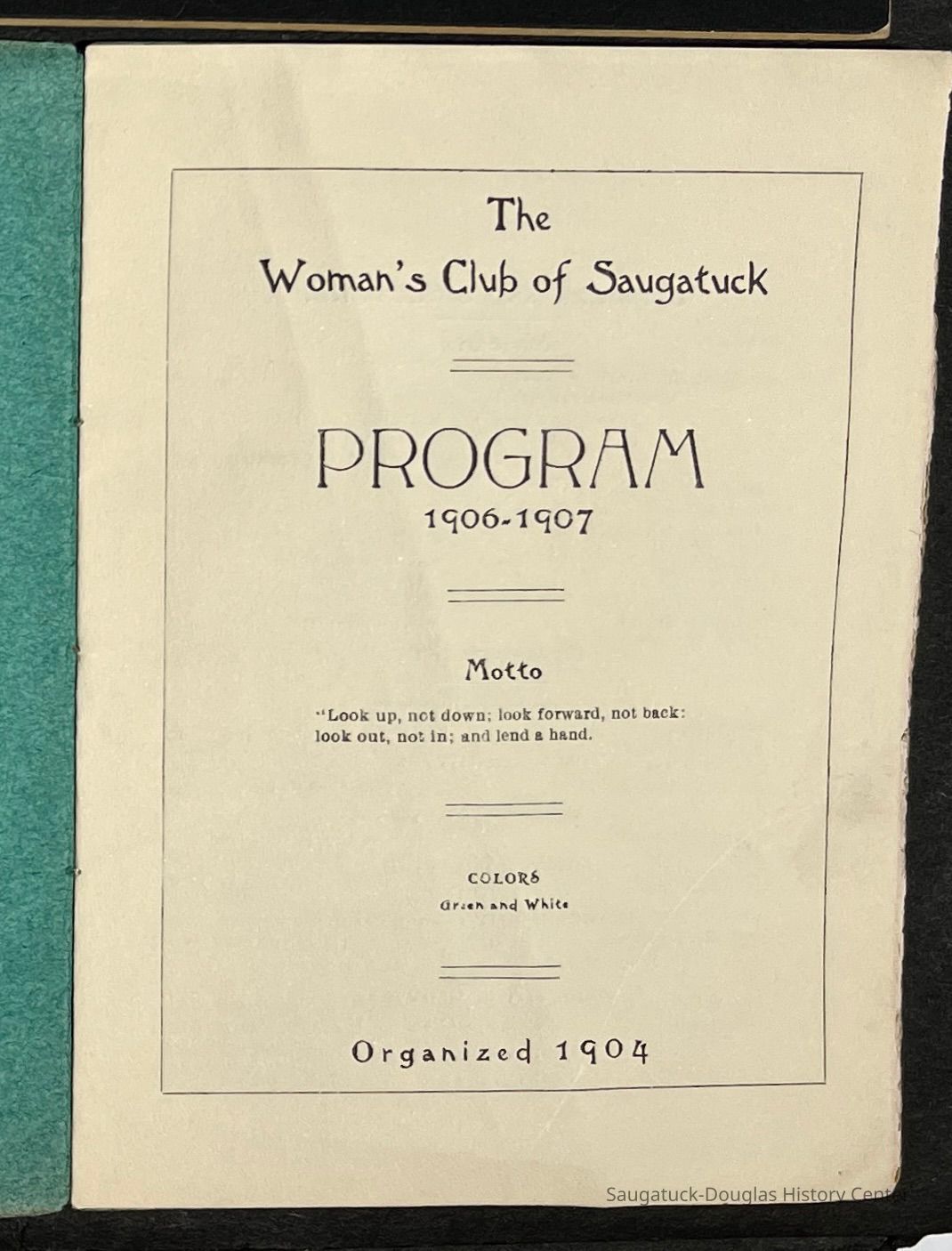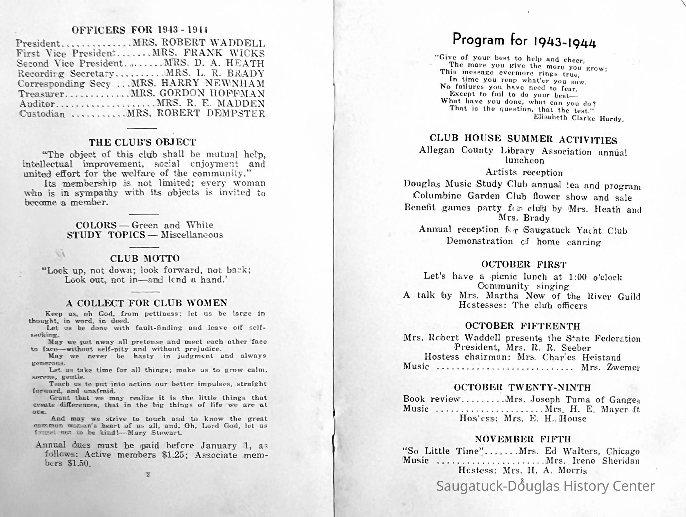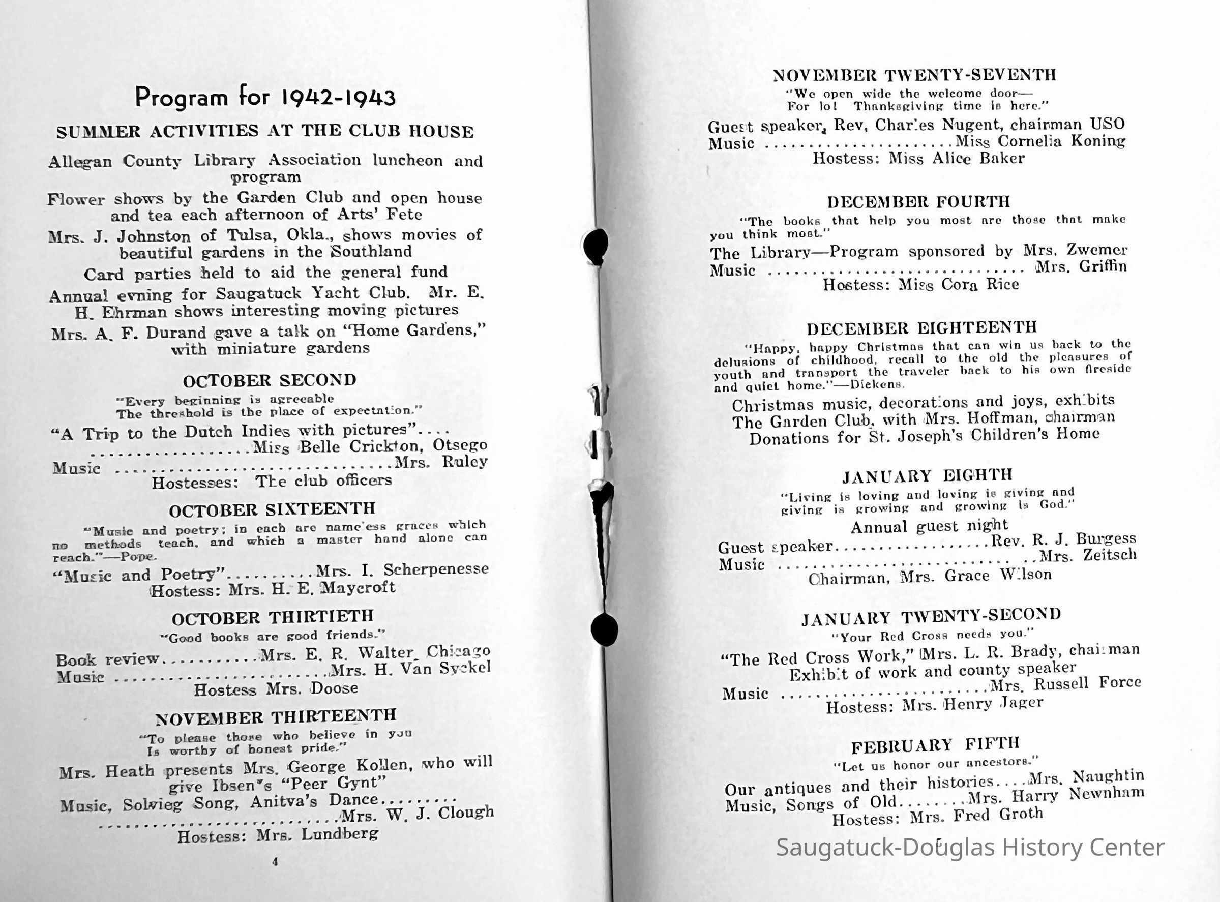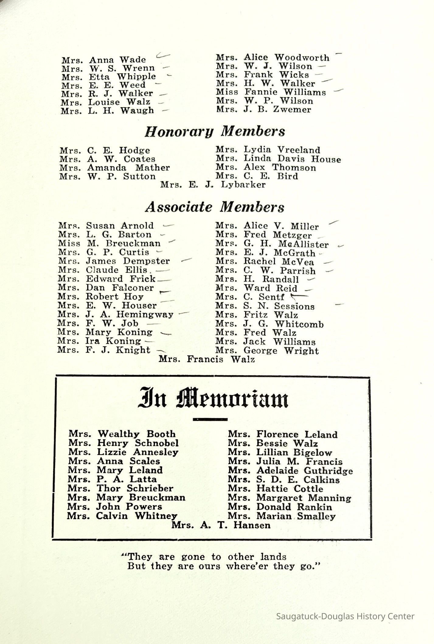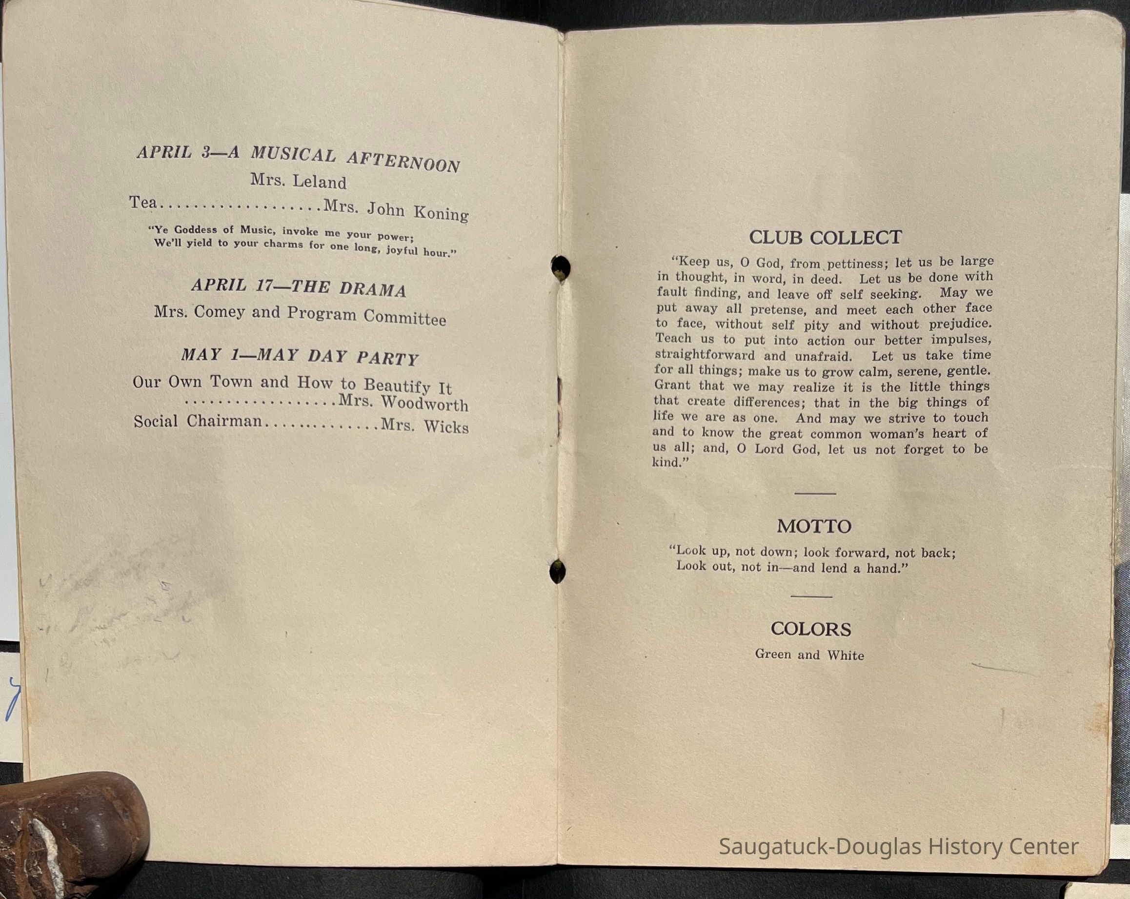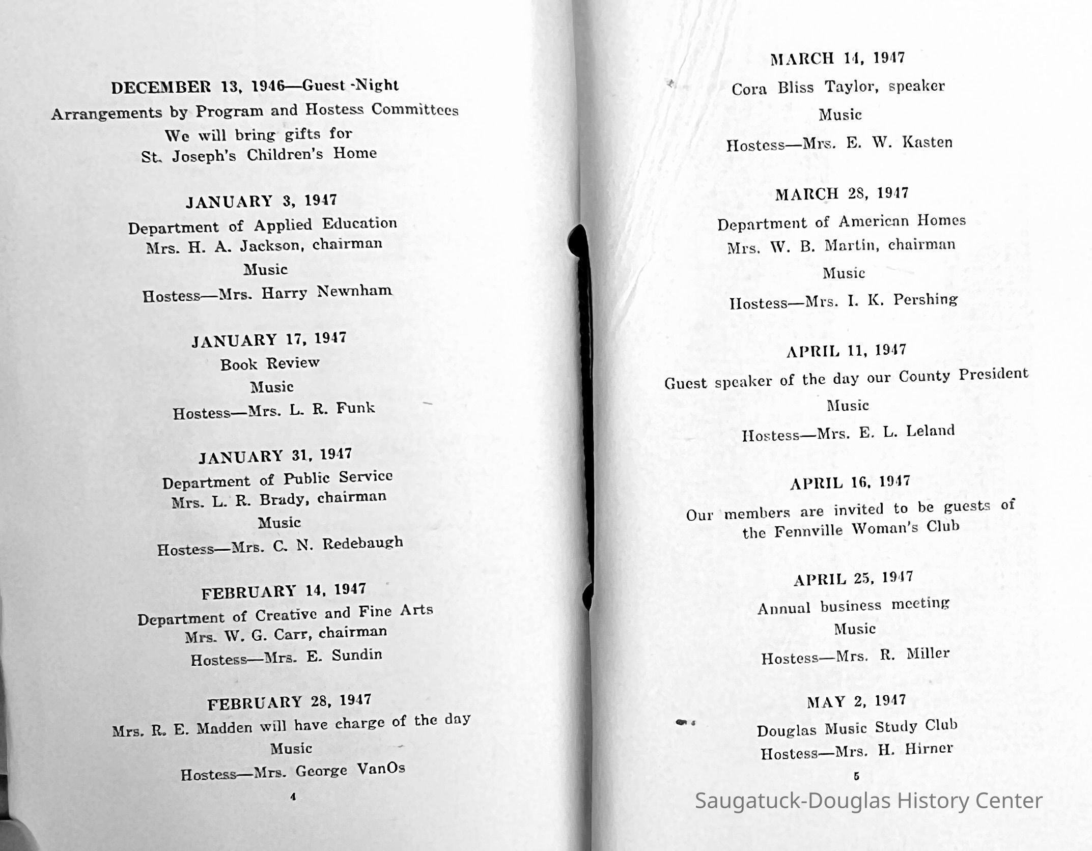 Saugatuck Woman's Club 1904-present, Saugatuck Woman's Club auditorium 1935-present, Heath, May (Francis) 1873-1961, Bird, Harriet “Hattie” Louise (Moffat) (Wright) 1855-1944, Breuckman, Minnie 1869-1934, Coates, Adella "Della" (Holmes) 1864-1950, Thomson, Jeanette Elvira (Harris) 1862-1956, Fox, Johnson 1918-2009, Hodge, Emma Ursula (Gunzenhauser) 1864-1950, Dailey, Margaret, E. (Calkins) 1866-1940, Zwemer, Saburna G. (Woodworth) 1875-1949, Henry, Isabel (Shore) 1856-1936, Woodworth, Alice C. (Redway) Mather 1848-1930, 439 Butler/Butler Pantry/Wilkins/Koning/Nies Hardware, Allen, Flora Elizabeth (Sprang) 1863-1943, Walker, Adelaide Elizabeth (Wade) 1885-1932, Goshorn, Hattie Louise (DePuy) 1874-1953, House, Celia Martin (Gamble) (1890-1976), Millar, Nellie Grant (Raymond) 1861-1956, Jackson, Rhea Bernice (Allen) 1892-1979, Leland, Ruth F. (Baker) 1878-1949, Comey, Alice Maude (Grant) 1870-1944, Davis, Edna Mae (Gaylord) 1896-1980, Wilson, Grace (Cobb) 1897-1992, Sheridan, Irene (Weible) 1883-1967, Waddell, Sadie R. 1882-1947, Wicks, Caroline Jane "Carrie" (Millar) Stillson 1884-1983, Hoffman, Elizabeth S. "Betty" (Gregory) 1894-1960, Brady, Winifred E. (Randall) 1893-1961, Peirce, Roberta "Bobbie" Margaret (Fredrickson) 1914-2004, Carr, Elsie Virginia (Kaufman) 1906-1997, Bieler or Beler, Mrs. Ernest 1904-1954?, Bainbridge, Marguerite (Holladay) 1888-1974, Edgcomb, Ruth M. (Severance) 1915-1997, Taylor, Mrs. Harold
