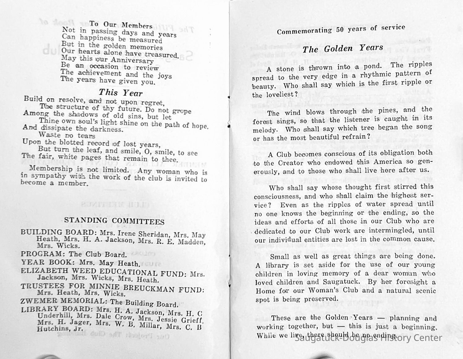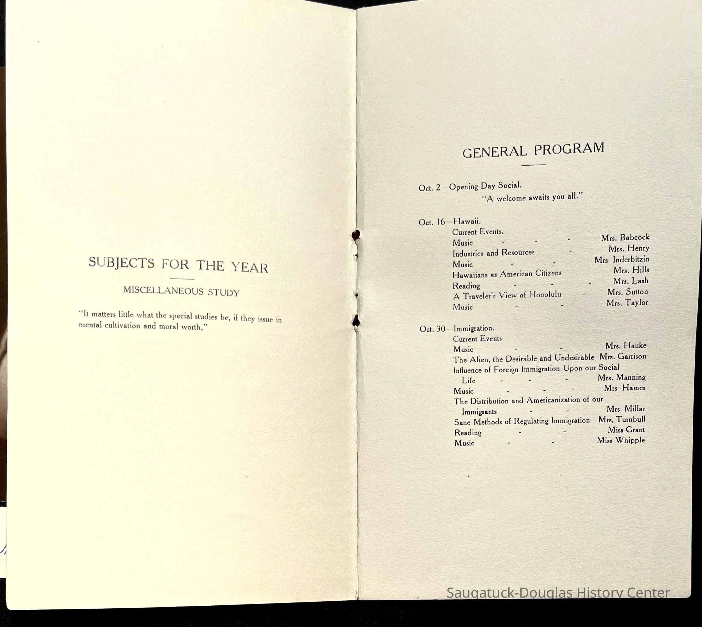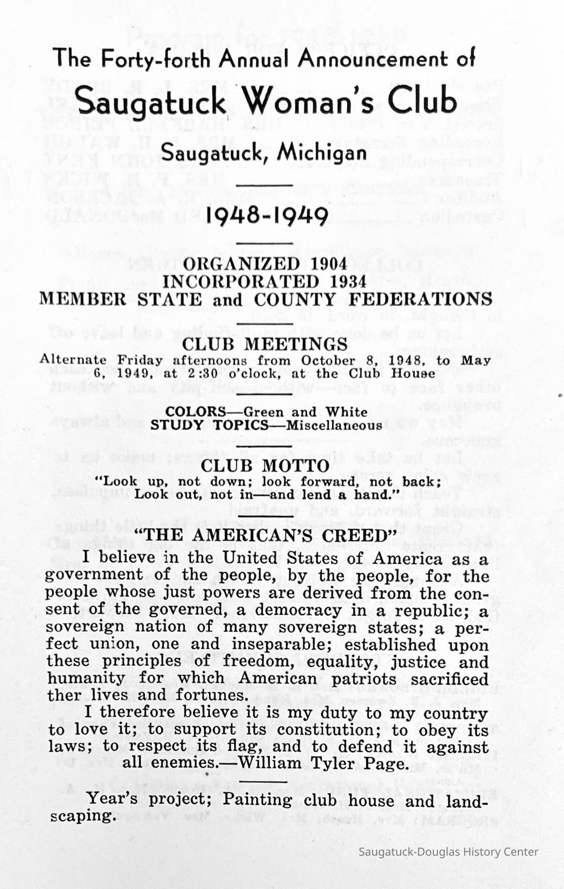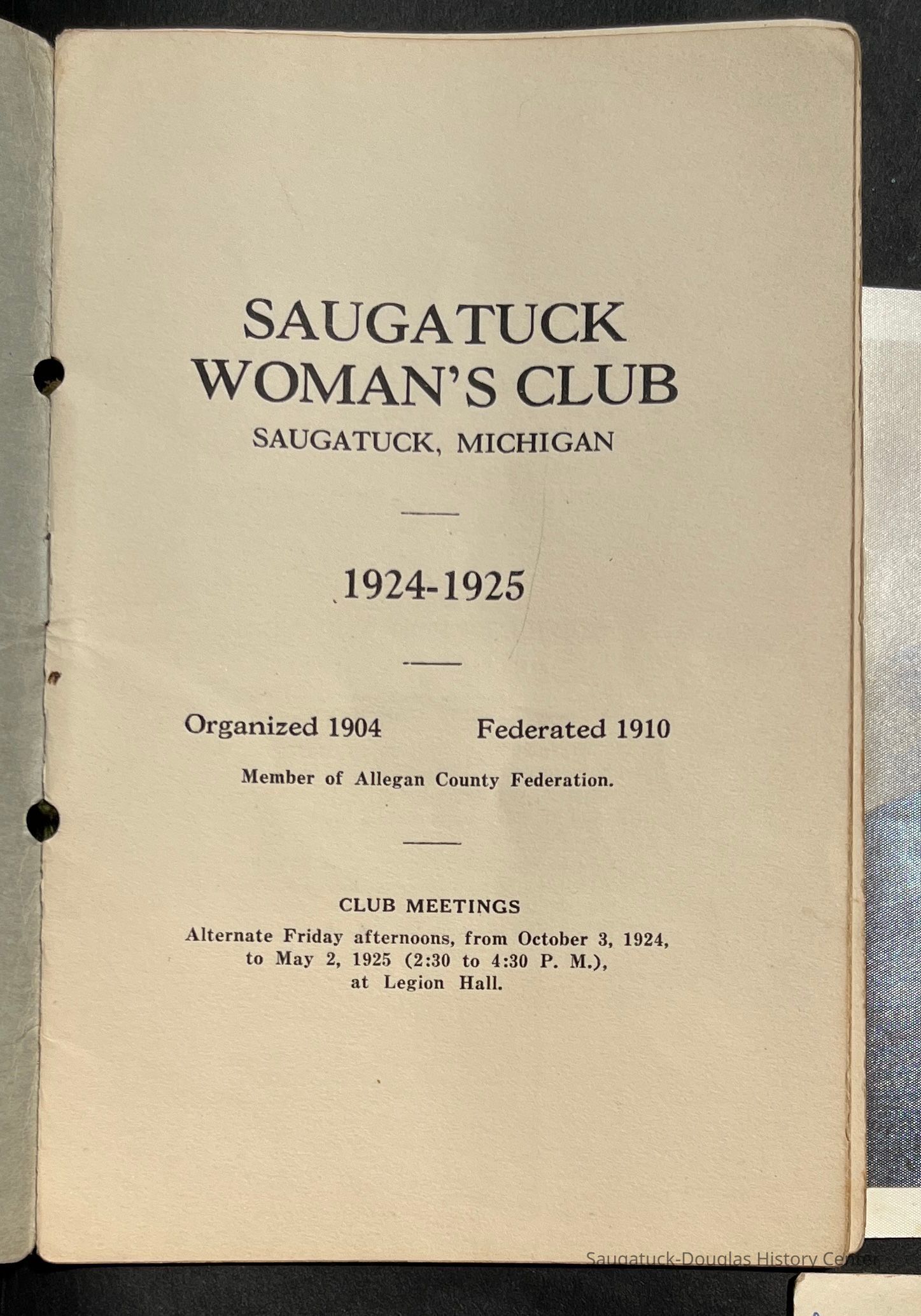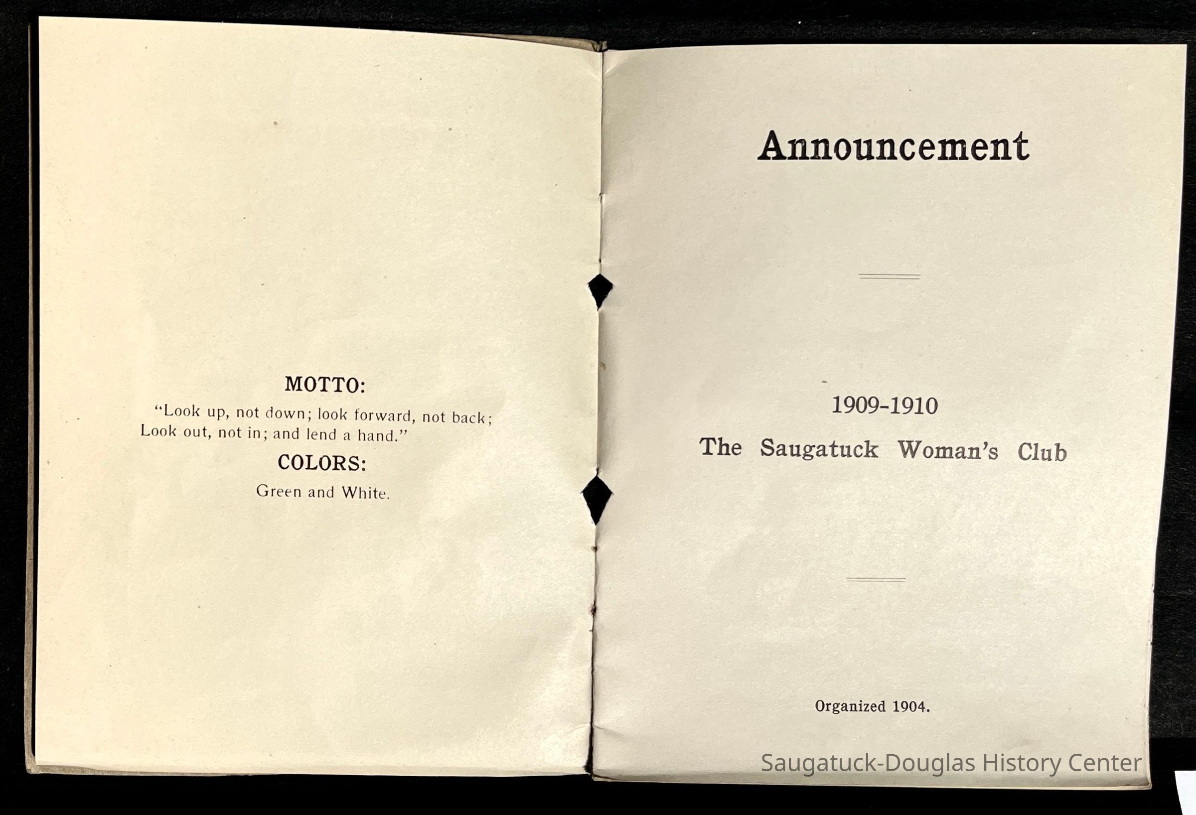 Saugatuck Woman's Club 1904-present, Saugatuck Woman's Club auditorium 1935-present, Heath, May (Francis) 1873-1961, Bird, Harriet “Hattie” Louise (Moffat) (Wright) 1855-1944, Breuckman, Minnie 1869-1934, Coates, Adella "Della" (Holmes) 1864-1950, Thomson, Jeanette Elvira (Harris) 1862-1956, Fox, Johnson 1918-2009, Hodge, Emma Ursula (Gunzenhauser) 1864-1950, Dailey, Margaret, E. (Calkins) 1866-1940, Zwemer, Saburna G. (Woodworth) 1875-1949, Henry, Isabel (Shore) 1856-1936, Woodworth, Alice C. (Redway) Mather 1848-1930, 439 Butler/Butler Pantry/Wilkins/Koning/Nies Hardware, Allen, Flora Elizabeth (Sprang) 1863-1943, Walker, Adelaide Elizabeth (Wade) 1885-1932, Goshorn, Hattie Louise (DePuy) 1874-1953, House, Celia Martin (Gamble) (1890-1976), Millar, Nellie Grant (Raymond) 1861-1956, Jackson, Rhea Bernice (Allen) 1892-1979, Leland, Ruth F. (Baker) 1878-1949, Comey, Alice Maude (Grant) 1870-1944, Davis, Edna Mae (Gaylord) 1896-1980, Wilson, Grace (Cobb) 1897-1992, Sheridan, Irene (Weible) 1883-1967, Waddell, Sadie R. 1882-1947, Wicks, Caroline Jane "Carrie" (Millar) Stillson 1884-1983, Hoffman, Elizabeth S. "Betty" (Gregory) 1894-1960, Brady, Winifred E. (Randall) 1893-1961, Peirce, Roberta "Bobbie" Margaret (Fredrickson) 1914-2004, Carr, Elsie Virginia (Kaufman) 1906-1997, Bieler or Beler, Mrs. Ernest 1904-1954?, Bainbridge, Marguerite (Holladay) 1888-1974, Edgcomb, Ruth M. (Severance) 1915-1997, Taylor, Mrs. Harold