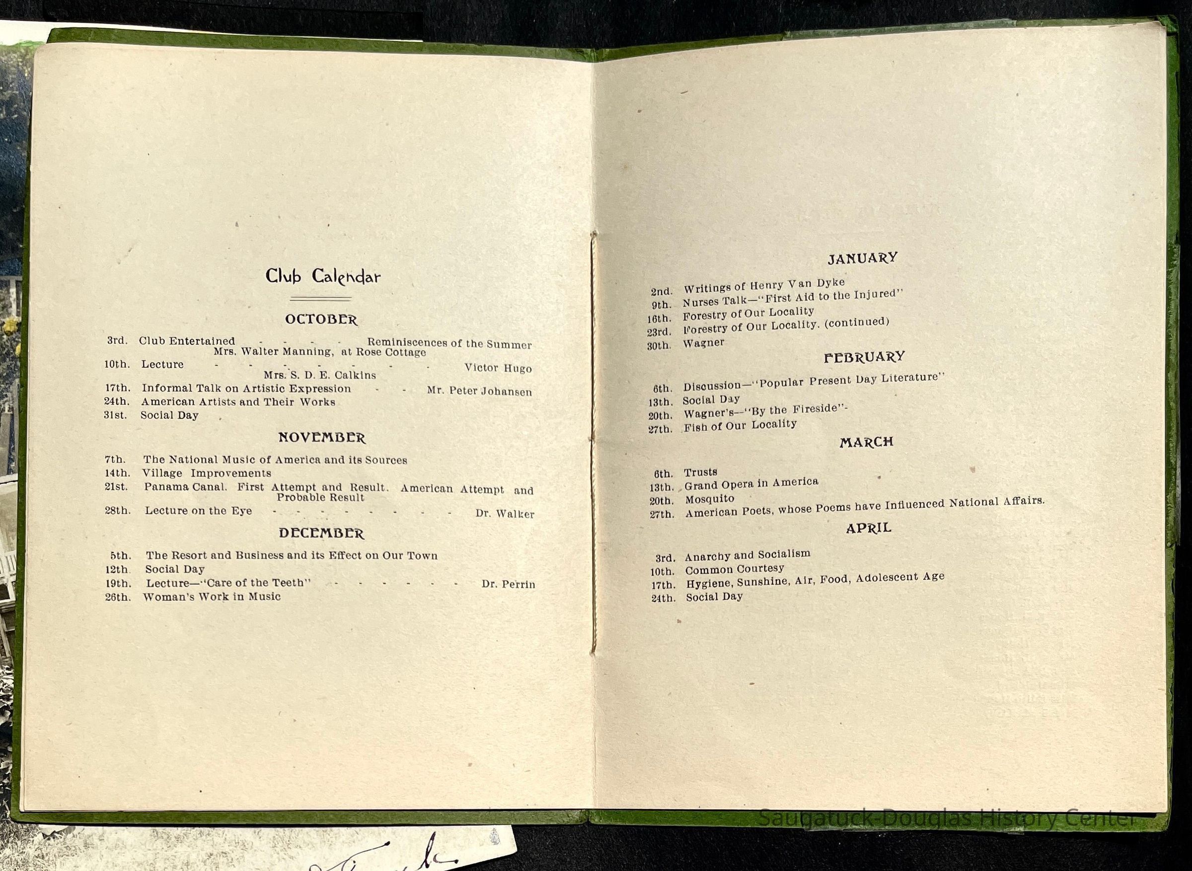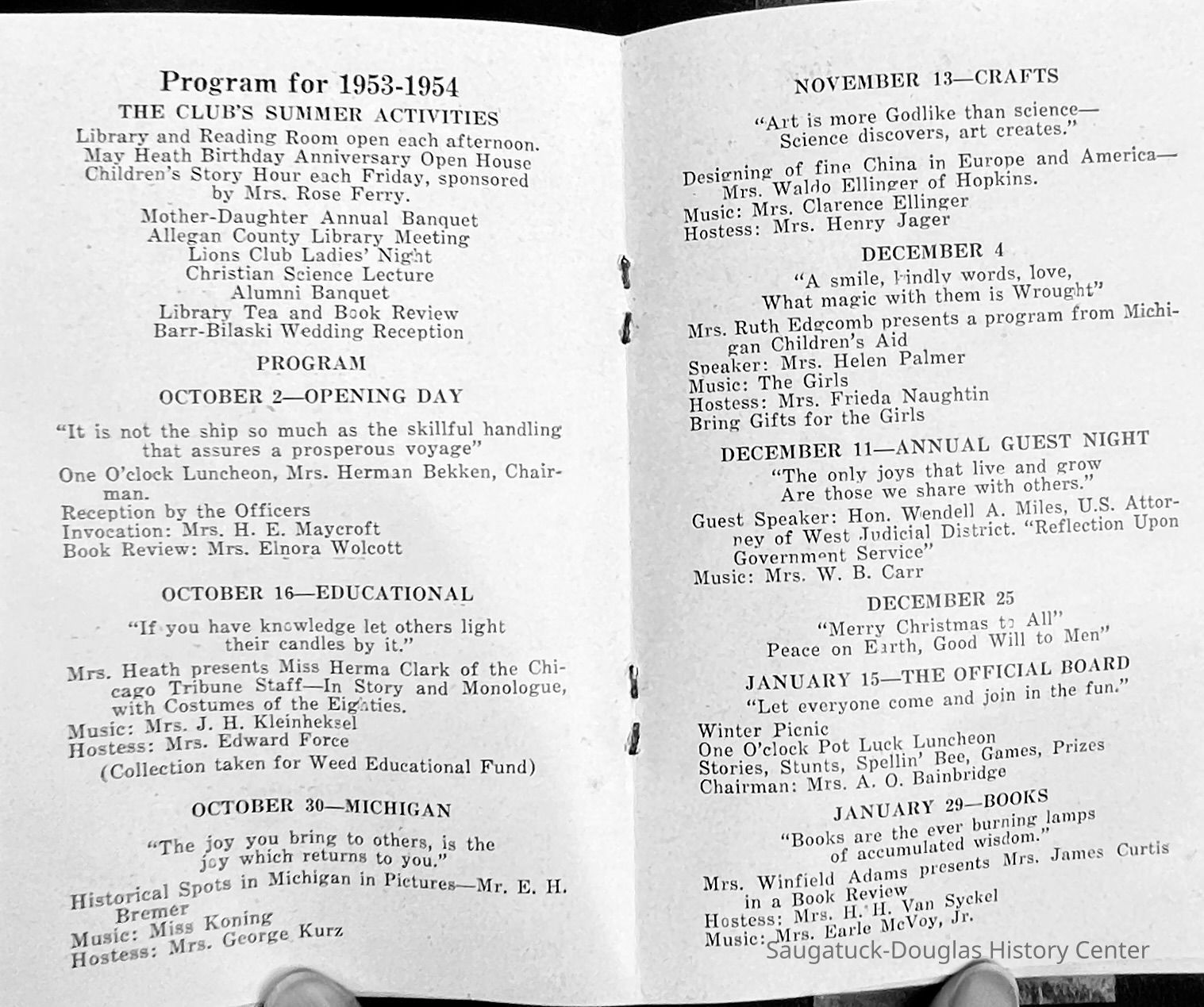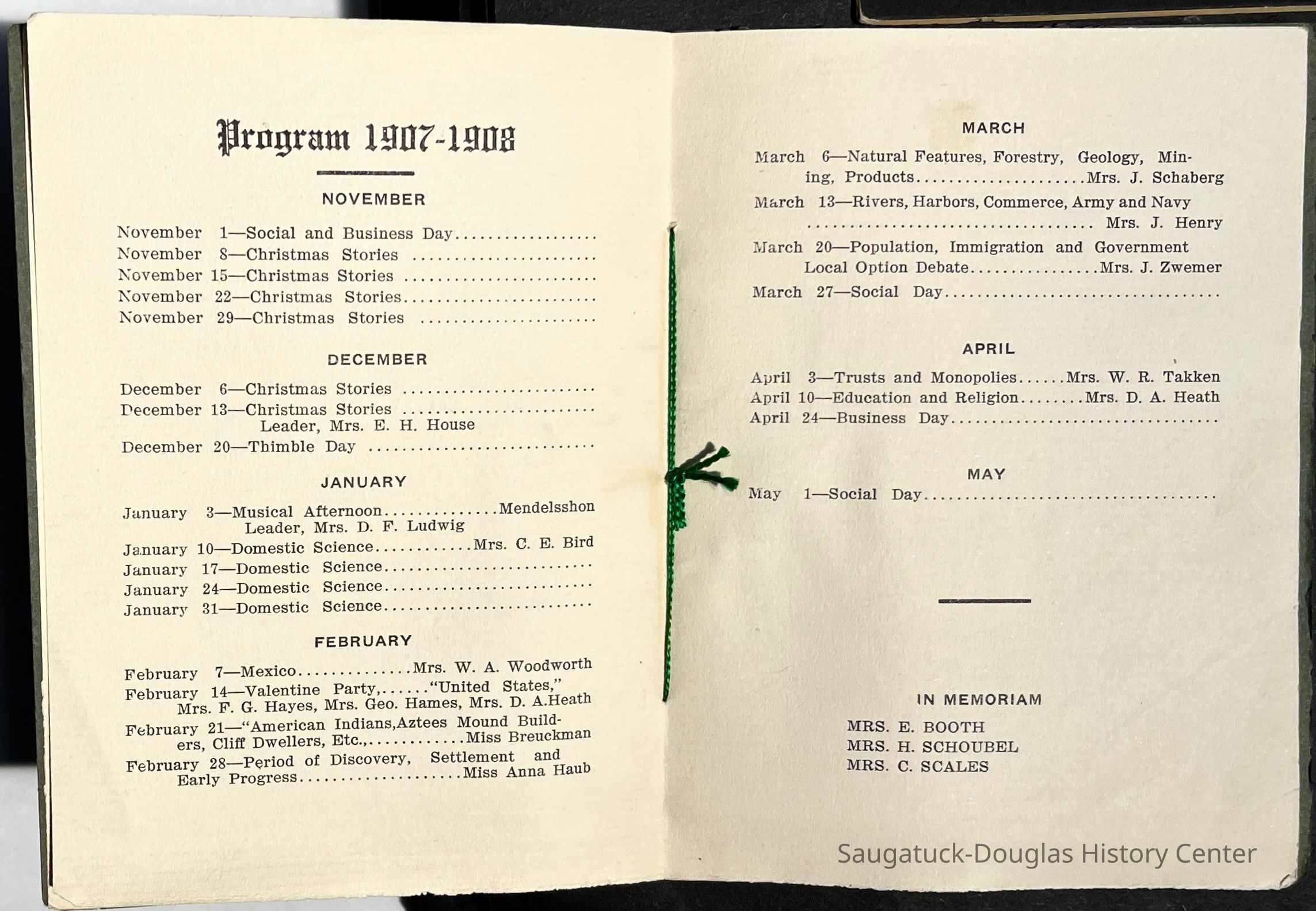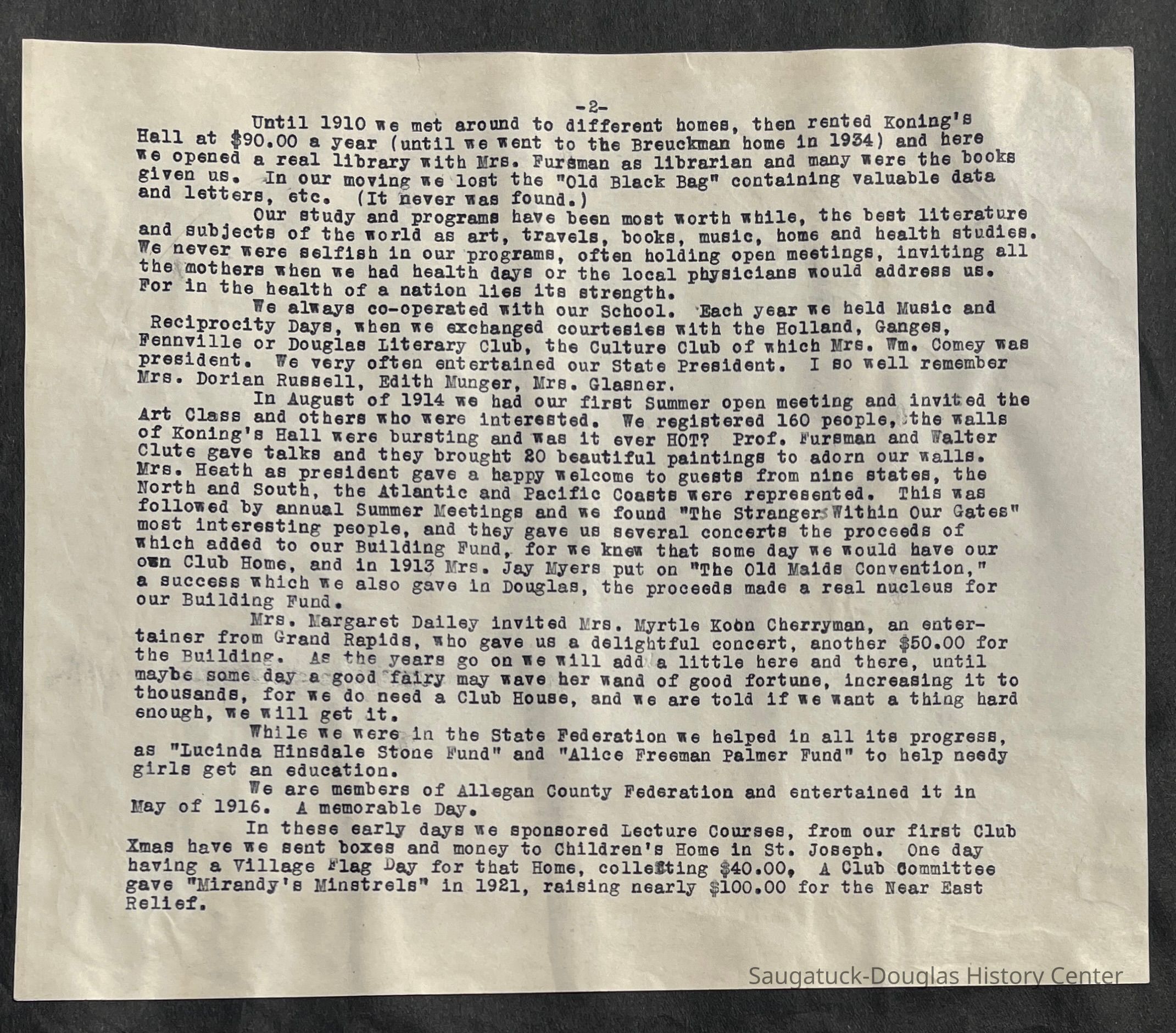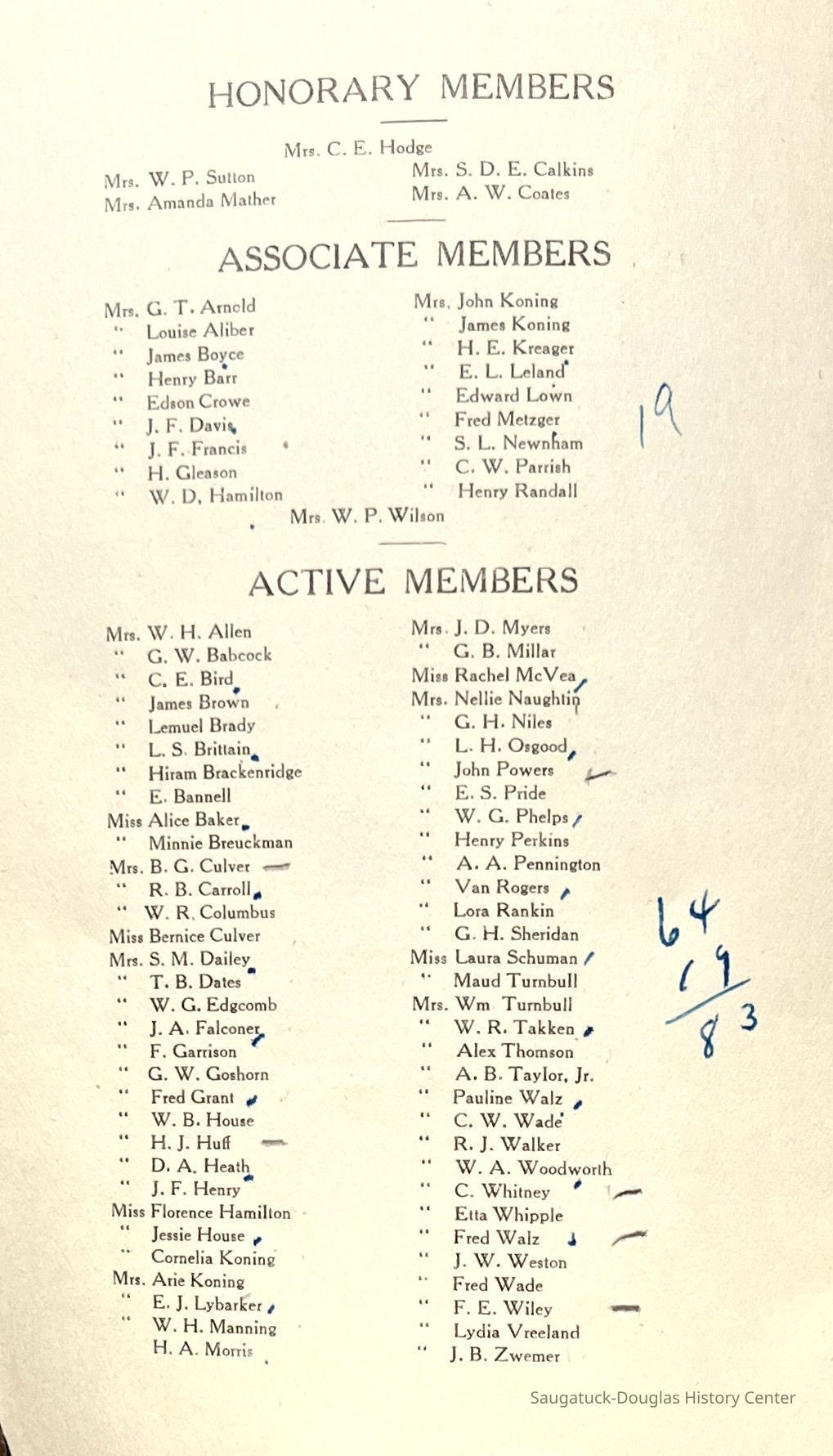 Saugatuck Woman's Club 1904-present, Saugatuck Woman's Club auditorium 1935-present, Heath, May (Francis) 1873-1961, Bird, Harriet “Hattie” Louise (Moffat) (Wright) 1855-1944, Breuckman, Minnie 1869-1934, Coates, Adella "Della" (Holmes) 1864-1950, Thomson, Jeanette Elvira (Harris) 1862-1956, Fox, Johnson 1918-2009, Hodge, Emma Ursula (Gunzenhauser) 1864-1950, Dailey, Margaret, E. (Calkins) 1866-1940, Zwemer, Saburna G. (Woodworth) 1875-1949, Henry, Isabel (Shore) 1856-1936, Woodworth, Alice C. (Redway) Mather 1848-1930, 439 Butler/Butler Pantry/Wilkins/Koning/Nies Hardware, Allen, Flora Elizabeth (Sprang) 1863-1943, Walker, Adelaide Elizabeth (Wade) 1885-1932, Goshorn, Hattie Louise (DePuy) 1874-1953, House, Celia Martin (Gamble) (1890-1976), Millar, Nellie Grant (Raymond) 1861-1956, Jackson, Rhea Bernice (Allen) 1892-1979, Leland, Ruth F. (Baker) 1878-1949, Comey, Alice Maude (Grant) 1870-1944, Davis, Edna Mae (Gaylord) 1896-1980, Wilson, Grace (Cobb) 1897-1992, Sheridan, Irene (Weible) 1883-1967, Waddell, Sadie R. 1882-1947, Wicks, Caroline Jane "Carrie" (Millar) Stillson 1884-1983, Hoffman, Elizabeth S. "Betty" (Gregory) 1894-1960, Brady, Winifred E. (Randall) 1893-1961, Peirce, Roberta "Bobbie" Margaret (Fredrickson) 1914-2004, Carr, Elsie Virginia (Kaufman) 1906-1997, Bieler or Beler, Mrs. Ernest 1904-1954?, Bainbridge, Marguerite (Holladay) 1888-1974, Edgcomb, Ruth M. (Severance) 1915-1997, Taylor, Mrs. Harold