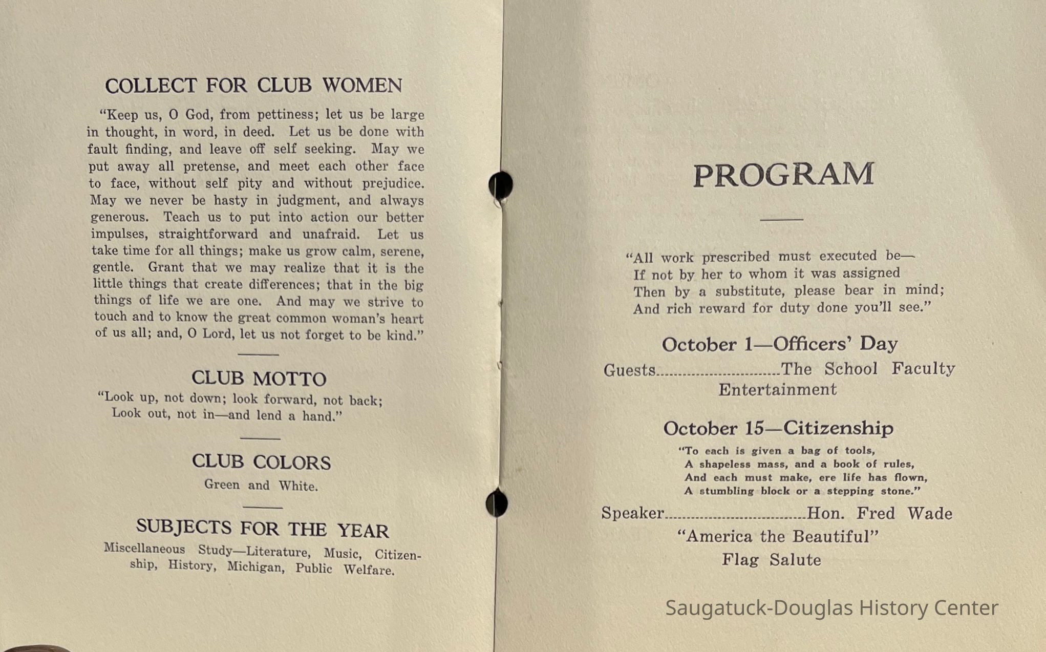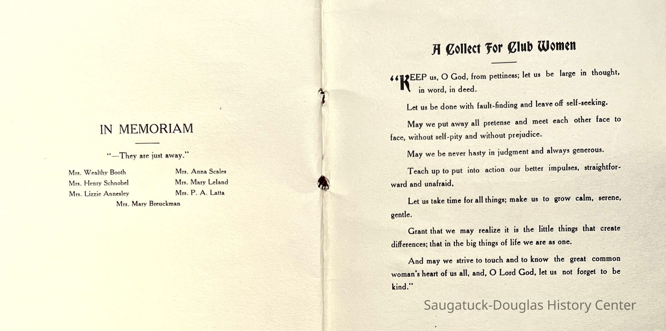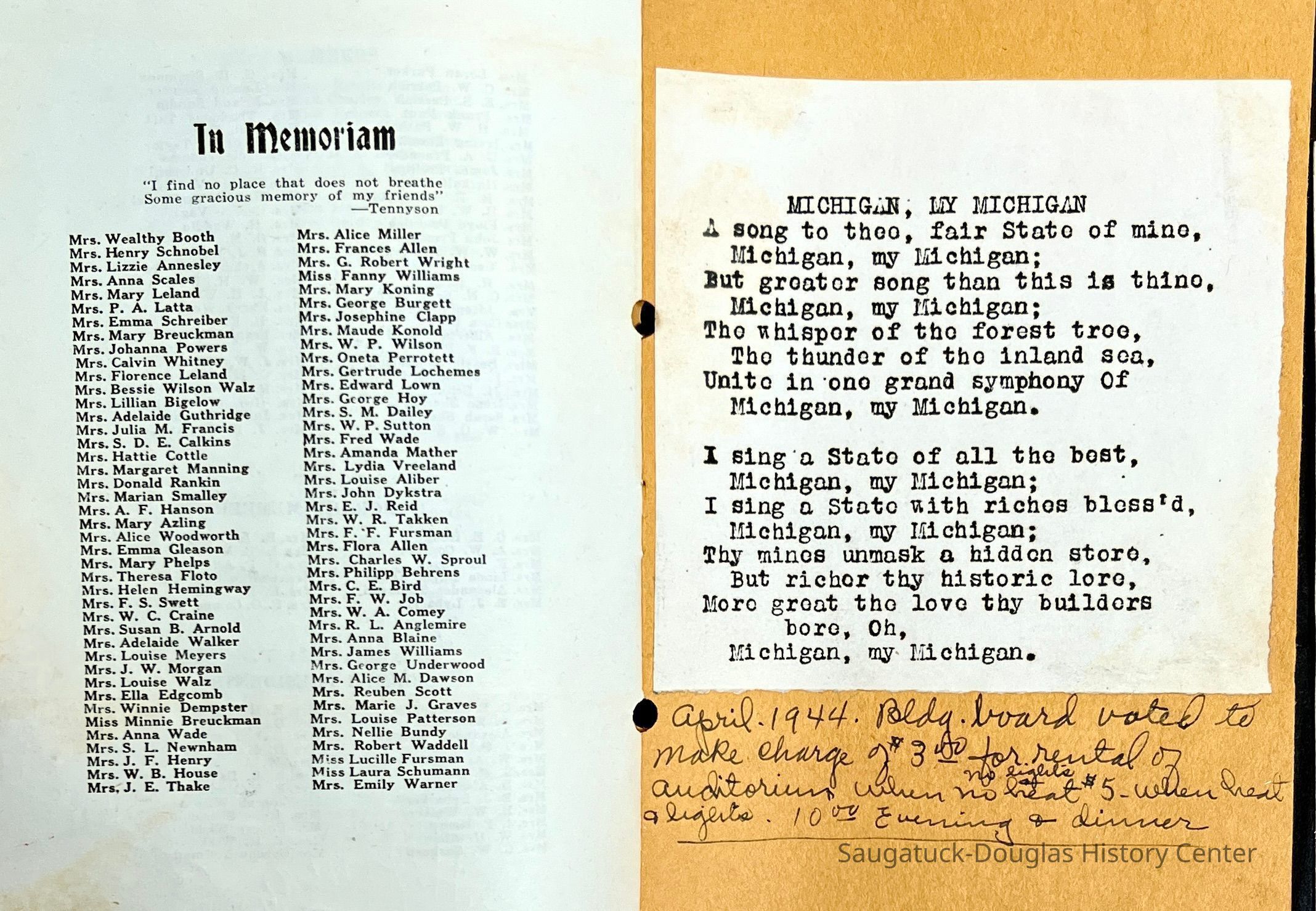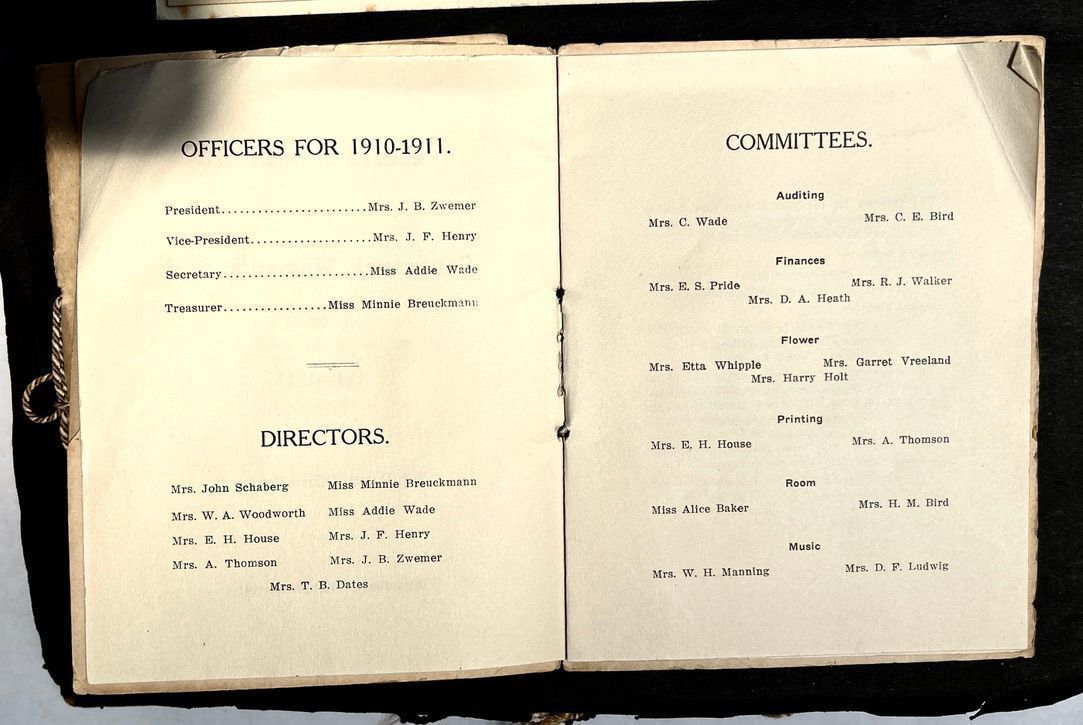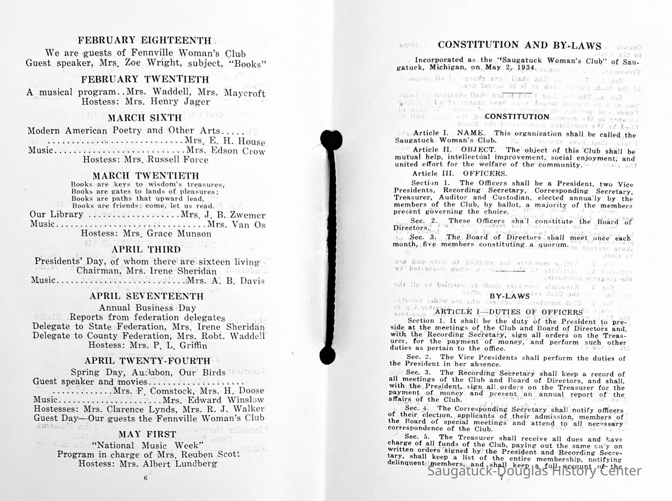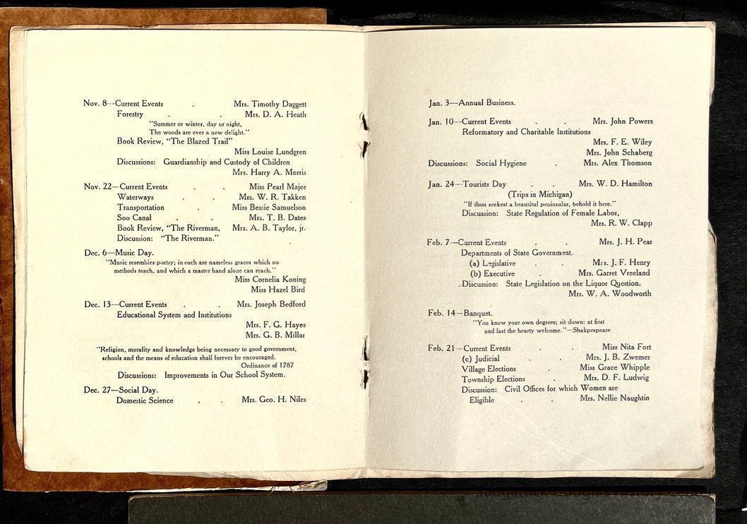 Saugatuck Woman's Club 1904-present, Saugatuck Woman's Club auditorium 1935-present, Heath, May (Francis) 1873-1961, Bird, Harriet “Hattie” Louise (Moffat) (Wright) 1855-1944, Breuckman, Minnie 1869-1934, Coates, Adella "Della" (Holmes) 1864-1950, Thomson, Jeanette Elvira (Harris) 1862-1956, Fox, Johnson 1918-2009, Hodge, Emma Ursula (Gunzenhauser) 1864-1950, Dailey, Margaret, E. (Calkins) 1866-1940, Zwemer, Saburna G. (Woodworth) 1875-1949, Henry, Isabel (Shore) 1856-1936, Woodworth, Alice C. (Redway) Mather 1848-1930, 439 Butler/Butler Pantry/Wilkins/Koning/Nies Hardware, Allen, Flora Elizabeth (Sprang) 1863-1943, Walker, Adelaide Elizabeth (Wade) 1885-1932, Goshorn, Hattie Louise (DePuy) 1874-1953, House, Celia Martin (Gamble) (1890-1976), Millar, Nellie Grant (Raymond) 1861-1956, Jackson, Rhea Bernice (Allen) 1892-1979, Leland, Ruth F. (Baker) 1878-1949, Comey, Alice Maude (Grant) 1870-1944, Davis, Edna Mae (Gaylord) 1896-1980, Wilson, Grace (Cobb) 1897-1992, Sheridan, Irene (Weible) 1883-1967, Waddell, Sadie R. 1882-1947, Wicks, Caroline Jane "Carrie" (Millar) Stillson 1884-1983, Hoffman, Elizabeth S. "Betty" (Gregory) 1894-1960, Brady, Winifred E. (Randall) 1893-1961, Peirce, Roberta "Bobbie" Margaret (Fredrickson) 1914-2004, Carr, Elsie Virginia (Kaufman) 1906-1997, Bieler or Beler, Mrs. Ernest 1904-1954?, Bainbridge, Marguerite (Holladay) 1888-1974, Edgcomb, Ruth M. (Severance) 1915-1997, Taylor, Mrs. Harold