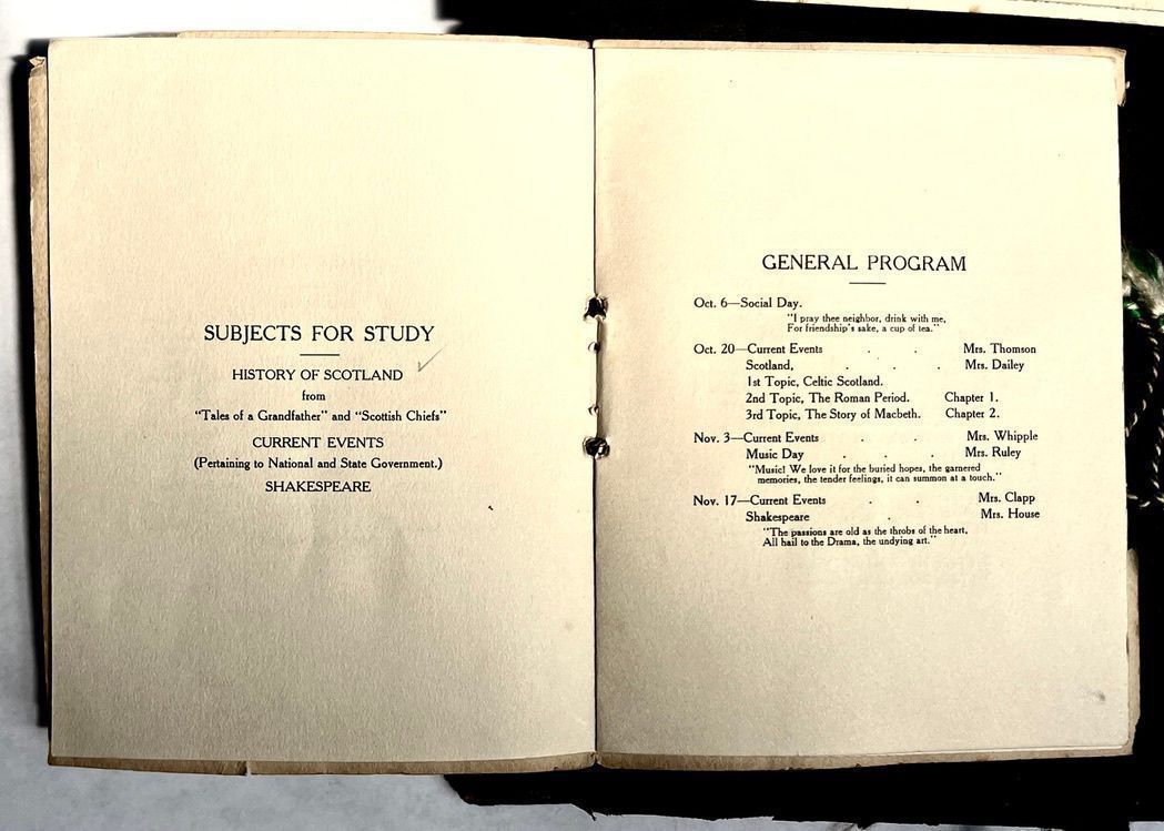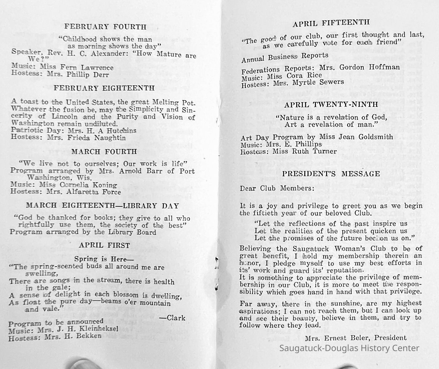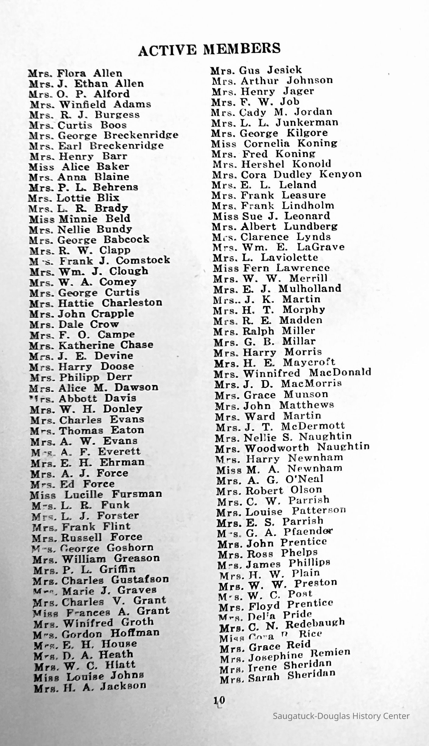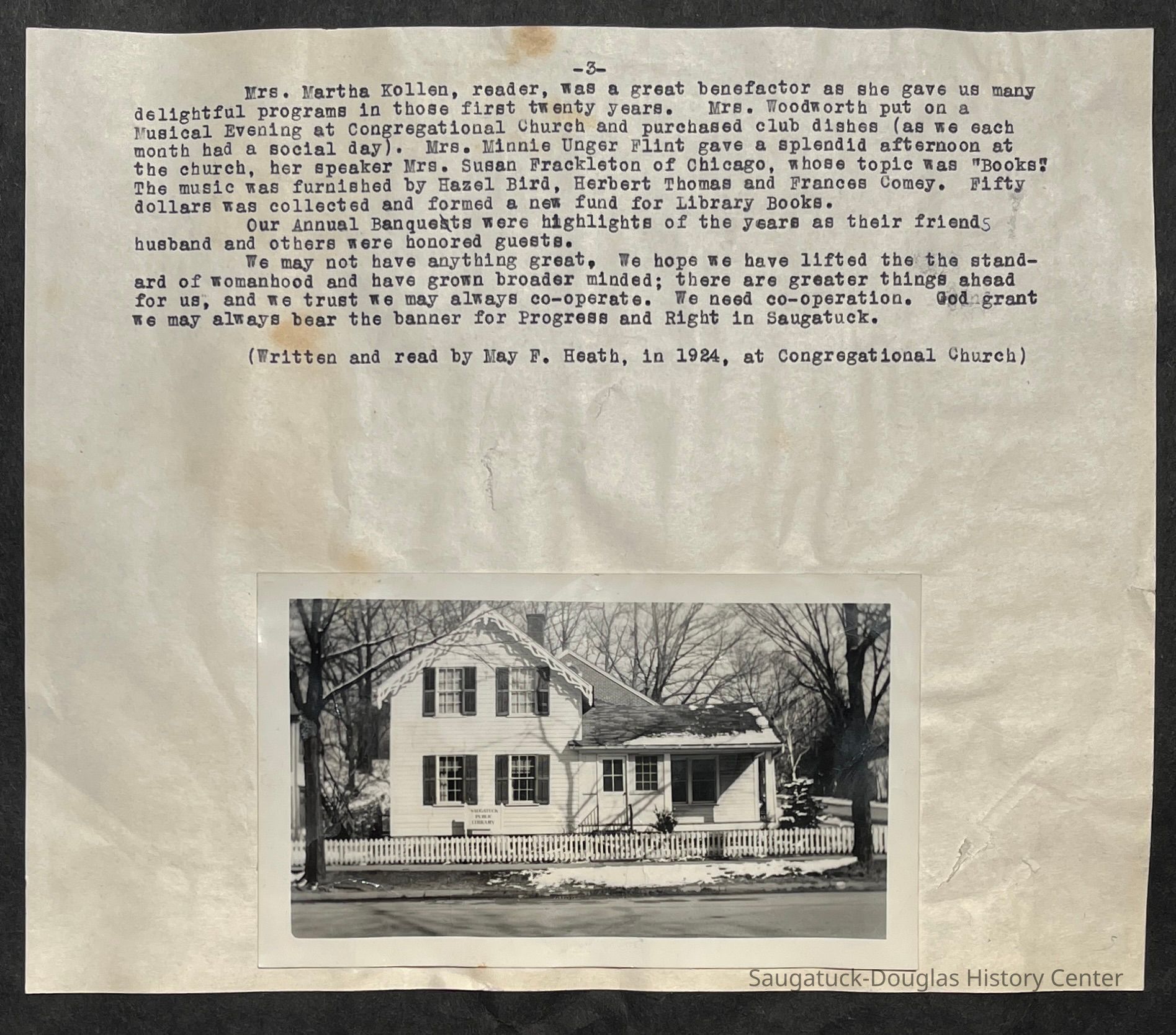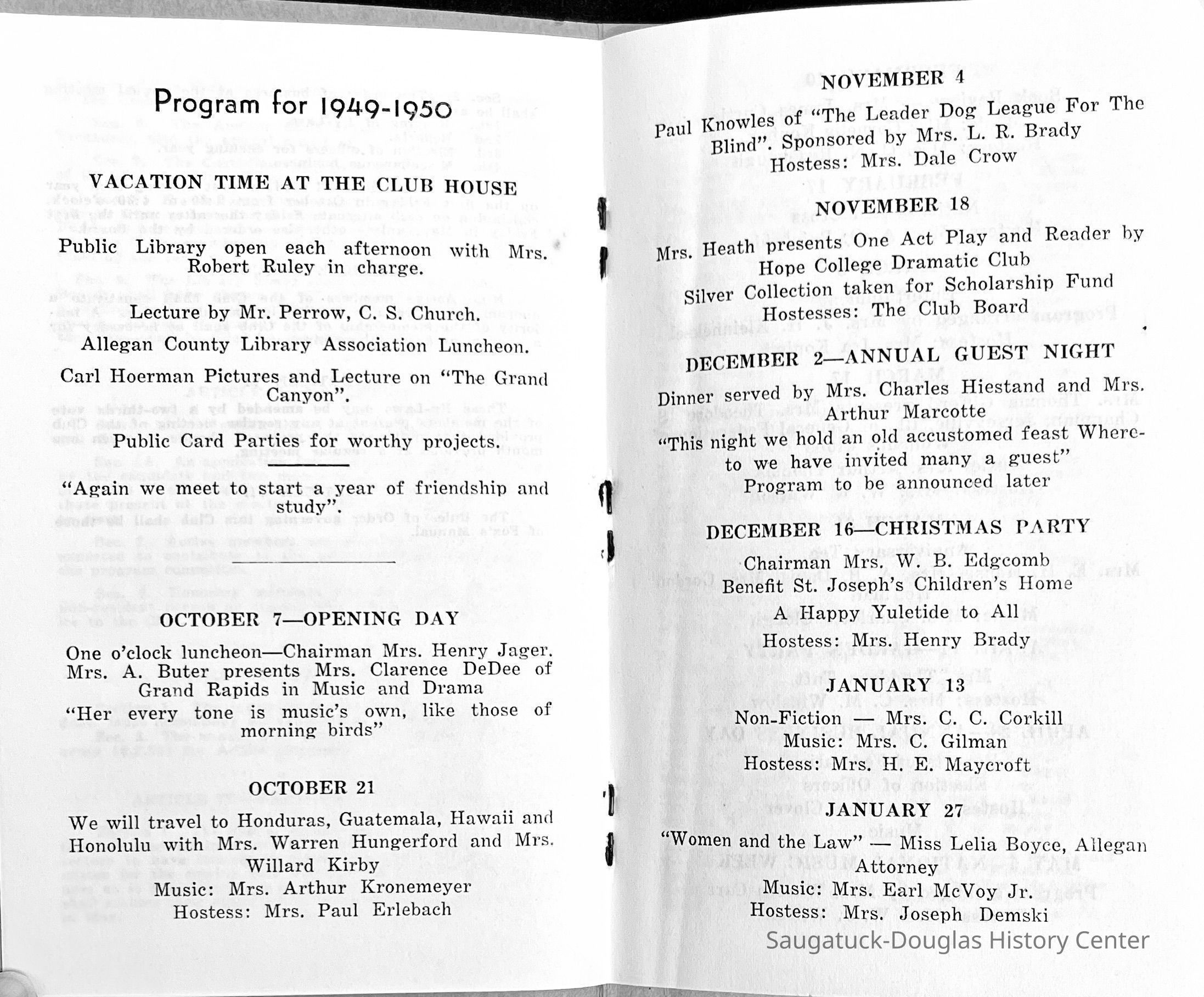Saugatuck Woman's Club 1904-present, Saugatuck Woman's Club auditorium 1935-present, Heath, May (Francis) 1873-1961, Bird, Harriet “Hattie” Louise (Moffat) (Wright) 1855-1944, Breuckman, Minnie 1869-1934, Coates, Adella "Della" (Holmes) 1864-1950, Thomson, Jeanette Elvira (Harris) 1862-1956, Fox, Johnson 1918-2009, Hodge, Emma Ursula (Gunzenhauser) 1864-1950, Dailey, Margaret, E. (Calkins) 1866-1940, Zwemer, Saburna G. (Woodworth) 1875-1949, Henry, Isabel (Shore) 1856-1936, Woodworth, Alice C. (Redway) Mather 1848-1930, 439 Butler/Butler Pantry/Wilkins/Koning/Nies Hardware, Allen, Flora Elizabeth (Sprang) 1863-1943, Walker, Adelaide Elizabeth (Wade) 1885-1932, Goshorn, Hattie Louise (DePuy) 1874-1953, House, Celia Martin (Gamble) (1890-1976), Millar, Nellie Grant (Raymond) 1861-1956, Jackson, Rhea Bernice (Allen) 1892-1979, Leland, Ruth F. (Baker) 1878-1949, Comey, Alice Maude (Grant) 1870-1944, Davis, Edna Mae (Gaylord) 1896-1980, Wilson, Grace (Cobb) 1897-1992, Sheridan, Irene (Weible) 1883-1967, Waddell, Sadie R. 1882-1947, Wicks, Caroline Jane "Carrie" (Millar) Stillson 1884-1983, Hoffman, Elizabeth S. "Betty" (Gregory) 1894-1960, Brady, Winifred E. (Randall) 1893-1961, Peirce, Roberta "Bobbie" Margaret (Fredrickson) 1914-2004, Carr, Elsie Virginia (Kaufman) 1906-1997, Bieler or Beler, Mrs. Ernest 1904-1954?, Bainbridge, Marguerite (Holladay) 1888-1974, Edgcomb, Ruth M. (Severance) 1915-1997, Taylor, Mrs. Harold