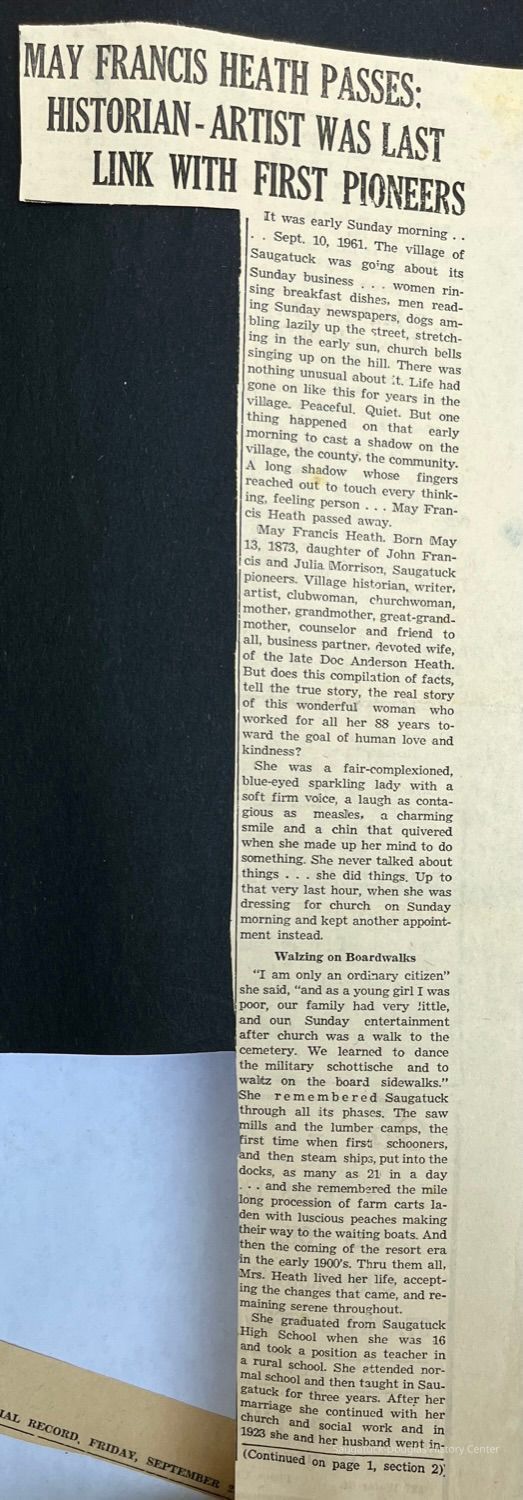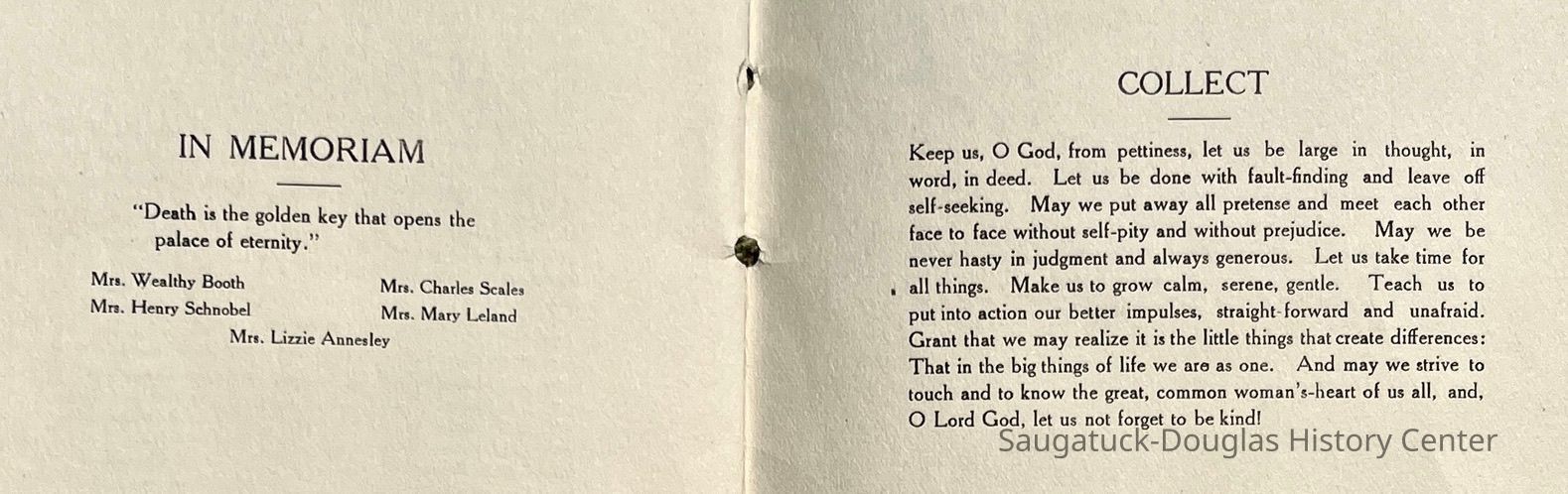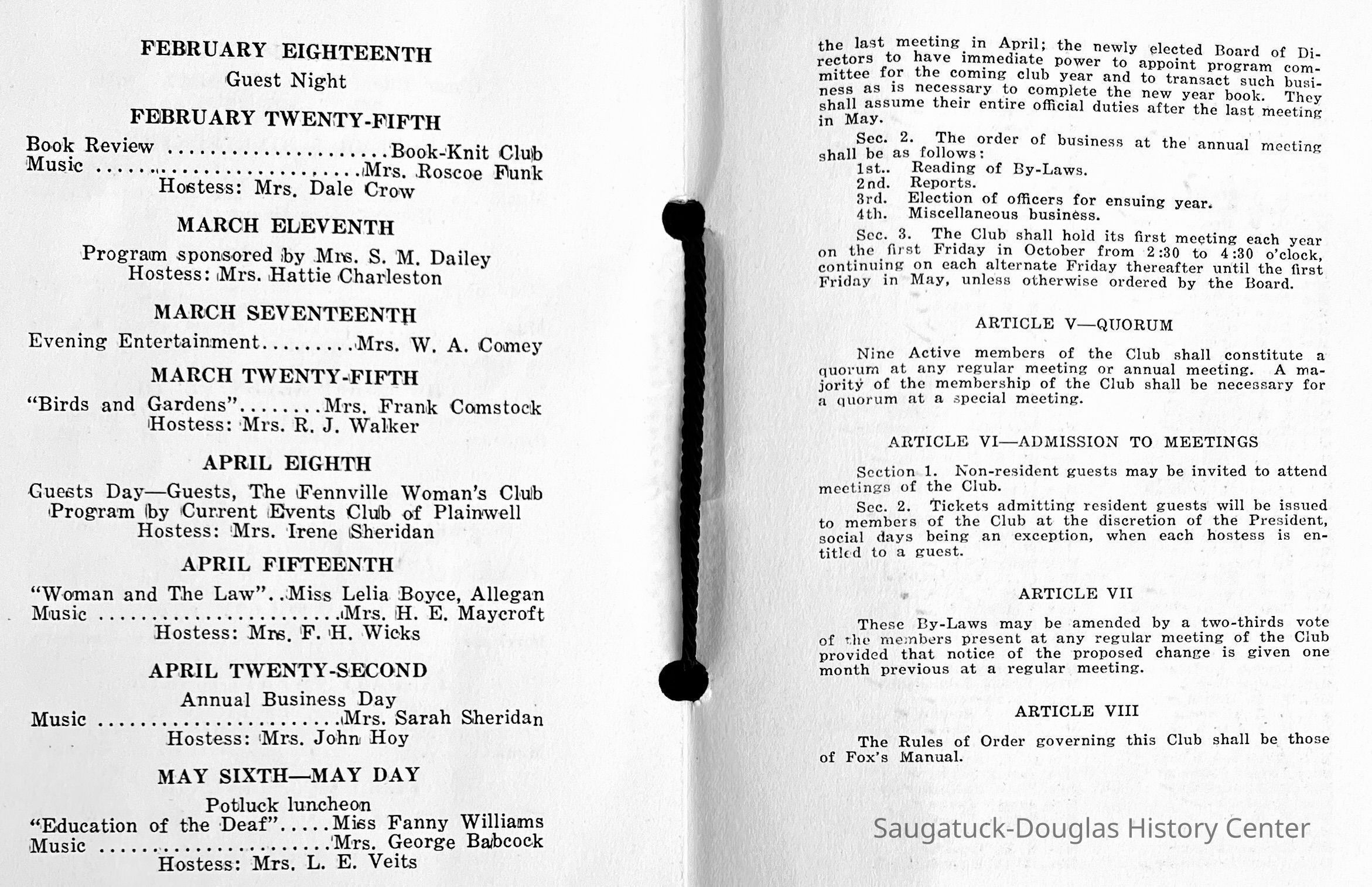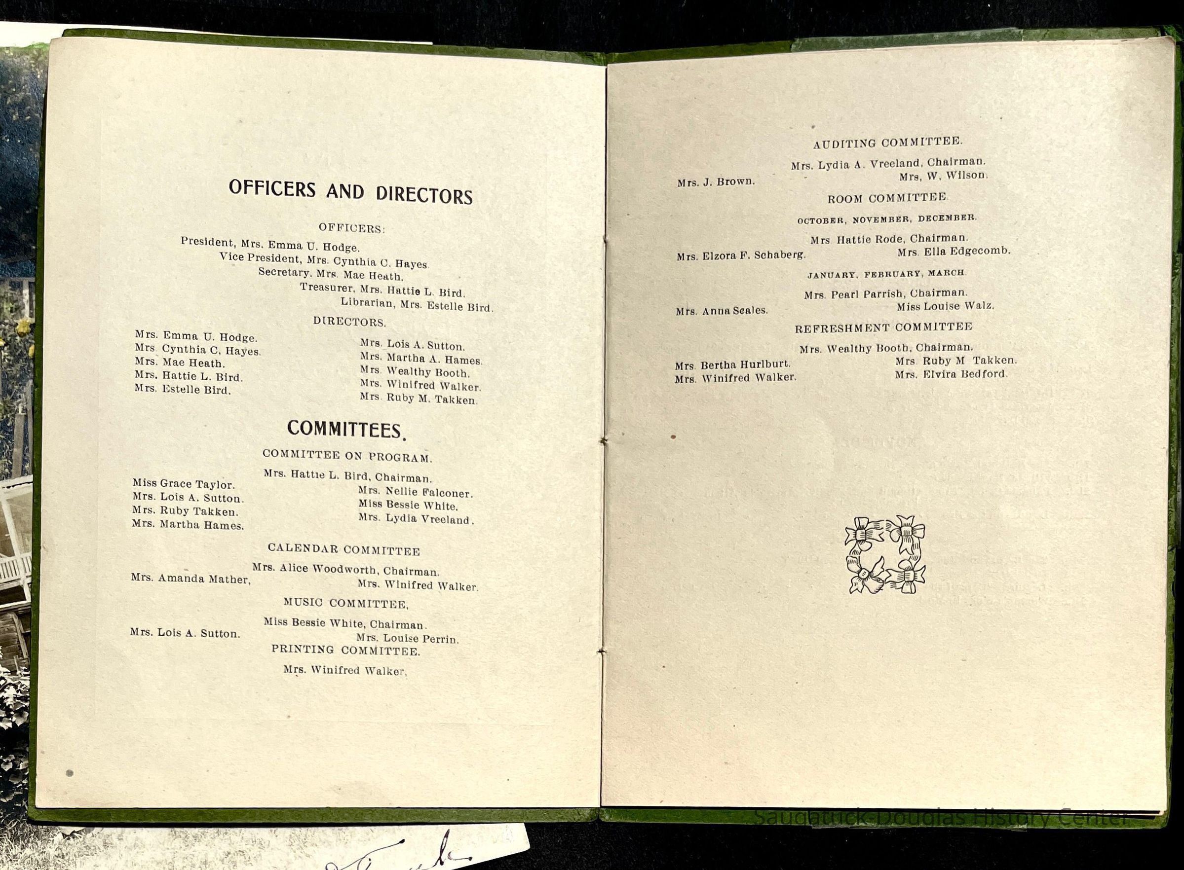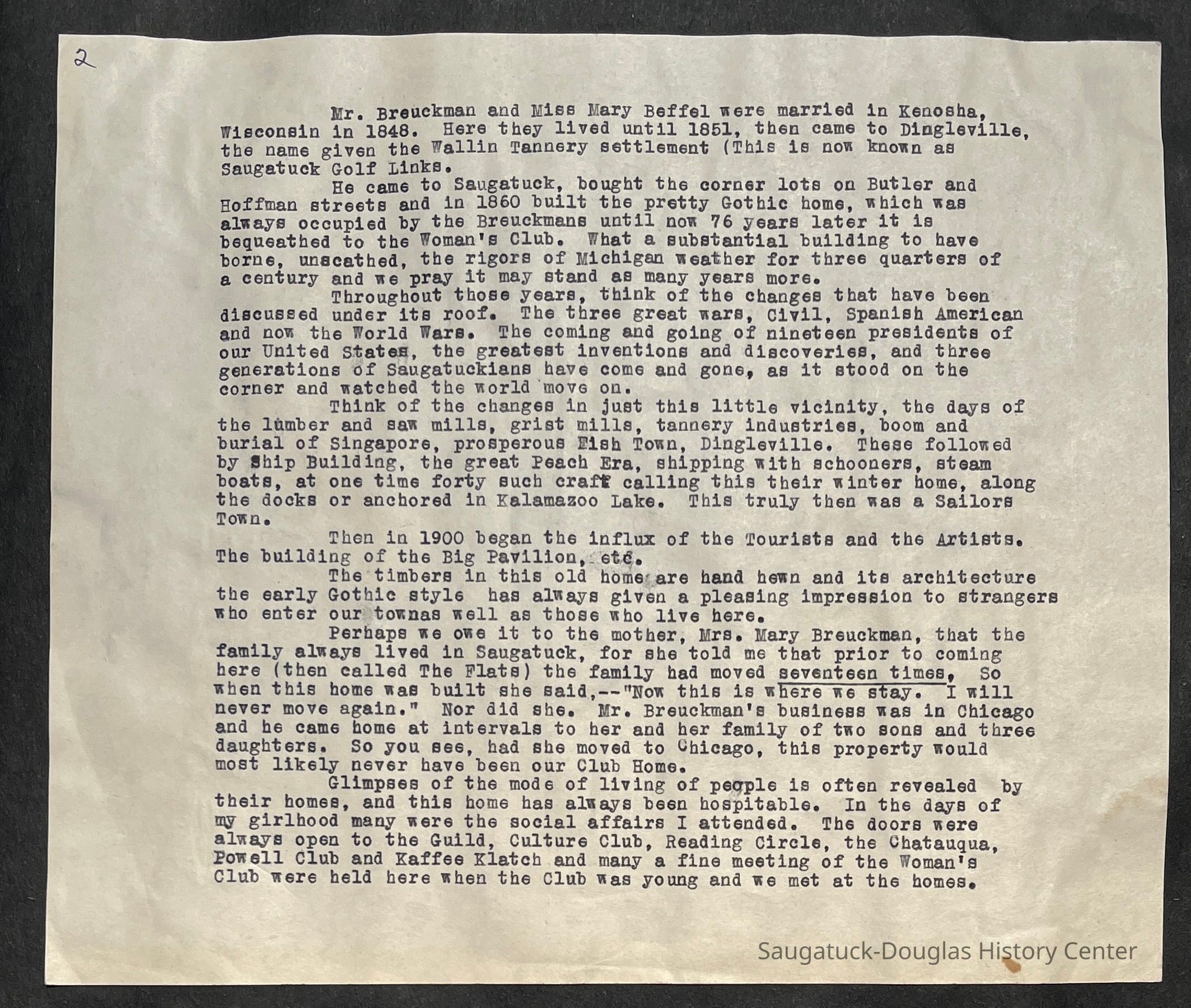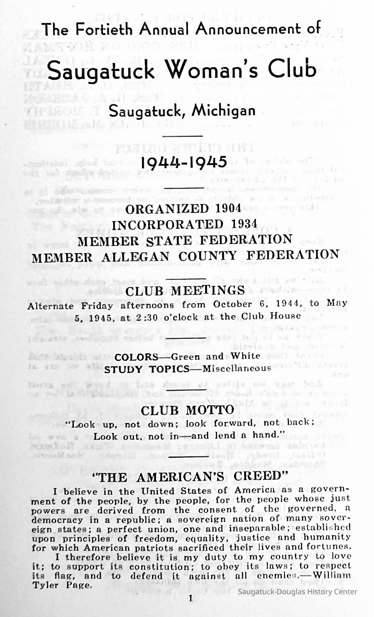 Saugatuck Woman's Club 1904-present, Saugatuck Woman's Club auditorium 1935-present, Heath, May (Francis) 1873-1961, Bird, Harriet “Hattie” Louise (Moffat) (Wright) 1855-1944, Breuckman, Minnie 1869-1934, Coates, Adella "Della" (Holmes) 1864-1950, Thomson, Jeanette Elvira (Harris) 1862-1956, Fox, Johnson 1918-2009, Hodge, Emma Ursula (Gunzenhauser) 1864-1950, Dailey, Margaret, E. (Calkins) 1866-1940, Zwemer, Saburna G. (Woodworth) 1875-1949, Henry, Isabel (Shore) 1856-1936, Woodworth, Alice C. (Redway) Mather 1848-1930, 439 Butler/Butler Pantry/Wilkins/Koning/Nies Hardware, Allen, Flora Elizabeth (Sprang) 1863-1943, Walker, Adelaide Elizabeth (Wade) 1885-1932, Goshorn, Hattie Louise (DePuy) 1874-1953, House, Celia Martin (Gamble) (1890-1976), Millar, Nellie Grant (Raymond) 1861-1956, Jackson, Rhea Bernice (Allen) 1892-1979, Leland, Ruth F. (Baker) 1878-1949, Comey, Alice Maude (Grant) 1870-1944, Davis, Edna Mae (Gaylord) 1896-1980, Wilson, Grace (Cobb) 1897-1992, Sheridan, Irene (Weible) 1883-1967, Waddell, Sadie R. 1882-1947, Wicks, Caroline Jane "Carrie" (Millar) Stillson 1884-1983, Hoffman, Elizabeth S. "Betty" (Gregory) 1894-1960, Brady, Winifred E. (Randall) 1893-1961, Peirce, Roberta "Bobbie" Margaret (Fredrickson) 1914-2004, Carr, Elsie Virginia (Kaufman) 1906-1997, Bieler or Beler, Mrs. Ernest 1904-1954?, Bainbridge, Marguerite (Holladay) 1888-1974, Edgcomb, Ruth M. (Severance) 1915-1997, Taylor, Mrs. Harold