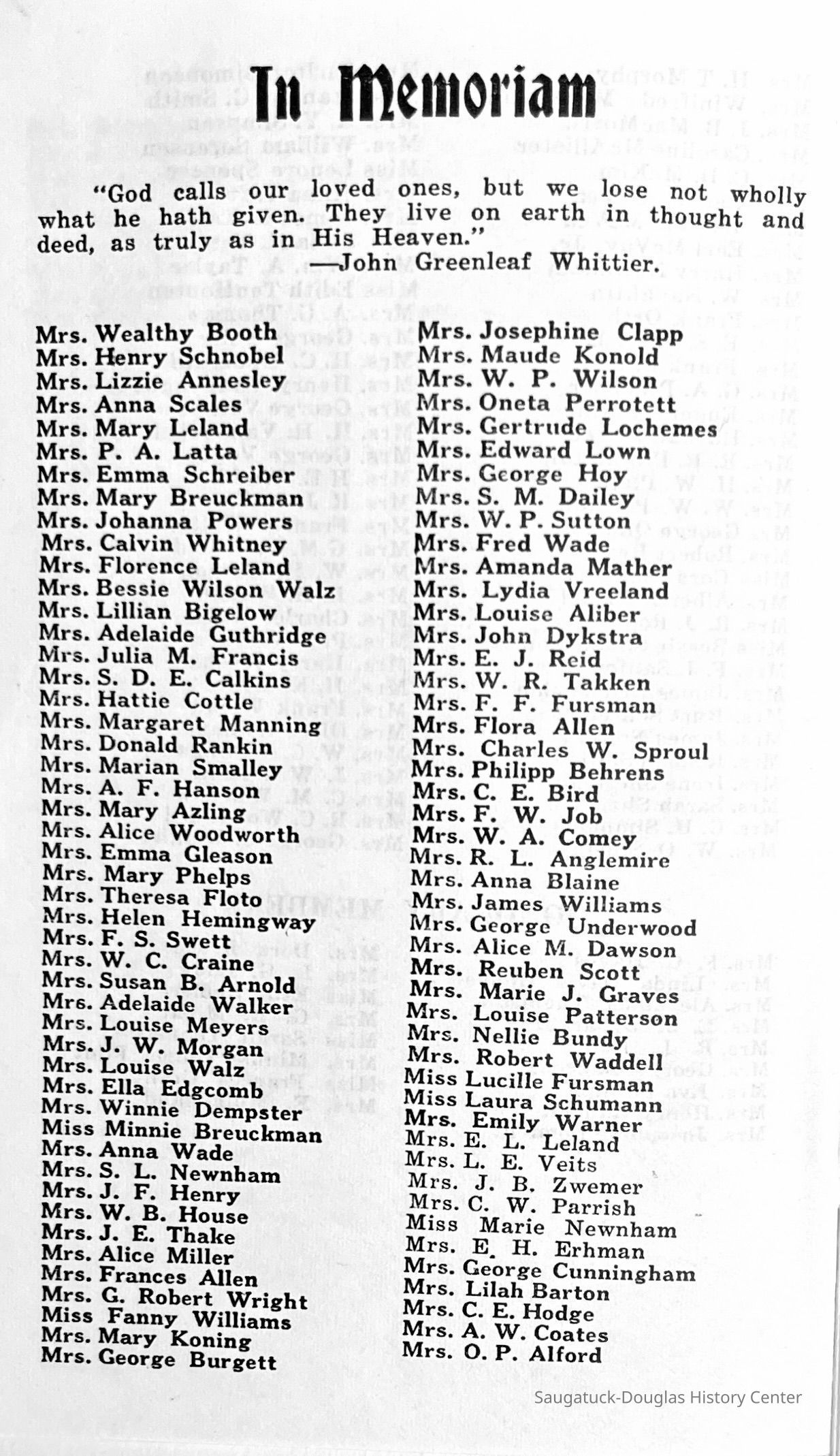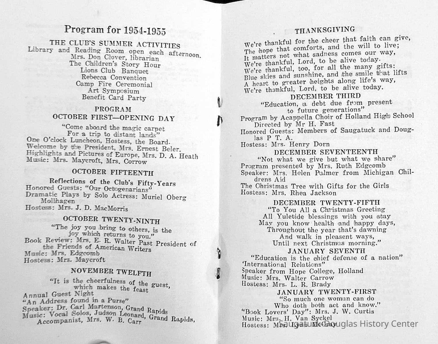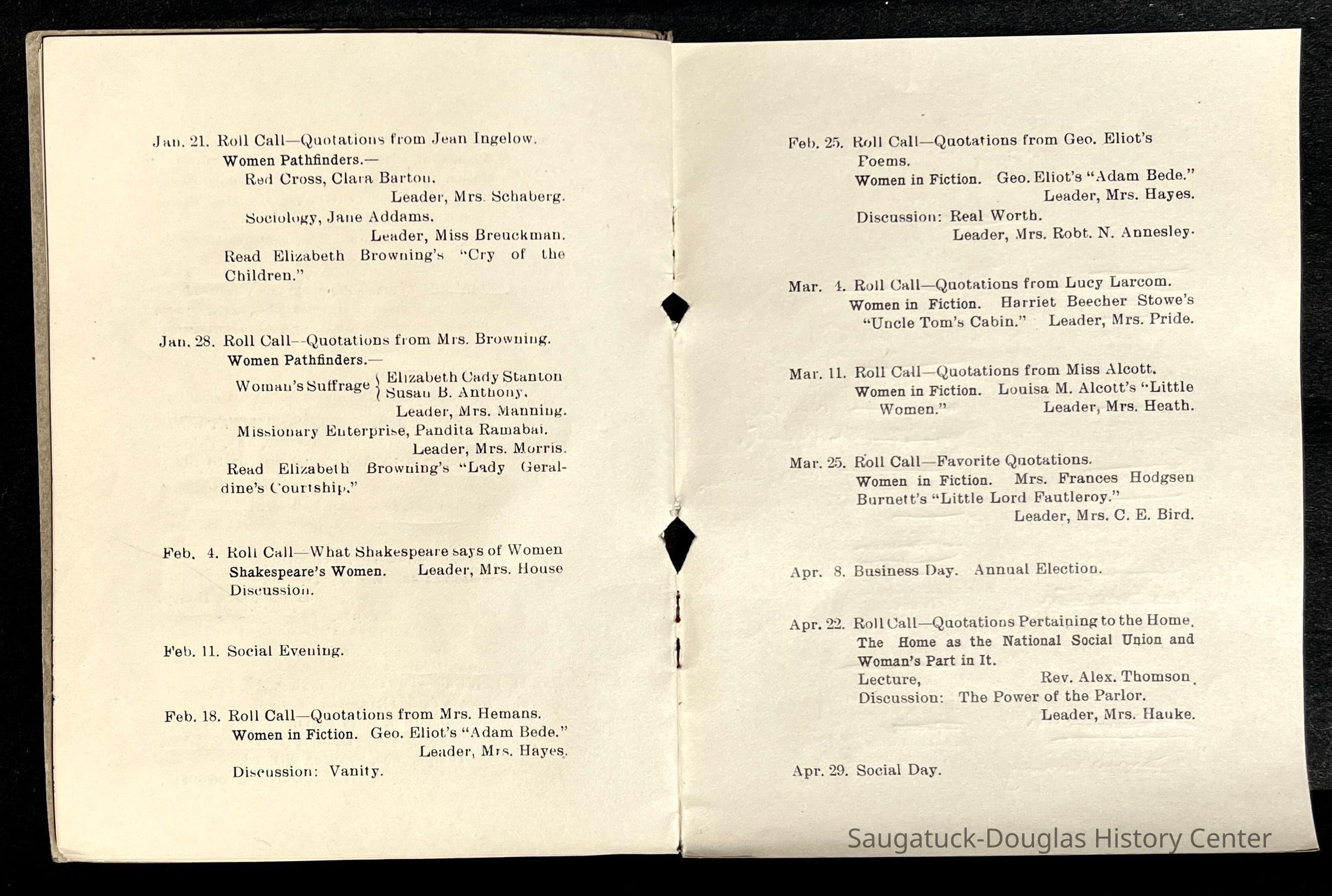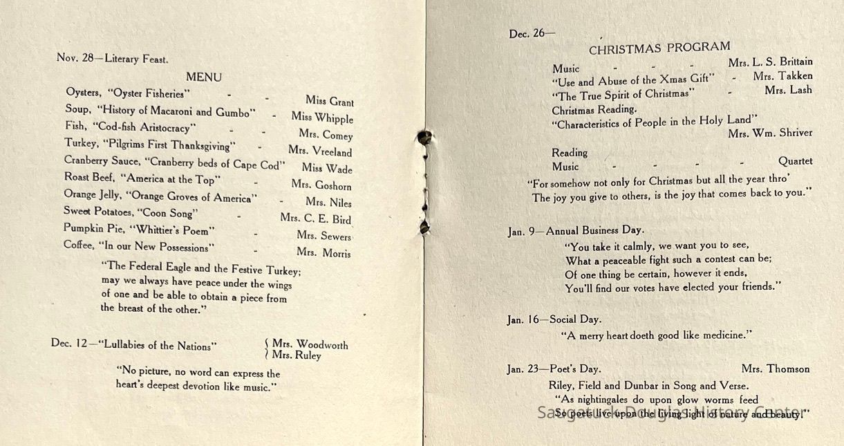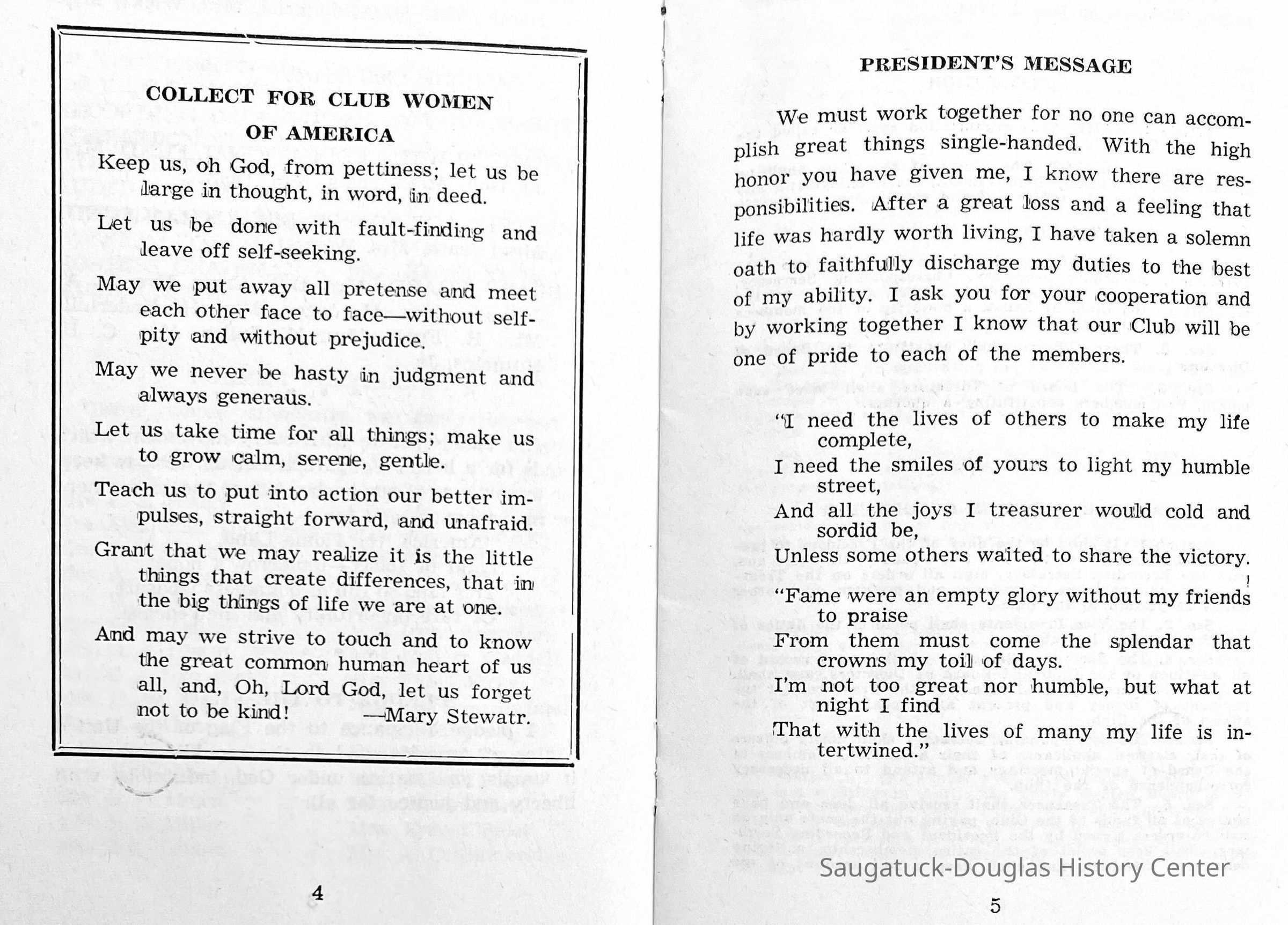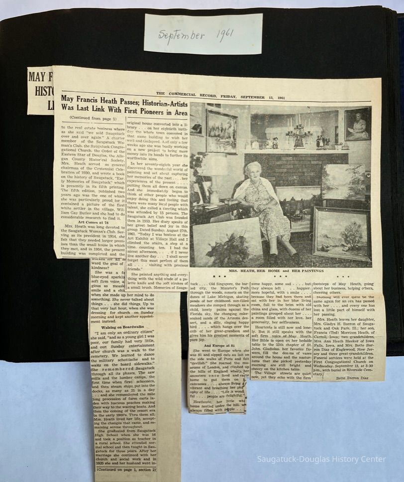 Saugatuck Woman's Club 1904-present, Saugatuck Woman's Club auditorium 1935-present, Heath, May (Francis) 1873-1961, Bird, Harriet “Hattie” Louise (Moffat) (Wright) 1855-1944, Breuckman, Minnie 1869-1934, Coates, Adella "Della" (Holmes) 1864-1950, Thomson, Jeanette Elvira (Harris) 1862-1956, Fox, Johnson 1918-2009, Hodge, Emma Ursula (Gunzenhauser) 1864-1950, Dailey, Margaret, E. (Calkins) 1866-1940, Zwemer, Saburna G. (Woodworth) 1875-1949, Henry, Isabel (Shore) 1856-1936, Woodworth, Alice C. (Redway) Mather 1848-1930, 439 Butler/Butler Pantry/Wilkins/Koning/Nies Hardware, Allen, Flora Elizabeth (Sprang) 1863-1943, Walker, Adelaide Elizabeth (Wade) 1885-1932, Goshorn, Hattie Louise (DePuy) 1874-1953, House, Celia Martin (Gamble) (1890-1976), Millar, Nellie Grant (Raymond) 1861-1956, Jackson, Rhea Bernice (Allen) 1892-1979, Leland, Ruth F. (Baker) 1878-1949, Comey, Alice Maude (Grant) 1870-1944, Davis, Edna Mae (Gaylord) 1896-1980, Wilson, Grace (Cobb) 1897-1992, Sheridan, Irene (Weible) 1883-1967, Waddell, Sadie R. 1882-1947, Wicks, Caroline Jane "Carrie" (Millar) Stillson 1884-1983, Hoffman, Elizabeth S. "Betty" (Gregory) 1894-1960, Brady, Winifred E. (Randall) 1893-1961, Peirce, Roberta "Bobbie" Margaret (Fredrickson) 1914-2004, Carr, Elsie Virginia (Kaufman) 1906-1997, Bieler or Beler, Mrs. Ernest 1904-1954?, Bainbridge, Marguerite (Holladay) 1888-1974, Edgcomb, Ruth M. (Severance) 1915-1997, Taylor, Mrs. Harold