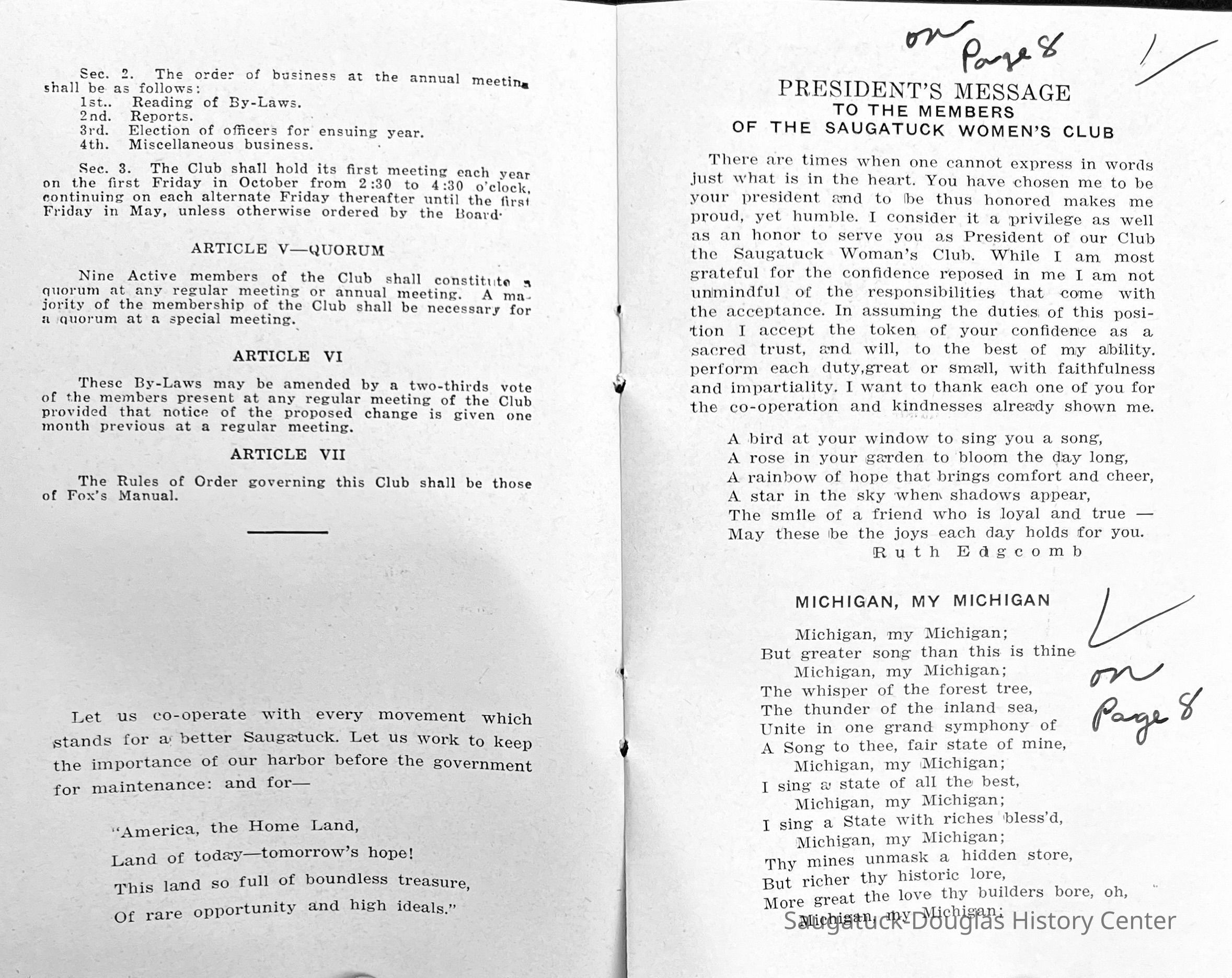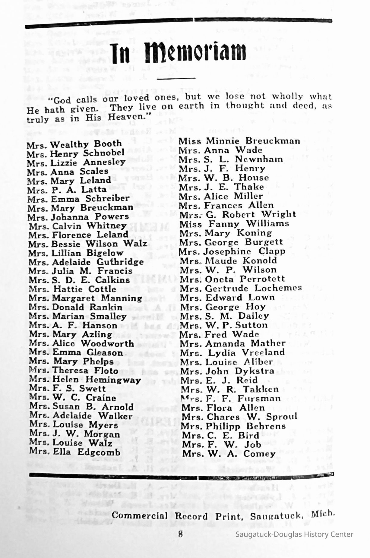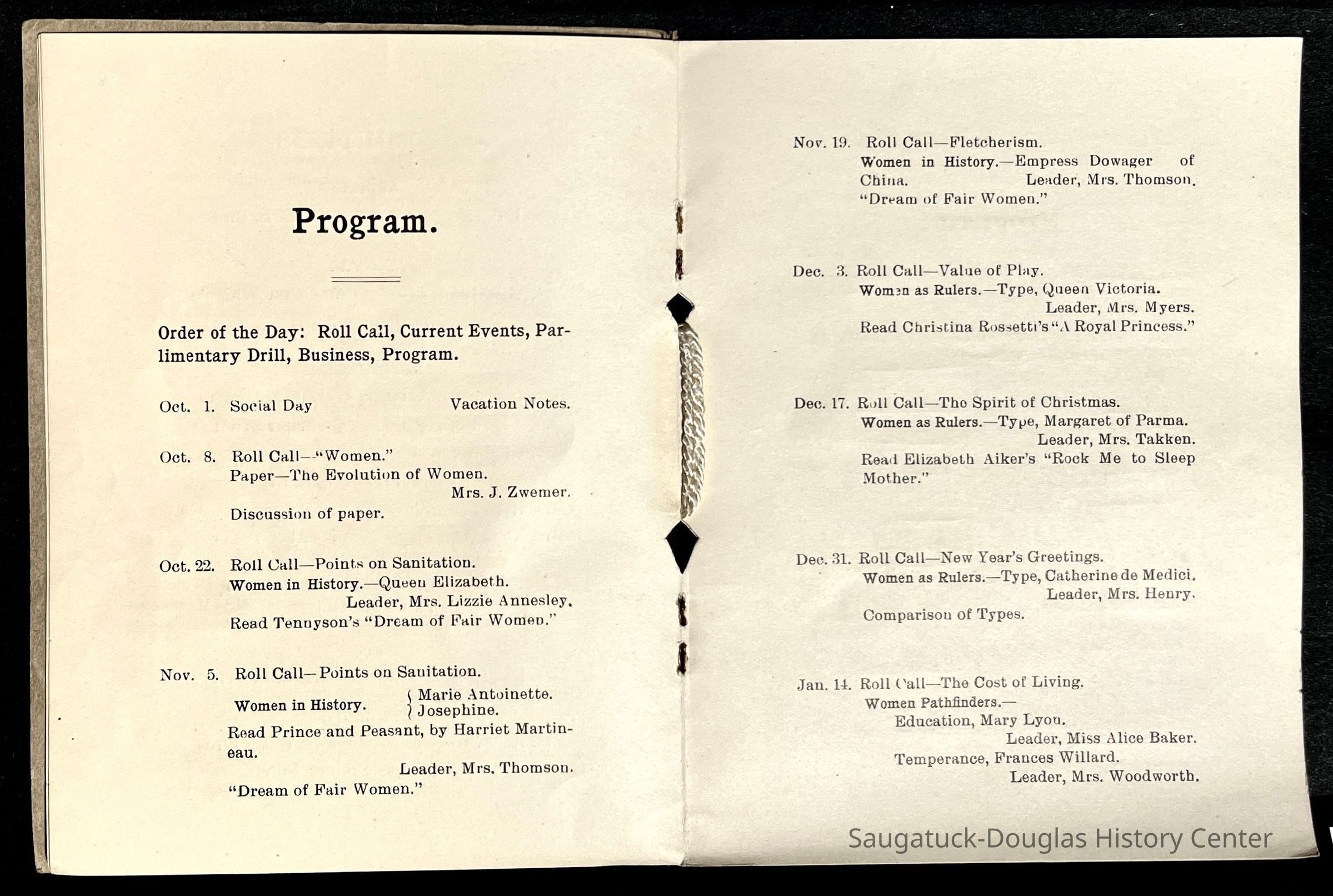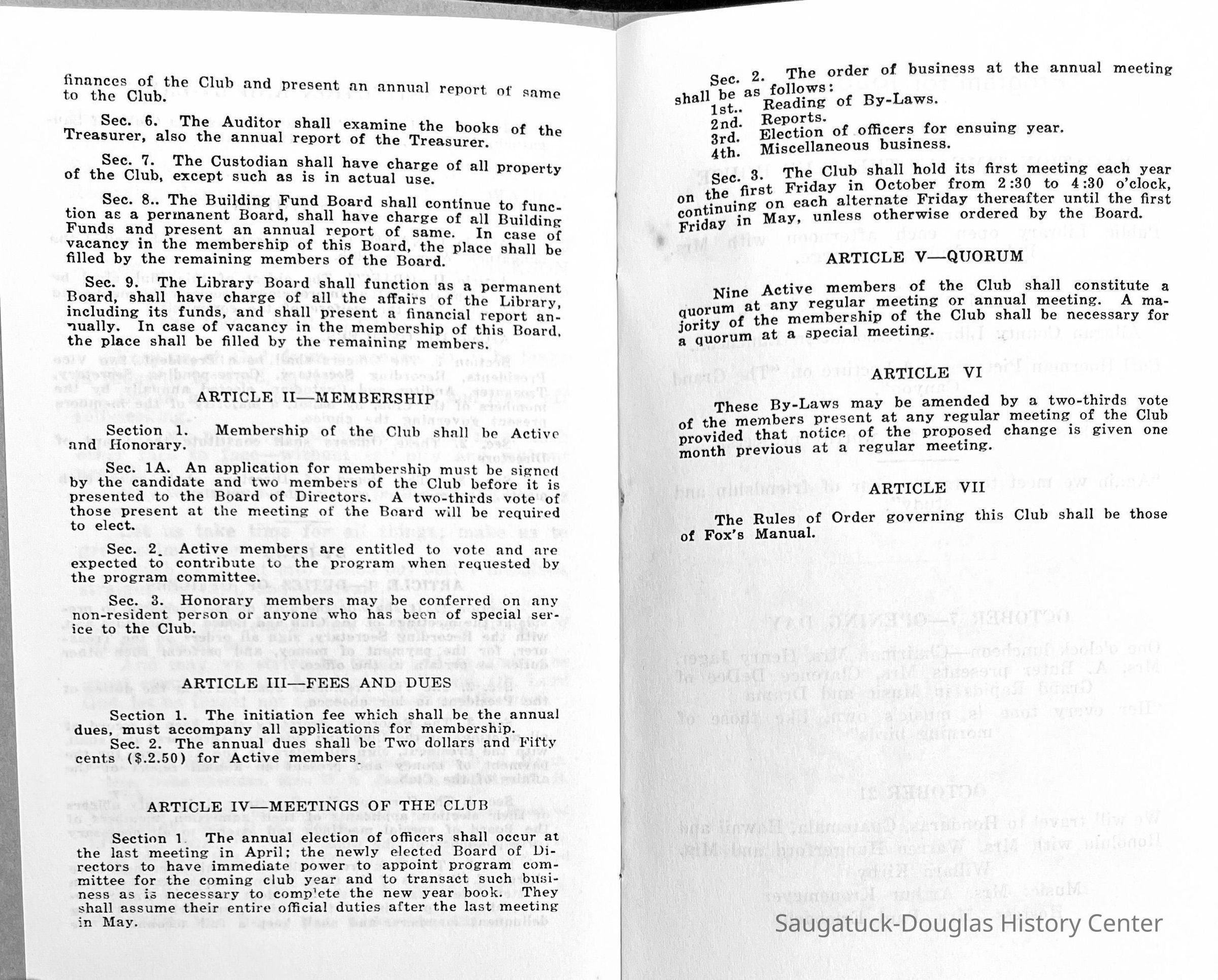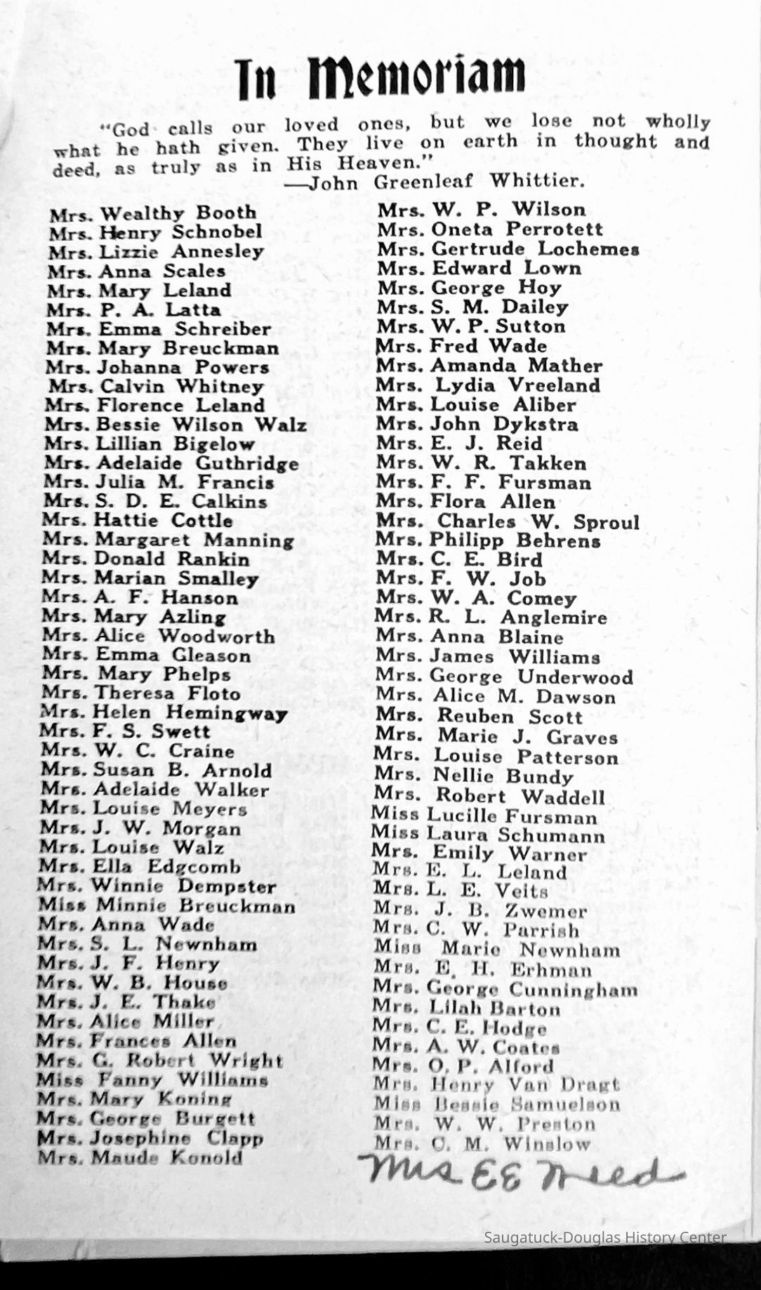 Saugatuck Woman's Club 1904-present, Saugatuck Woman's Club auditorium 1935-present, Heath, May (Francis) 1873-1961, Bird, Harriet “Hattie” Louise (Moffat) (Wright) 1855-1944, Breuckman, Minnie 1869-1934, Coates, Adella "Della" (Holmes) 1864-1950, Thomson, Jeanette Elvira (Harris) 1862-1956, Fox, Johnson 1918-2009, Hodge, Emma Ursula (Gunzenhauser) 1864-1950, Dailey, Margaret, E. (Calkins) 1866-1940, Zwemer, Saburna G. (Woodworth) 1875-1949, Henry, Isabel (Shore) 1856-1936, Woodworth, Alice C. (Redway) Mather 1848-1930, 439 Butler/Butler Pantry/Wilkins/Koning/Nies Hardware, Allen, Flora Elizabeth (Sprang) 1863-1943, Walker, Adelaide Elizabeth (Wade) 1885-1932, Goshorn, Hattie Louise (DePuy) 1874-1953, House, Celia Martin (Gamble) (1890-1976), Millar, Nellie Grant (Raymond) 1861-1956, Jackson, Rhea Bernice (Allen) 1892-1979, Leland, Ruth F. (Baker) 1878-1949, Comey, Alice Maude (Grant) 1870-1944, Davis, Edna Mae (Gaylord) 1896-1980, Wilson, Grace (Cobb) 1897-1992, Sheridan, Irene (Weible) 1883-1967, Waddell, Sadie R. 1882-1947, Wicks, Caroline Jane "Carrie" (Millar) Stillson 1884-1983, Hoffman, Elizabeth S. "Betty" (Gregory) 1894-1960, Brady, Winifred E. (Randall) 1893-1961, Peirce, Roberta "Bobbie" Margaret (Fredrickson) 1914-2004, Carr, Elsie Virginia (Kaufman) 1906-1997, Bieler or Beler, Mrs. Ernest 1904-1954?, Bainbridge, Marguerite (Holladay) 1888-1974, Edgcomb, Ruth M. (Severance) 1915-1997, Taylor, Mrs. Harold