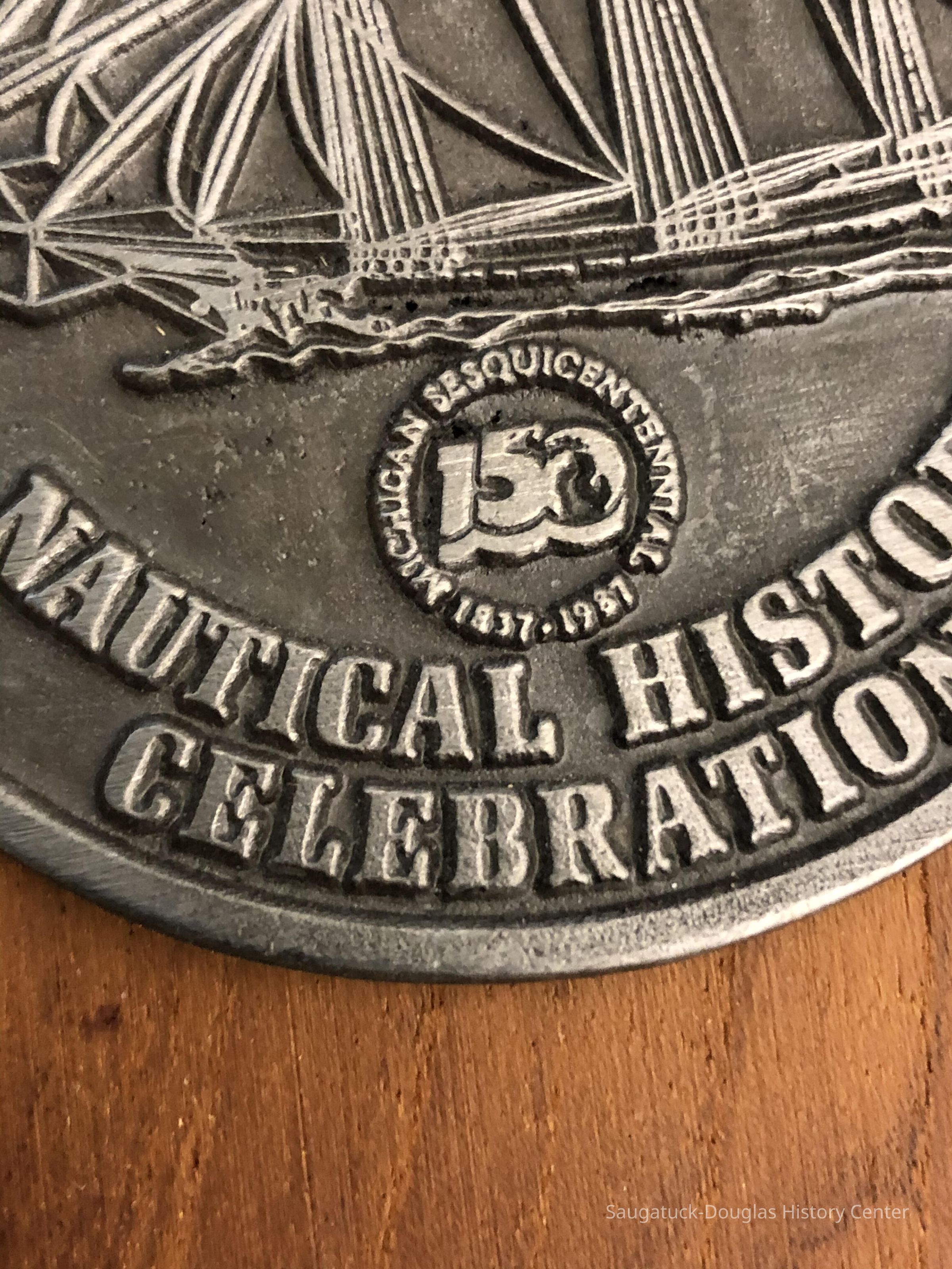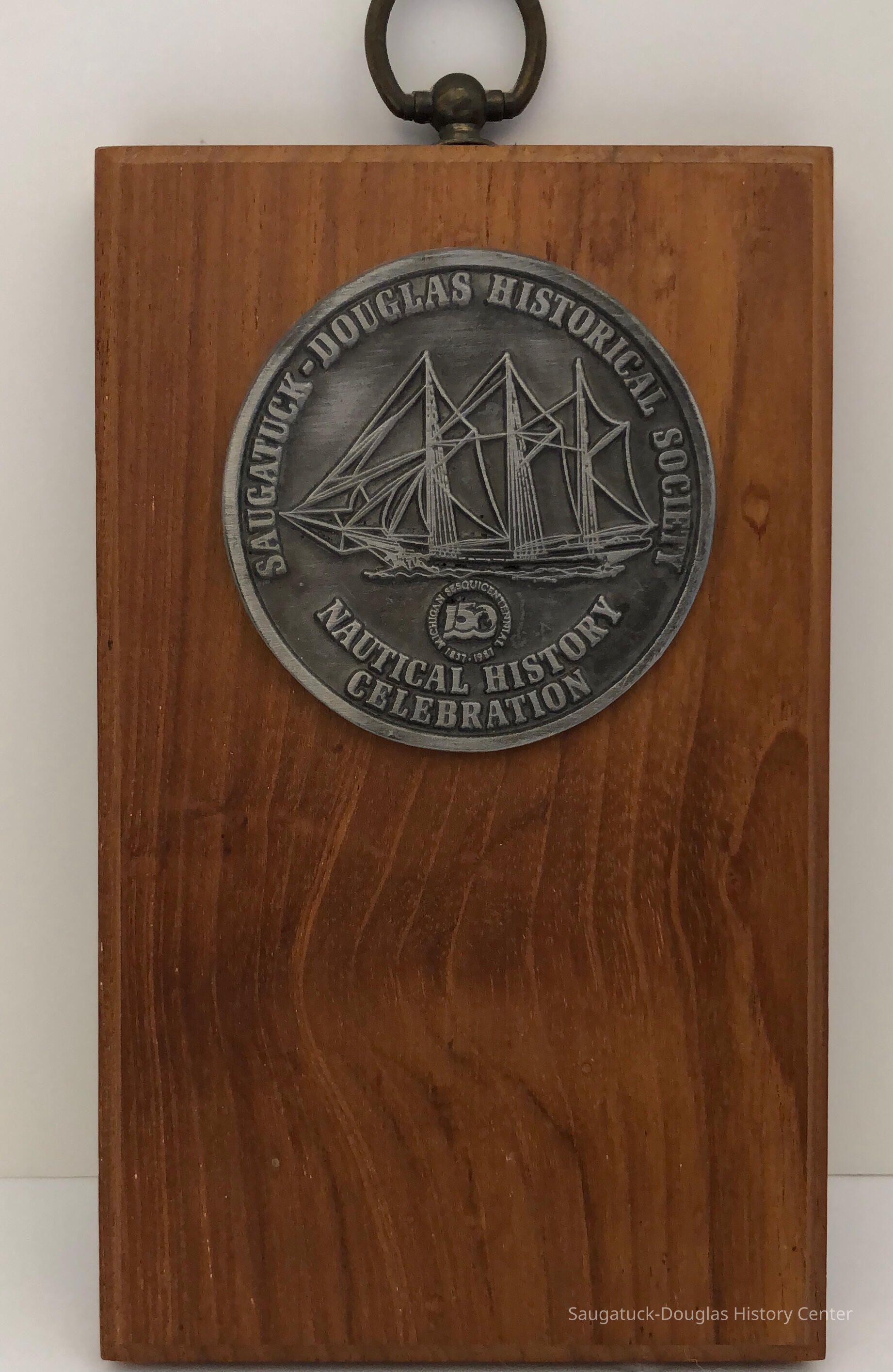 Small Wood plaque with round pewter medallion. Inscription on medallion "Saugatuck Douglas Historical Society" "Nautical History Celebration". "Michigan Sesquicentennial 1837-1987. "150"Collection