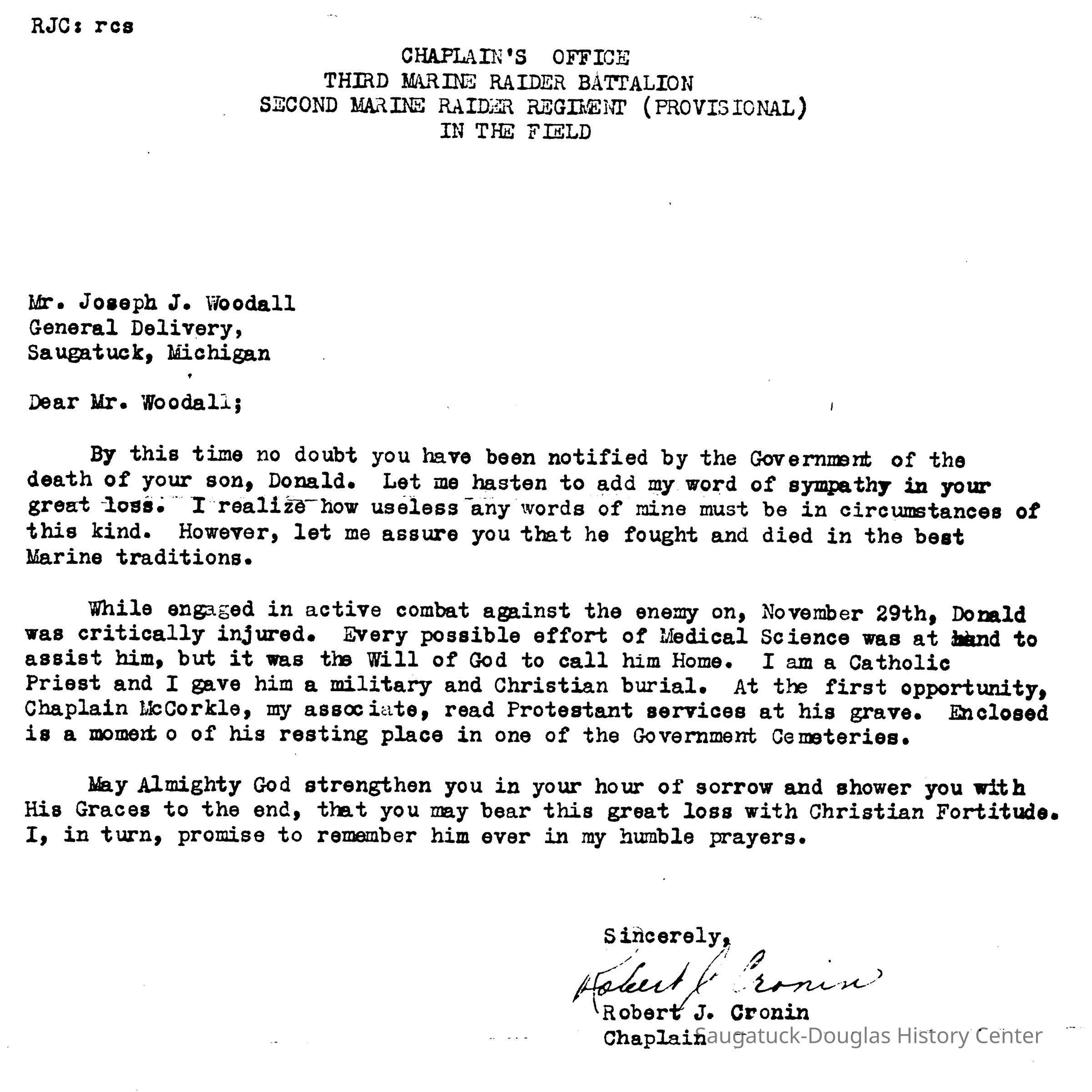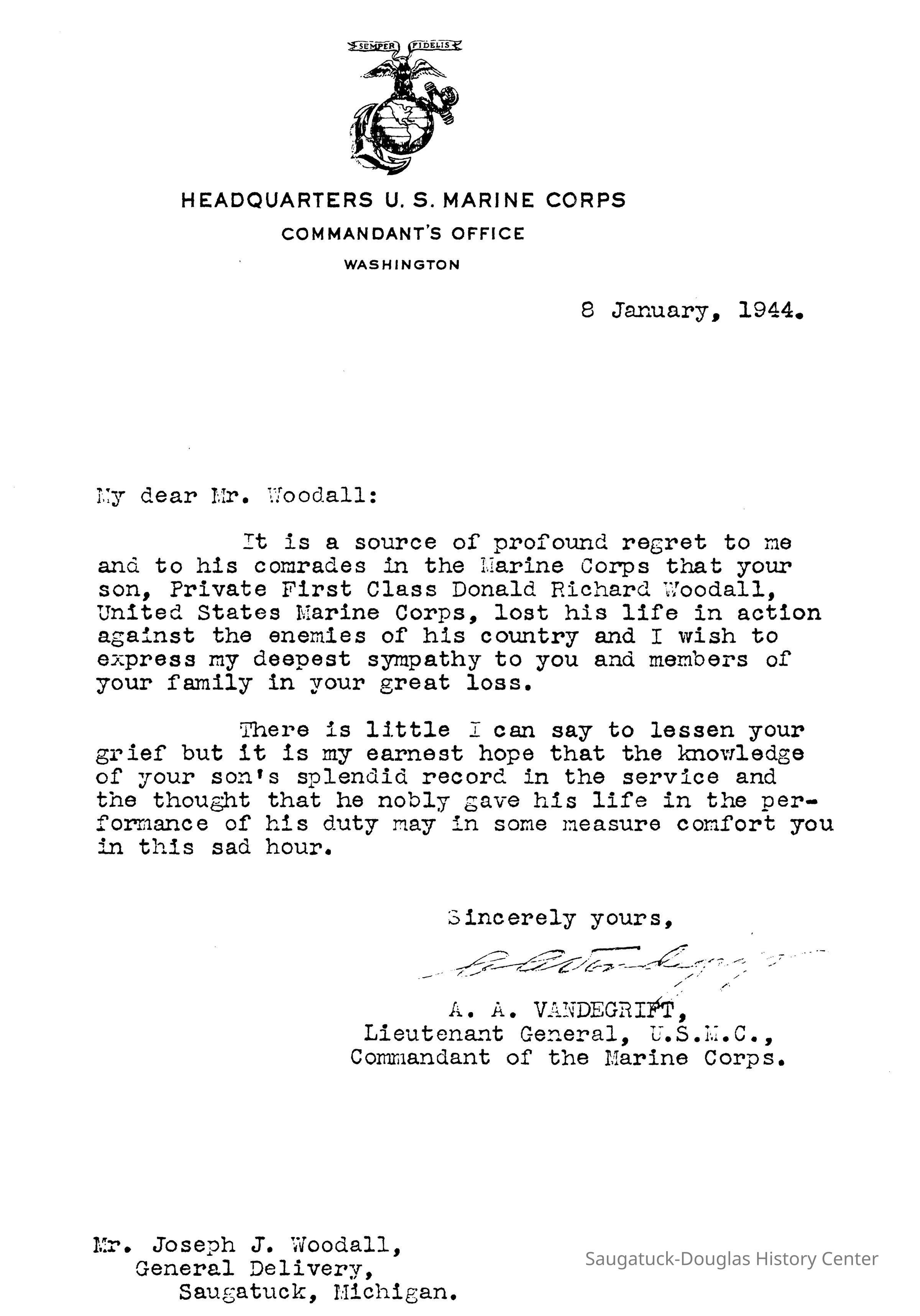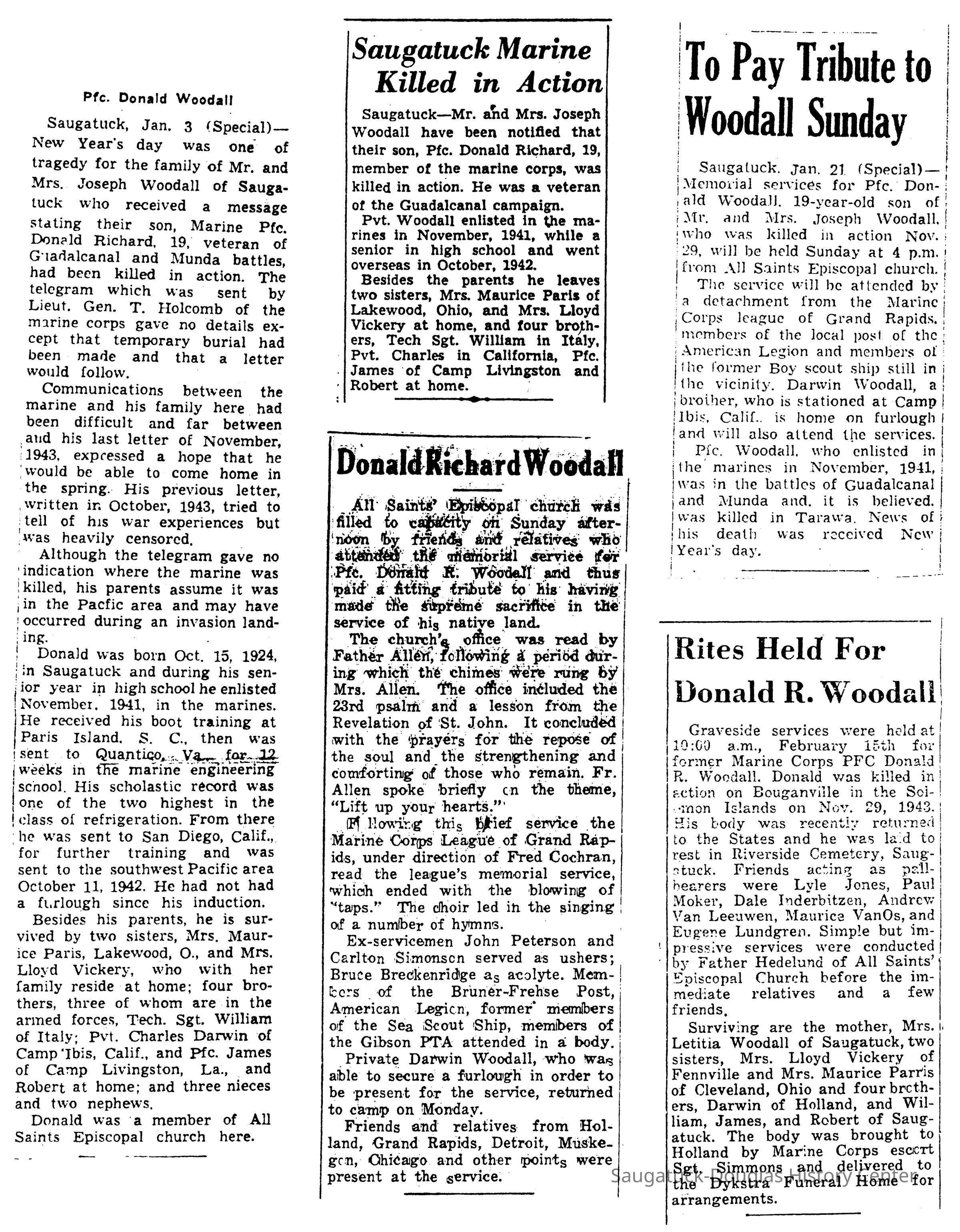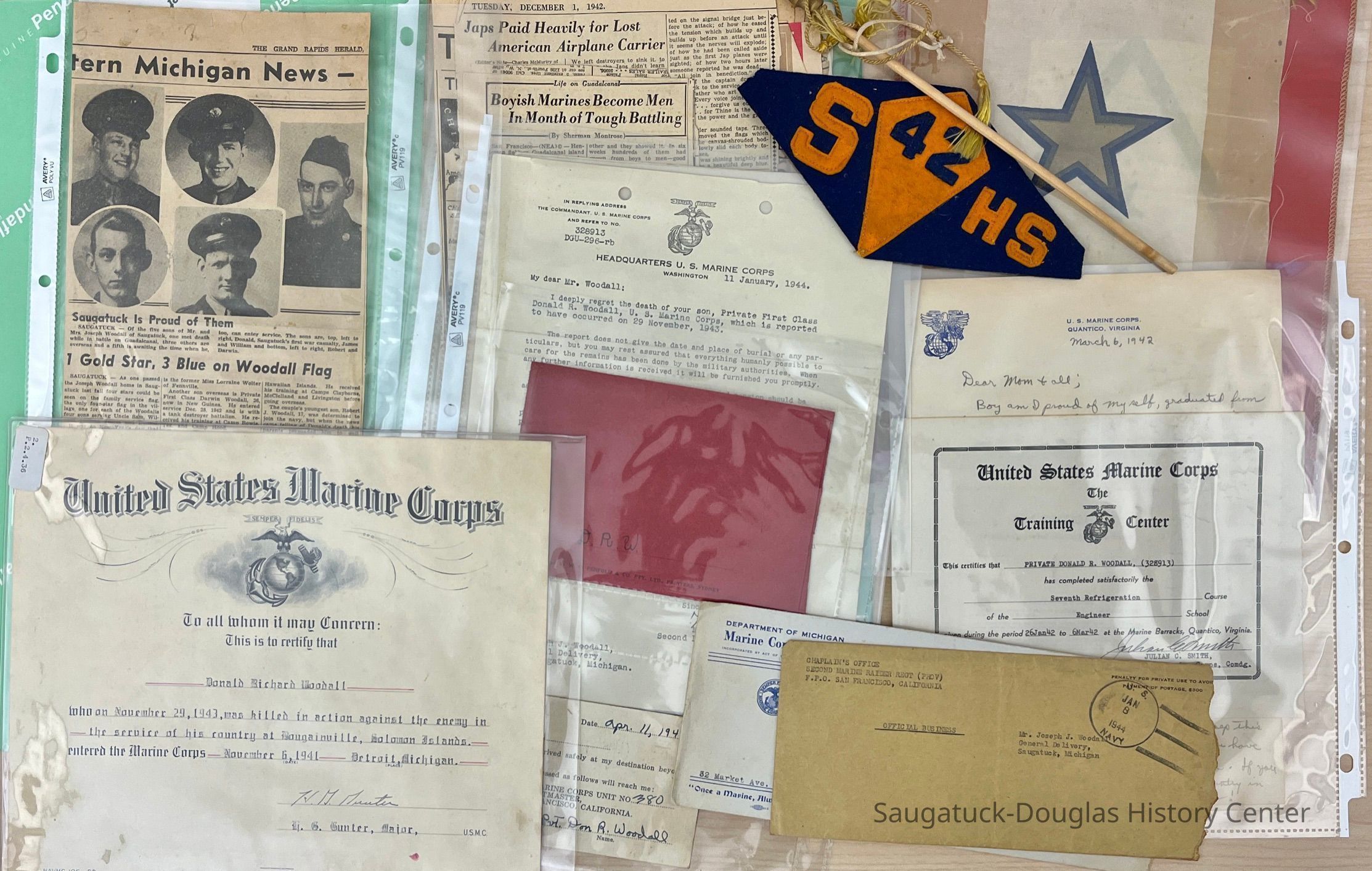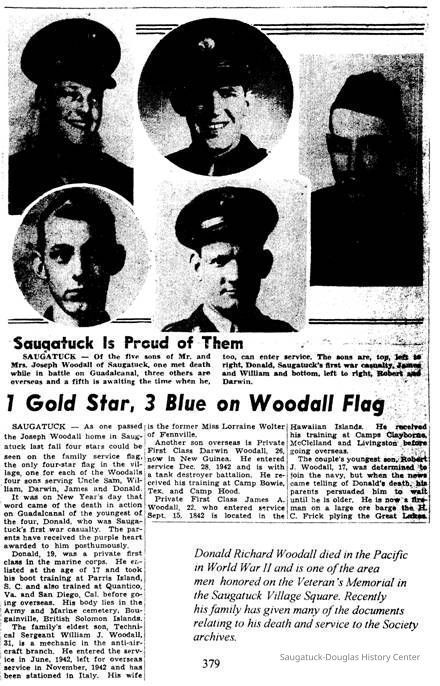 Donald Richard Woodall died in the Pacific in World War II and is one of the area men honored on the Veteran's Memorial in the Saugatuck Village Square. Donald was Saugatuck first WWII casualty.Collection