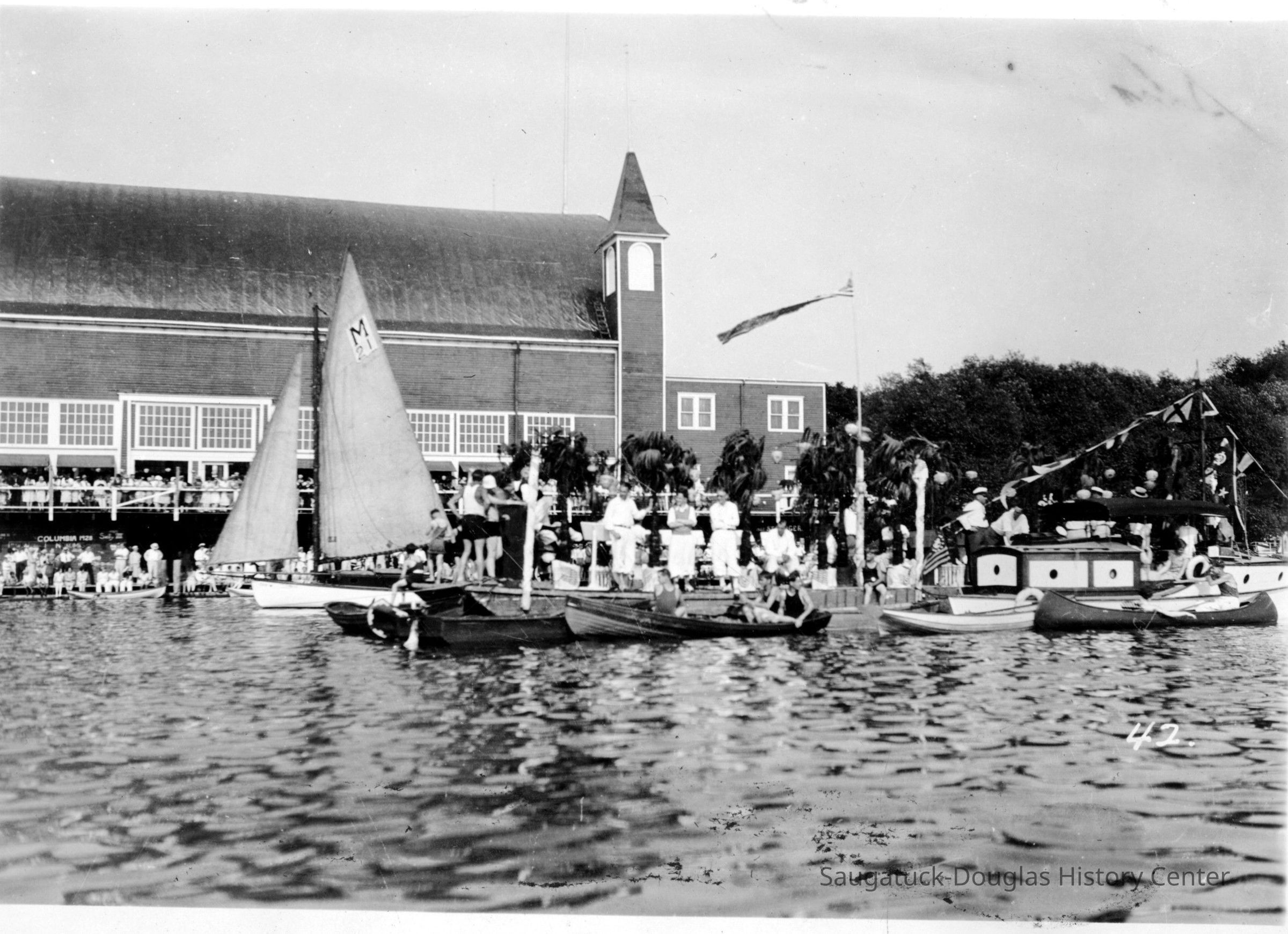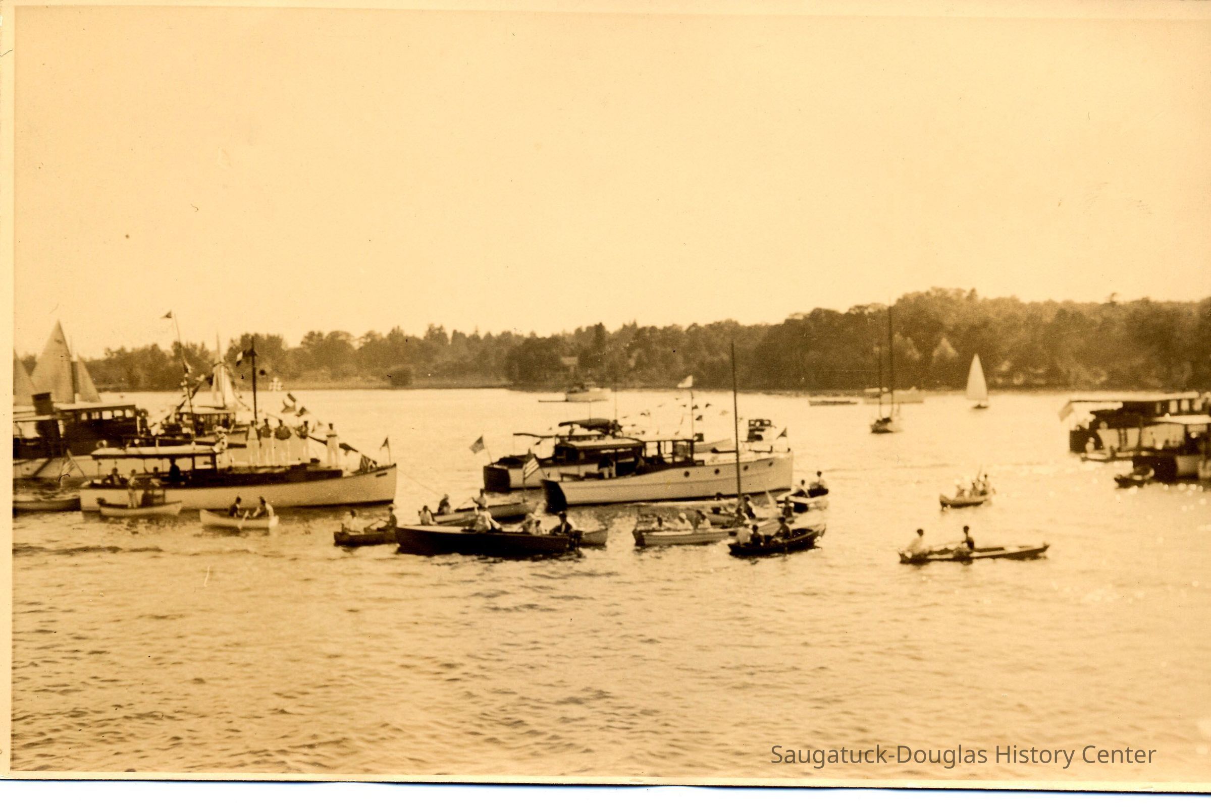 Photographs of parades of yachts, cruisers, rowboats, canoes, small sailboats and other watercraft.Photograph Details