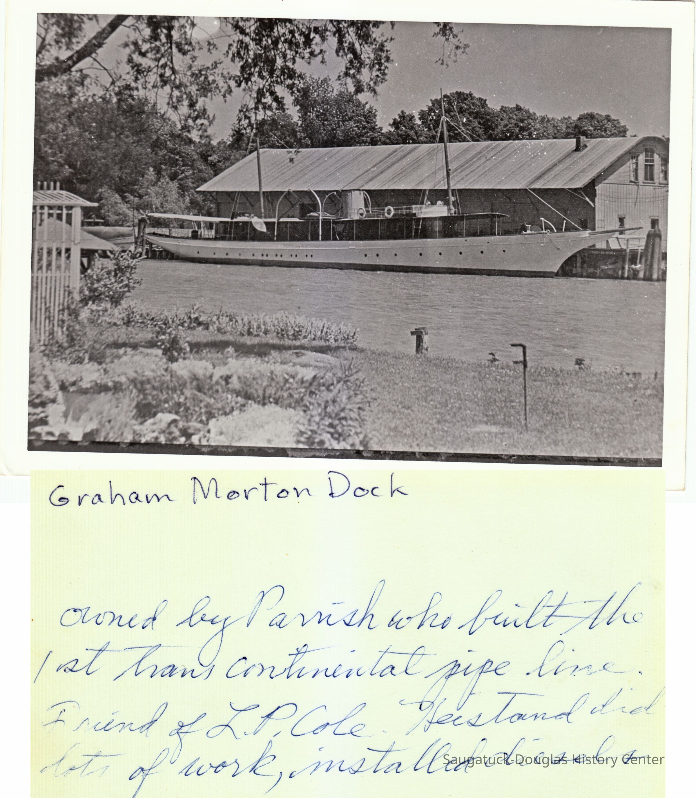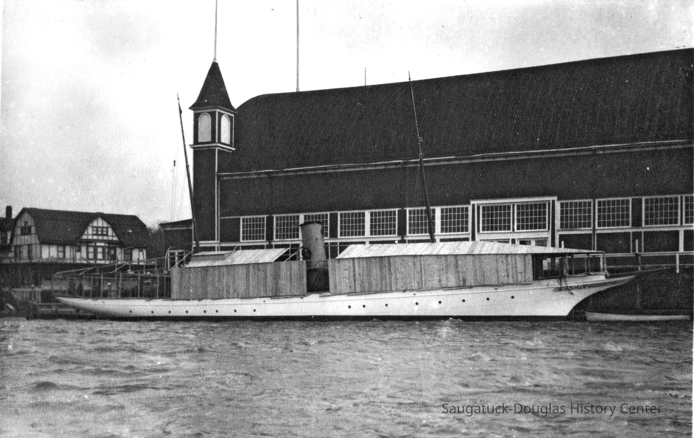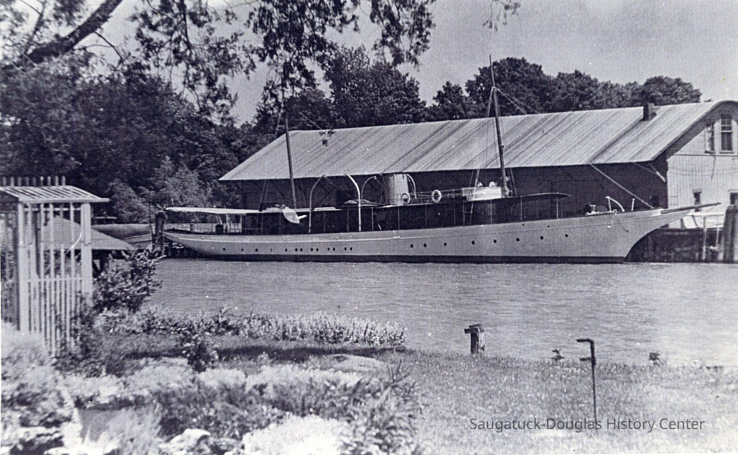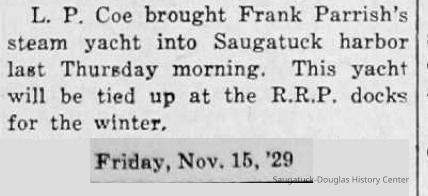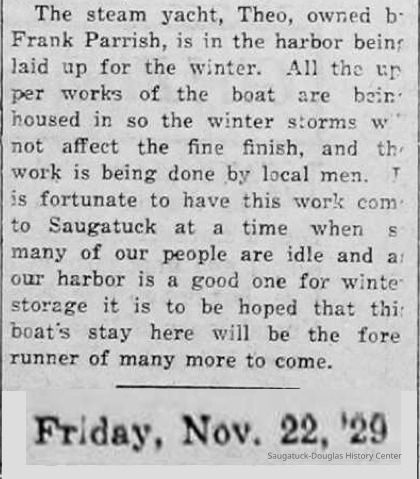 "The steam yacht, Theo, owned by Frank Parrish, is in the harbor being laid up for the winter. All the upper works of the boat are being housed in so the winter storms will not affect the fine finish, and the work is being done by local men. It is fortunate to have this work come to Saugatuck at a time when so many of our people are idle and as our harbor is a good one for winter storage it is hoped that this boat’s stay here will be the fore runner of many more to come."