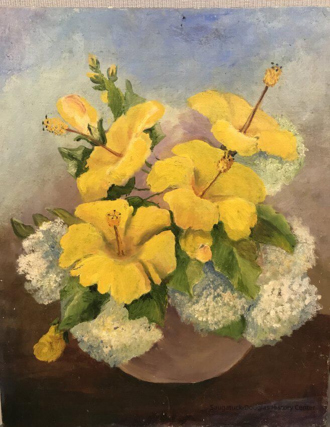An oil painting on board, titled, "Yellow Hibiscus and Lace Blossom" 16"w x 20"h painted by May Heath in 1956.Collection