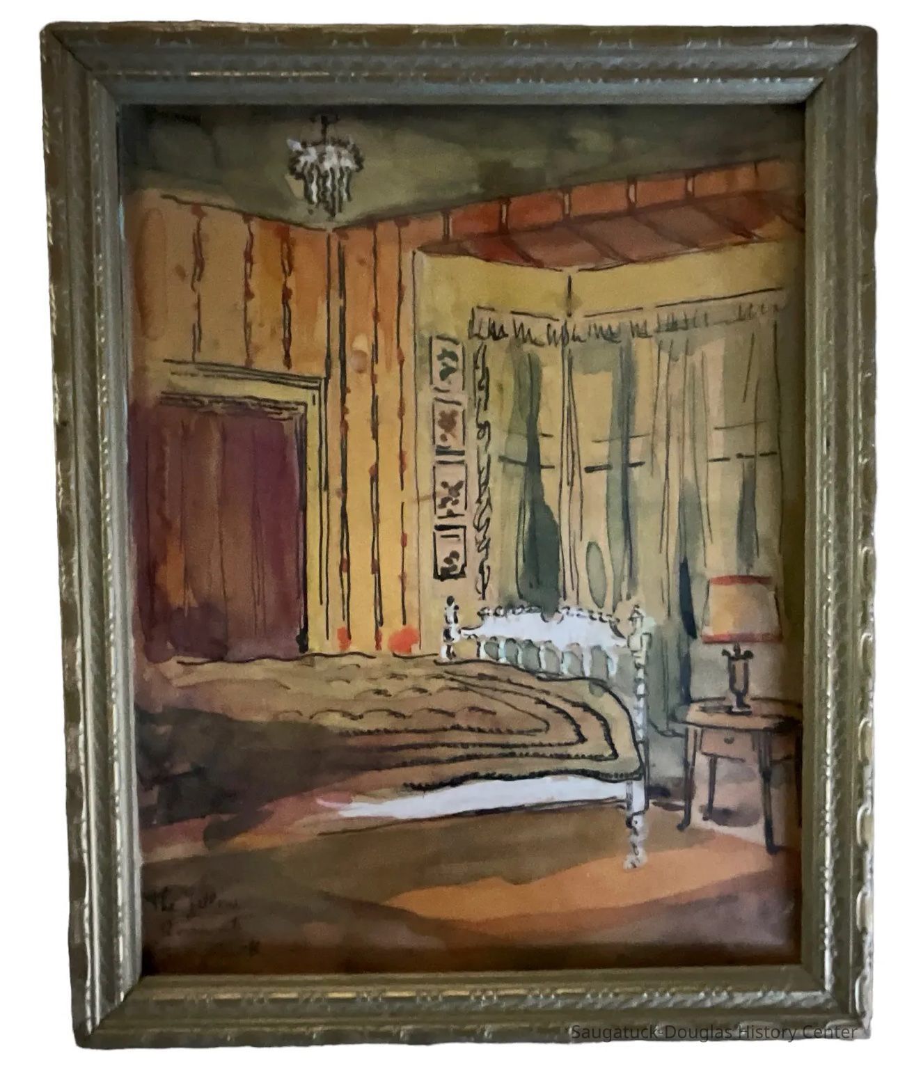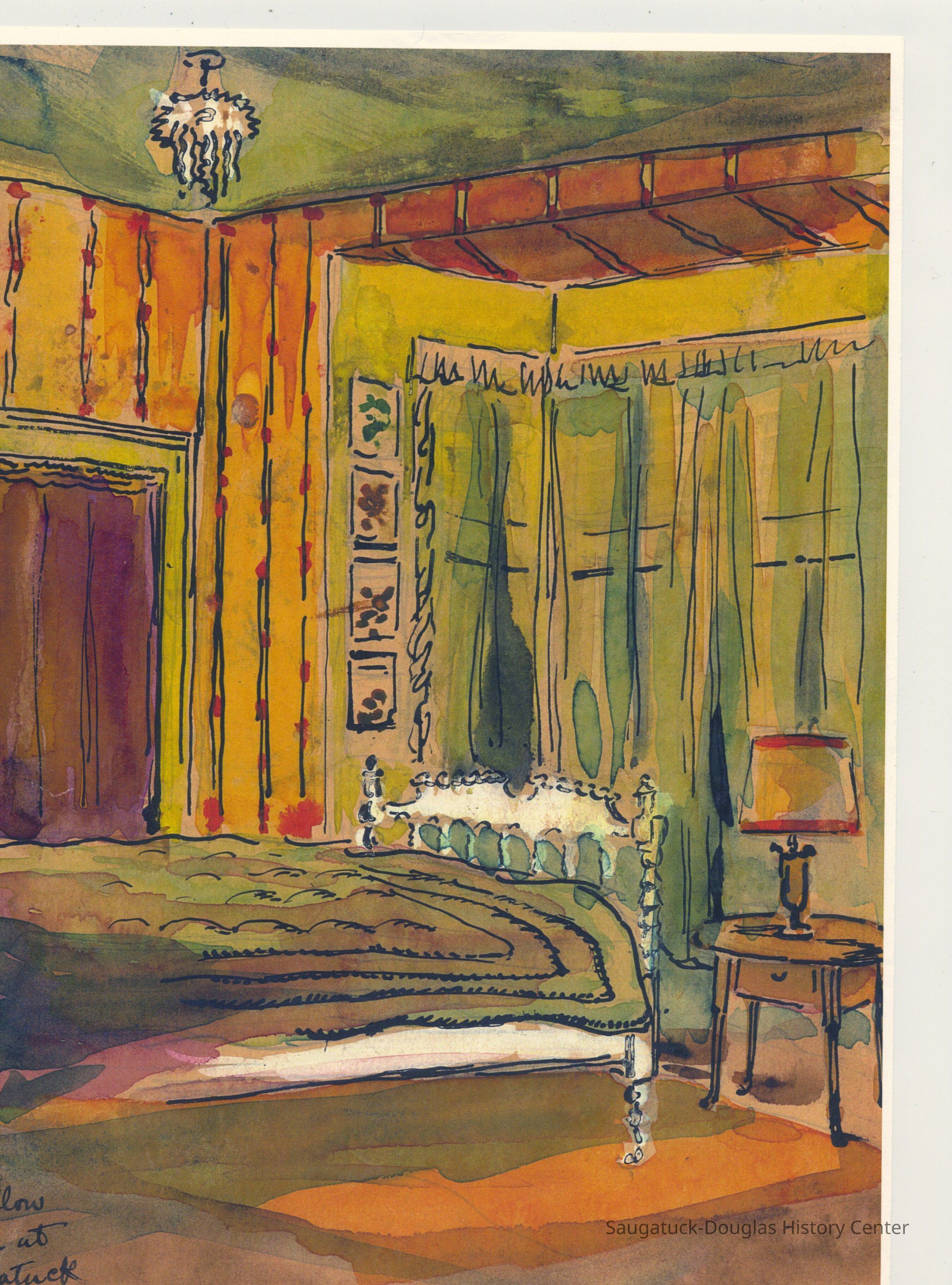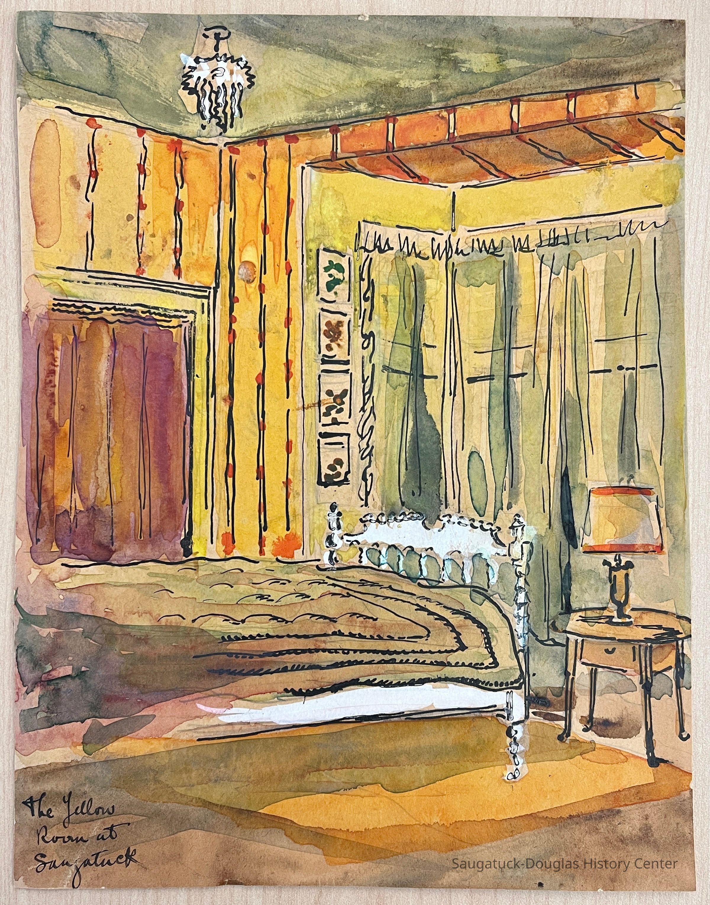 Watercolor painting of a bedroom with yellow, striped walls and green curtains in a bay window. The chandelier and the spindled bed frame are enhanced with opaque white paint. On the bottom left corner "The Yellow Room at Saugatuck" is written on the painting.