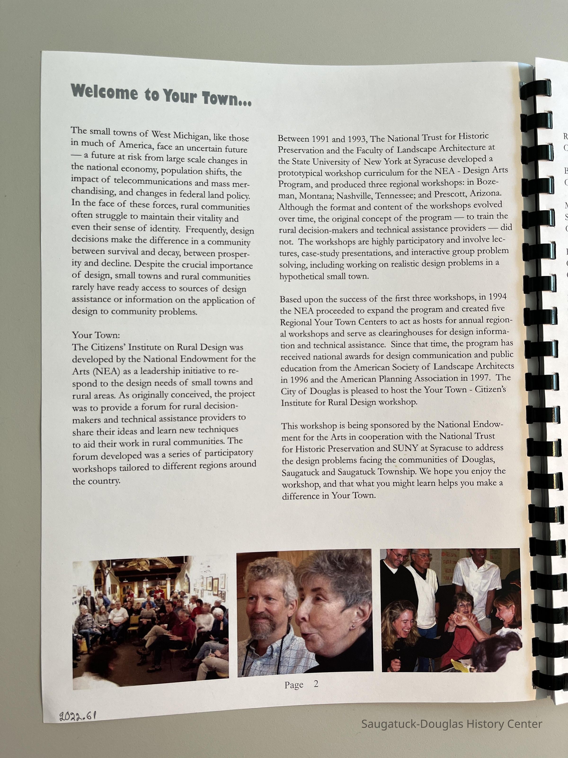 "Notebook on Rural and Waterfront Design for Douglas, Michigan" Black-comb-bound, 89-page, notebook produced by the Citizens' Institute on Rural Design for a workshop that occurred on August 11-13, 2010. The workshop was presented by John Berry of Douglas Design West.