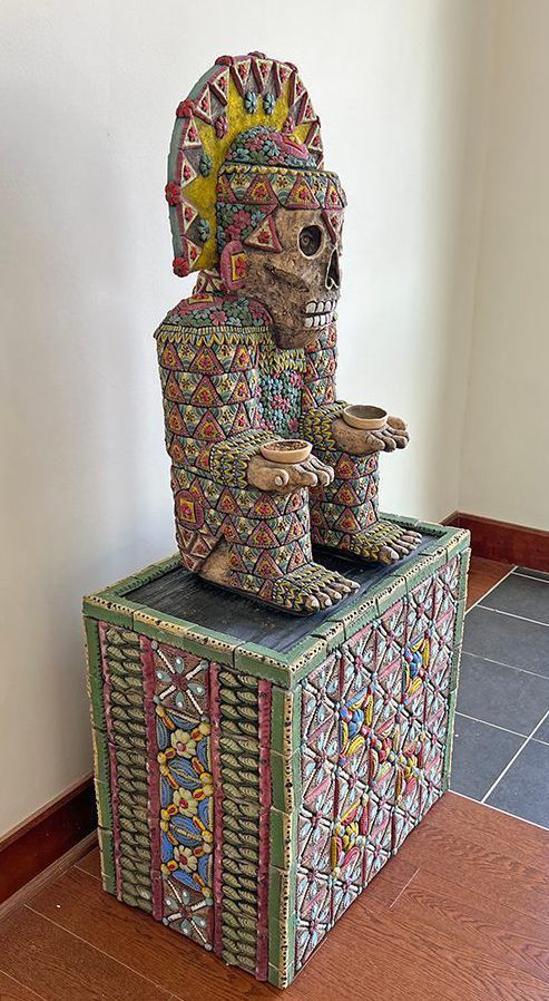 Gathering Altar with the Aztec god of death, ruler of Mictlan. Created during the height of the Covid-19 lockdown in 2020, Mictlantecuhtli provided a space for people to see their community transition into another realm. The figure holds two bowls, one on each hand, each containing the potential to give and receive. The figure sits on a pedestal adorned with tiles made in community at the artists studio. Born and raised in the border city of El Paso, TX, George Rodriguez creates highly ornamented, ceramic sculptures, often underlined by a connection to sociopolitical themes. His guardian figures, tomb sculptures, and installations, commemorate and build community. His sculptures are part of the collections of the National Museum of Mexican Art, Chicago, IL; Renwick Gallery of the Smithsonian American Art Museum, Washington D.C., and the National Museum in Stockholm, Sweden amongst others. Rodriguez holds a BFA from the University of Texas El Paso and an MFA from the University of Washington, Seattle.