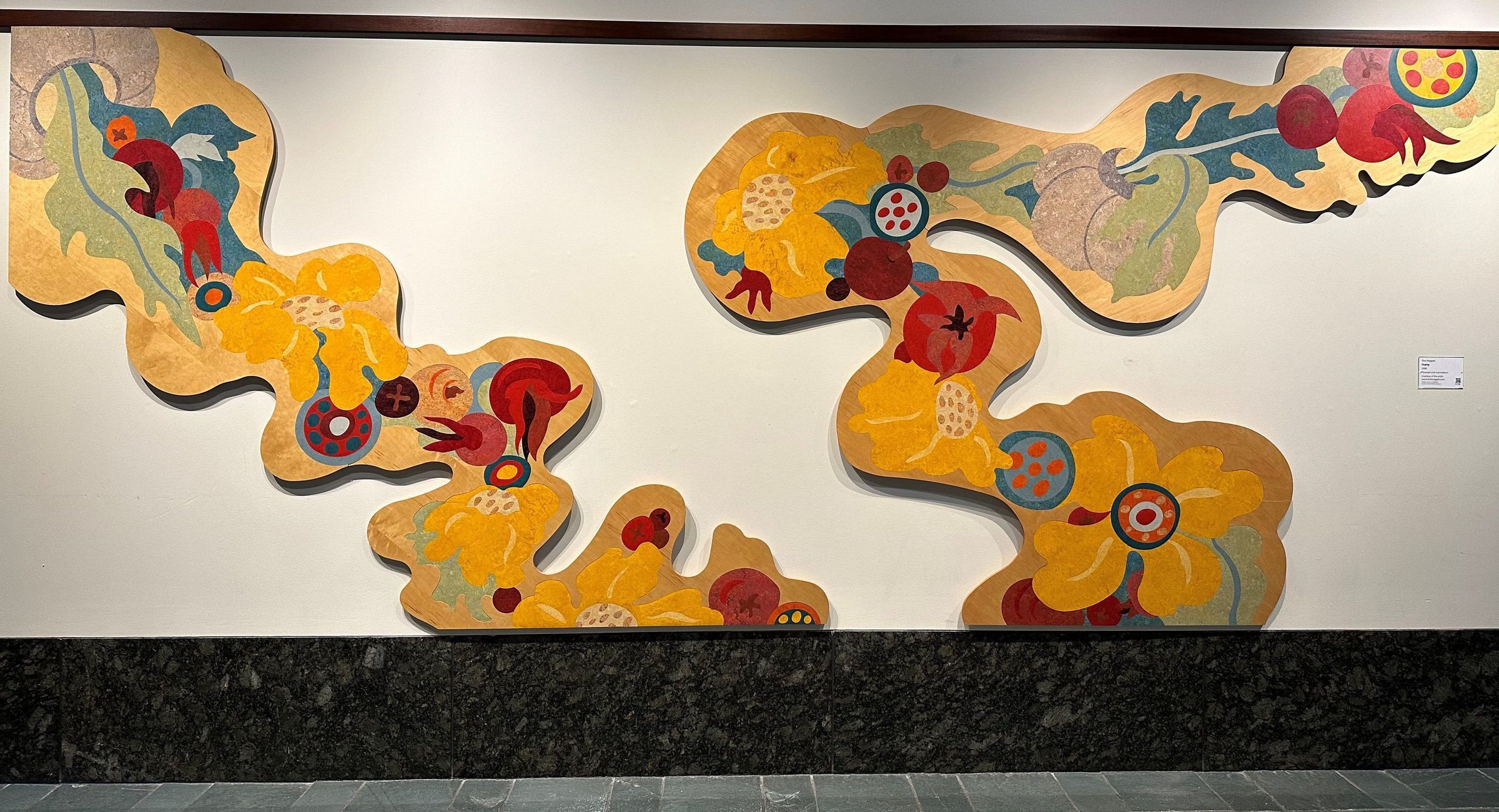 This flowing mixed media mosaic, made from linoleum cut into floral, foliate, and berry shapes, seems to grow out of the wall. The linoleum pieces are interlocking and arranged on a wooden support. Created specifically for the Seattle Convention Center, the mosaic provides a sense of nature with its colorful elements for visitors who pass by.