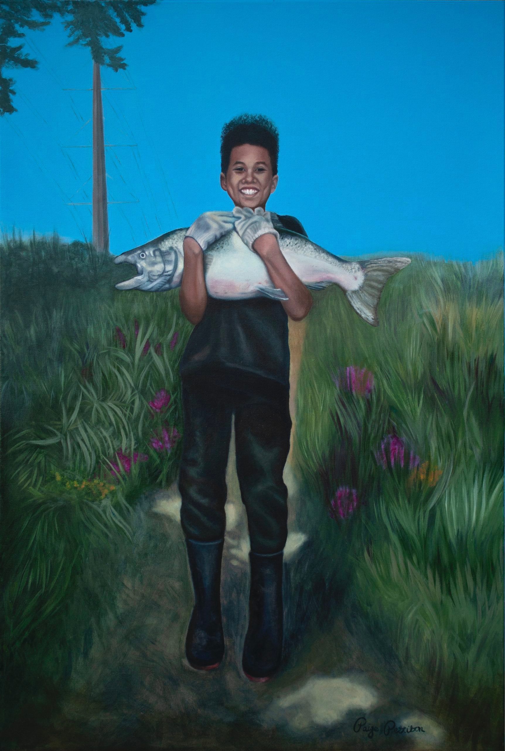 The subject is the artist's nephew, Amani Hayward. He is Black, Mexican and proud Puyallup Tribal Member who is a culture keeper who speaks Twulshootseed. He hunts, fishes, drums, dances, and tells stories. This painting captures Hayward's first experience fishing the same river as his ancestors.Label