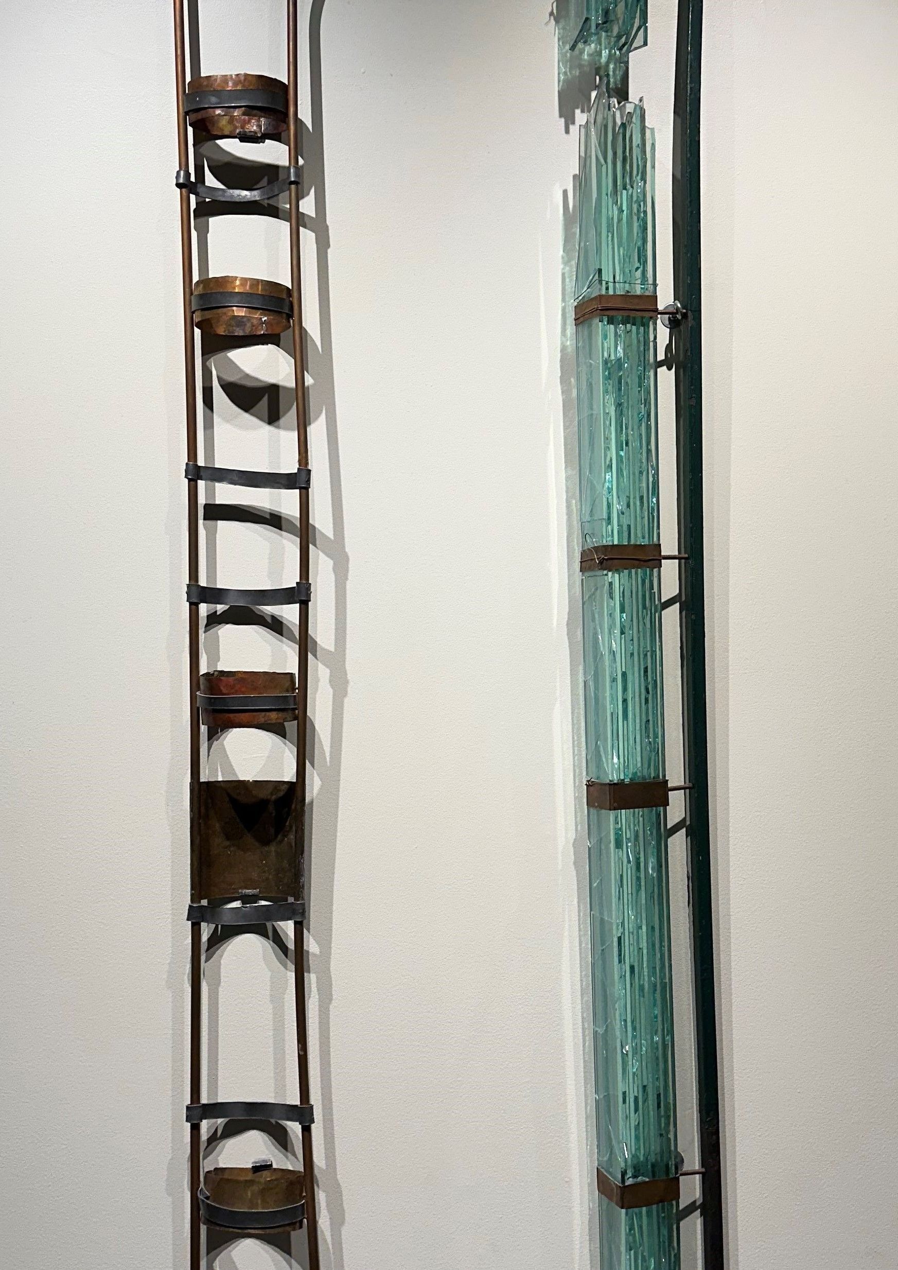 Assemblage of glass shard panels juxtaposed with a copper and steel construction.Type of Sculpture