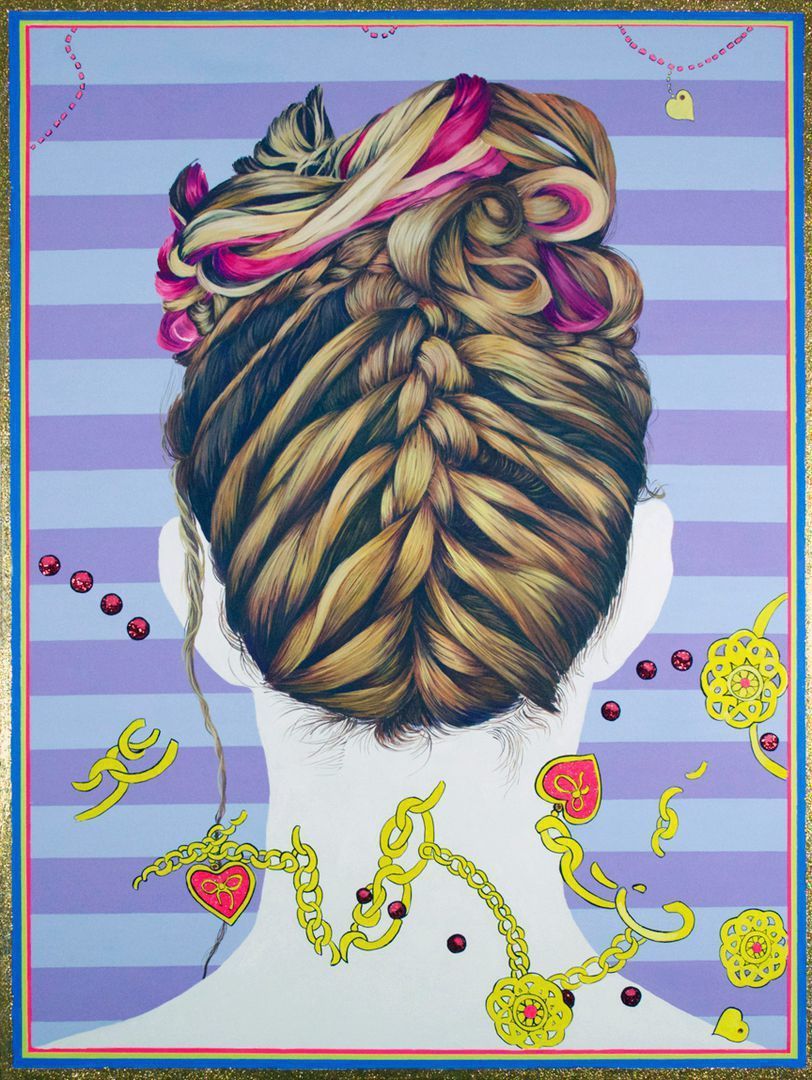 One of the primary bodies of work that I have been producing since 2009 is a series of self-portraits. These works represent that fleeting moment in time when my biological sex has not yet compromised my gender identity and anonymity may still be achievable. Interacting with viewers in a manner that echoes the power relationships that confront me during my day to day existence, these works reflect a real dichotomy present in my life between a desire for validation and a fear of exposure. Vanity, scopophilla, and notions of rebirth all play valid roles in my artistic practice. Though its visibility is reduced only to the recognition of process, the camera is of paramount importance as both a chronological documenter and source of mirrored identity. As a trans woman, the utilization of hair as the major vehicle of my visual vocabulary is extremely purposeful since it allows for the investigation of complex issues within a seemingly non-confrontational aesthetic realm. When the viewer transcends the layered textures and beautiful colours of the work’s surface they are offered an opportunity to question the use of hair as a social tool of gender construction and cultural currency. The works in the Transitioning Identities - Back of My Head and Brows and Bangs series converse with the gaze of the viewer in both passive and active manners.