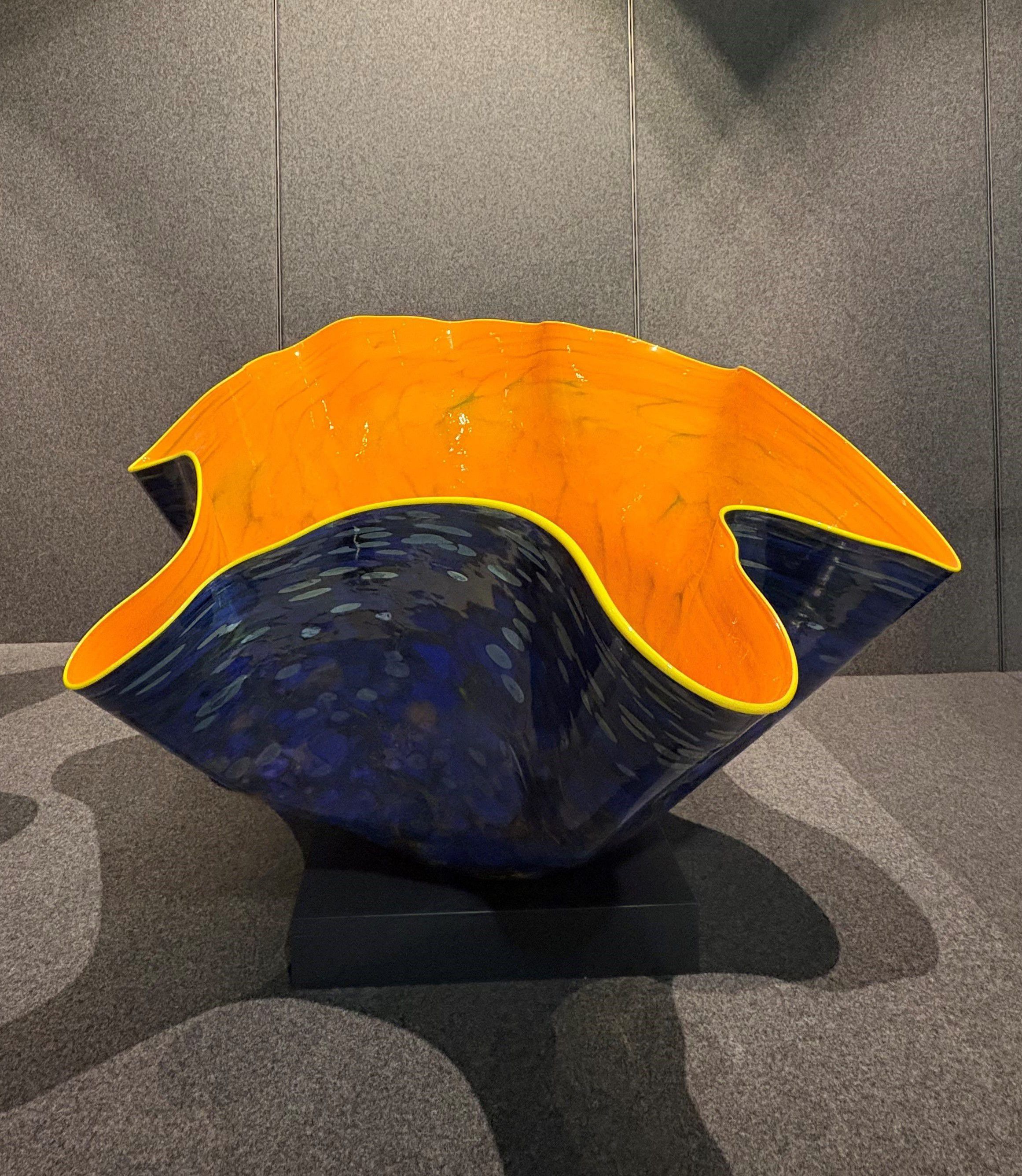 Inspired to use all 300 colors in his hotshop, Chihuly explores unexpected color combinations with the Macchia series. Chihuly adds brightly colored spots (Macchia is Italian for spot) for a speckled effect, and pushes the possibilities of scale to create pieces up to four feet in diameter.
