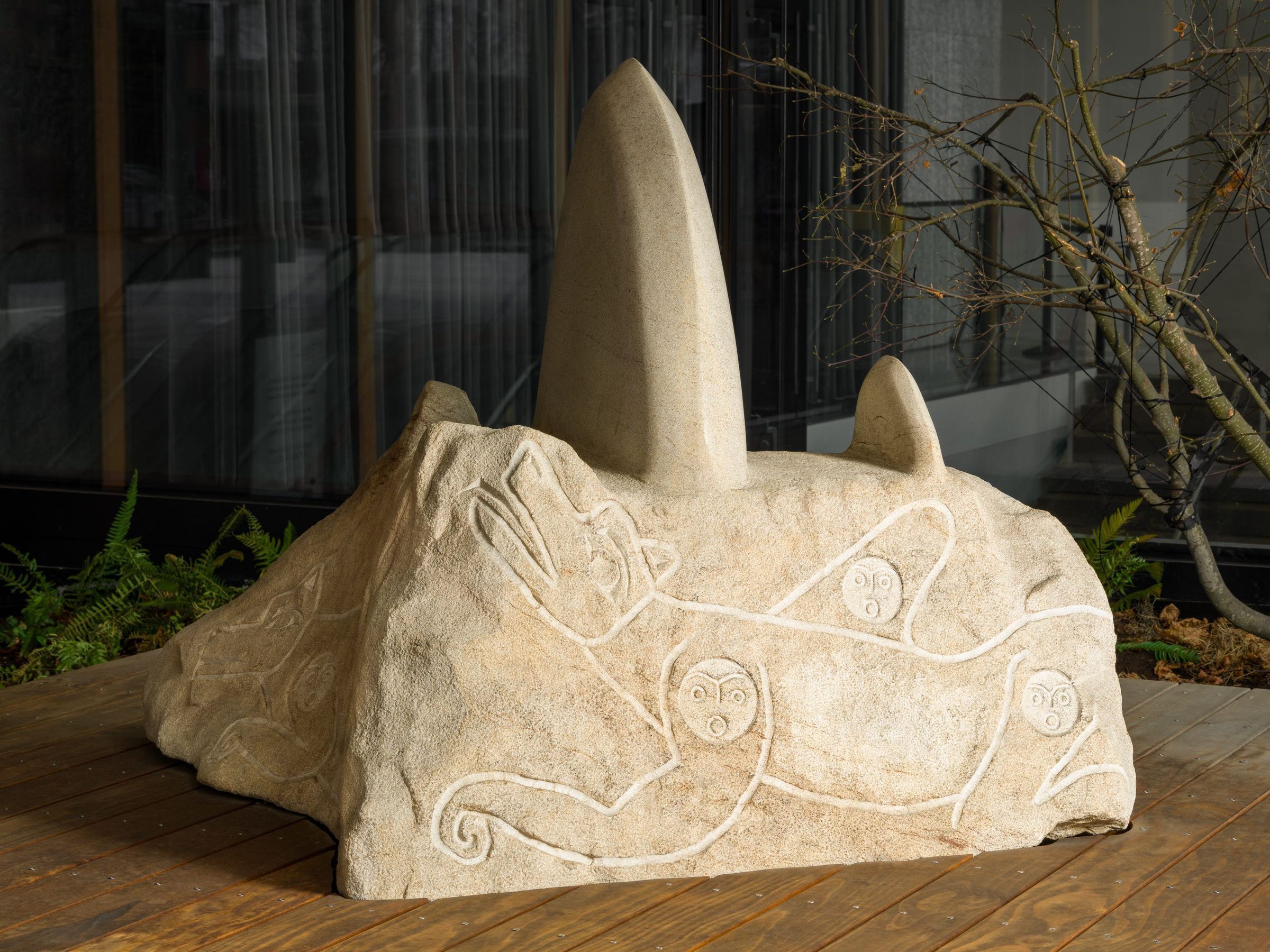 Imagery: Seawolves with Salish spirit faces on the petroglyph. Out of the petroglyph base, you can see 2 Orca fins a mother and child emerging.