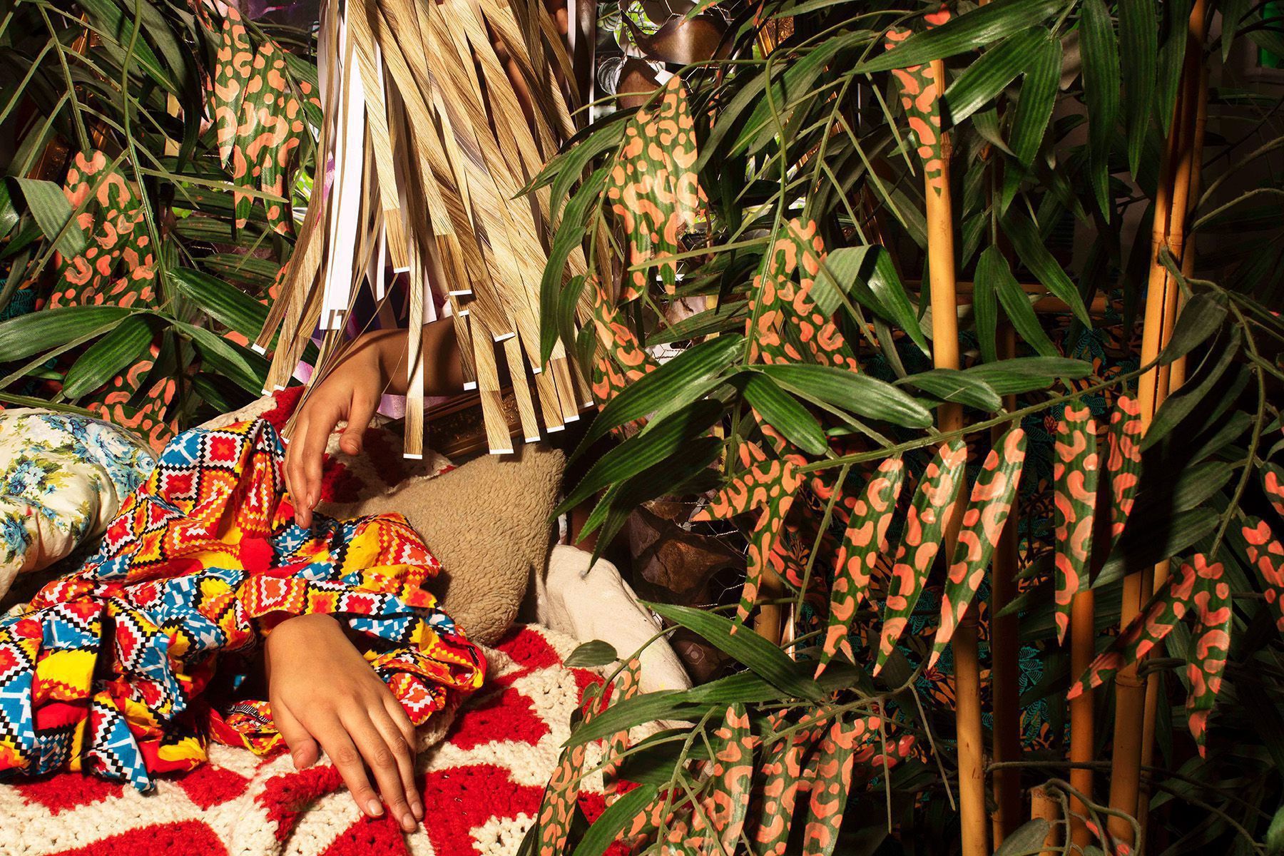 King's work is inspired by her experience as a mixed-race, queer womxn, from a small, predominantly white community. King explores themes of identity, power, and perception through vibrant textiles, plants, and paper covered figures in dystopian settings and misleading backdrops.