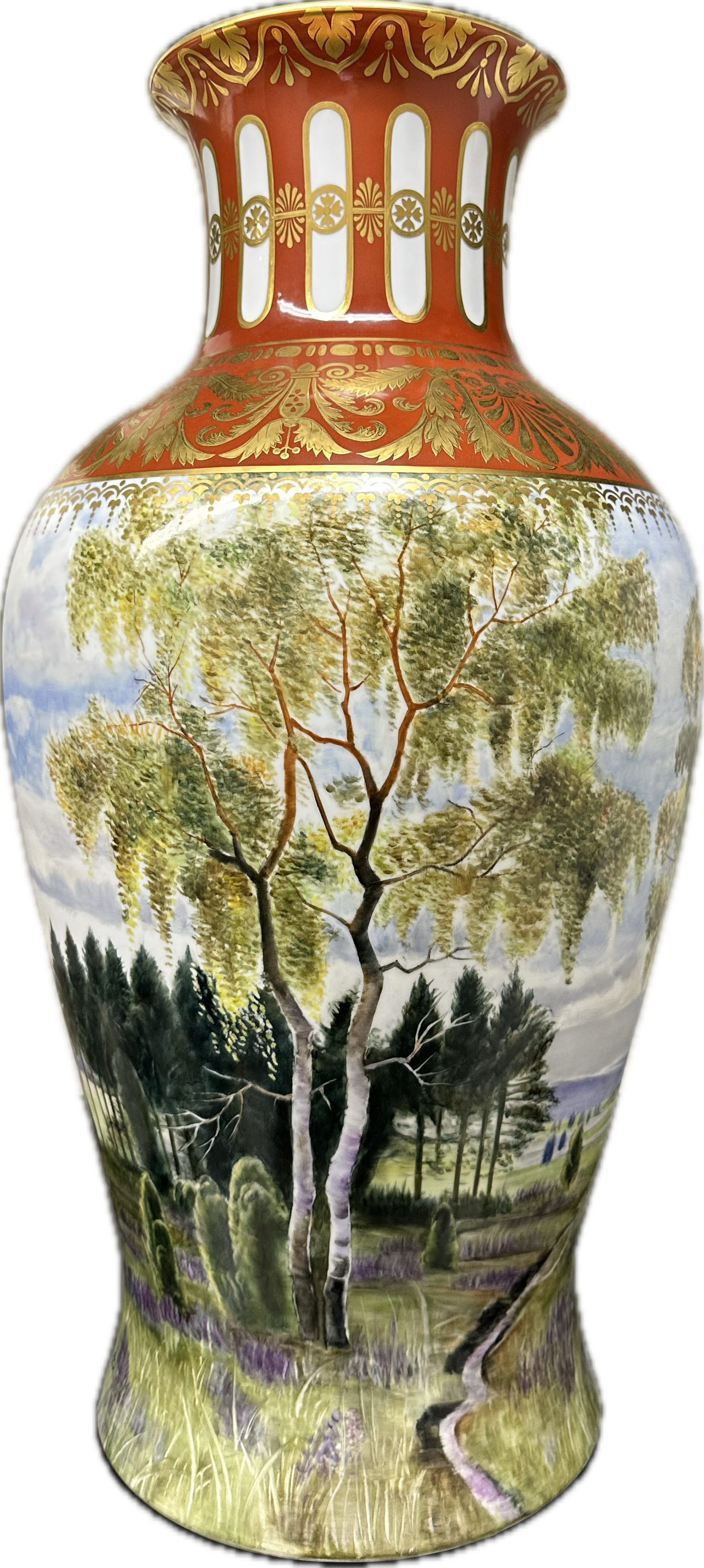 Oversized table vase, depicting a hand-painted scene of the Skagit River valley with Pine and Alder trees along its banks. The presentation base plaque reads; "Presented ''to The People Of The State Of Washington By Noritake Company And The Bon Marche On The Occasion Of The Centennial Celebration Of Washington State, November 1989."