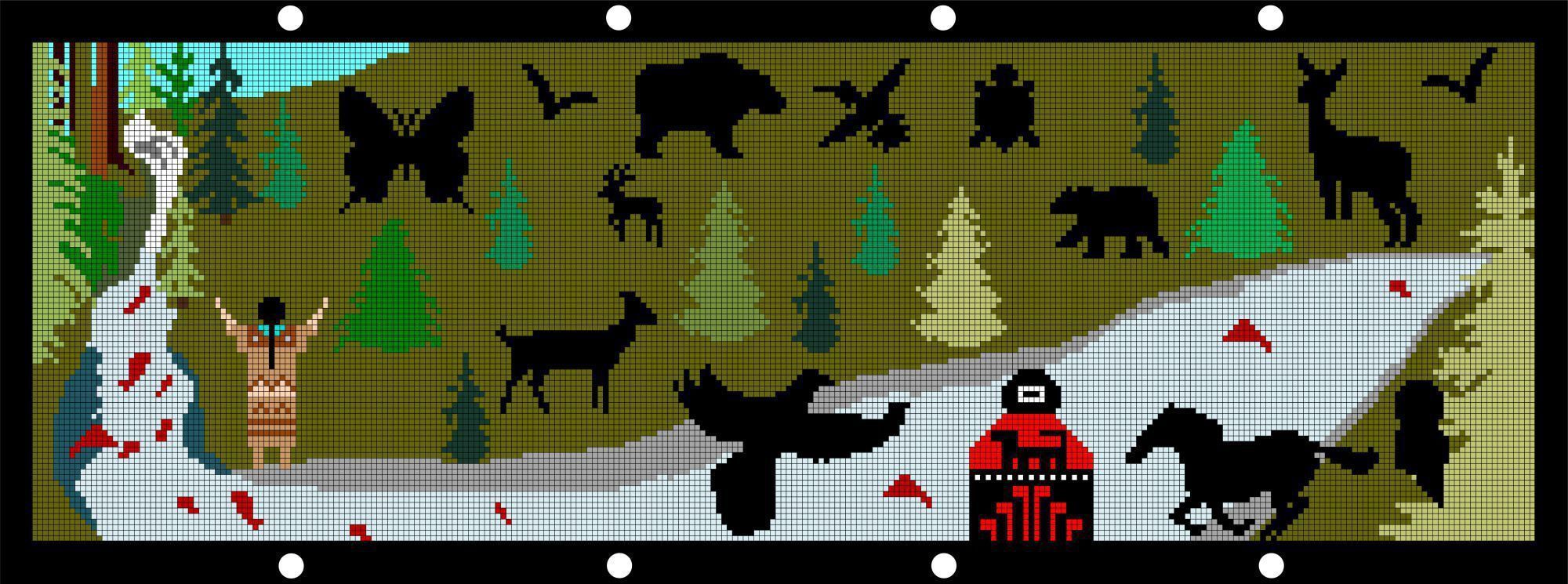 This is an MS Excel bead graph design. I worked on it for a year, completed in the spring of 2021. I saw a photo of Sol Duc Falls and wanted to create a bead design of the waterfalls. I thought of my mother (Bertha) talking about Tamanawas when I was growing up. Her stories motivate and give me ideas for designs, she's present when I create designs from her stories. The stories she shared were from Frank Allen, her grandfather. This art piece is from an idea to design a composition of a flat beaded bag with a landscape of animal spirits with trees, water, and landscape. (Instagram)