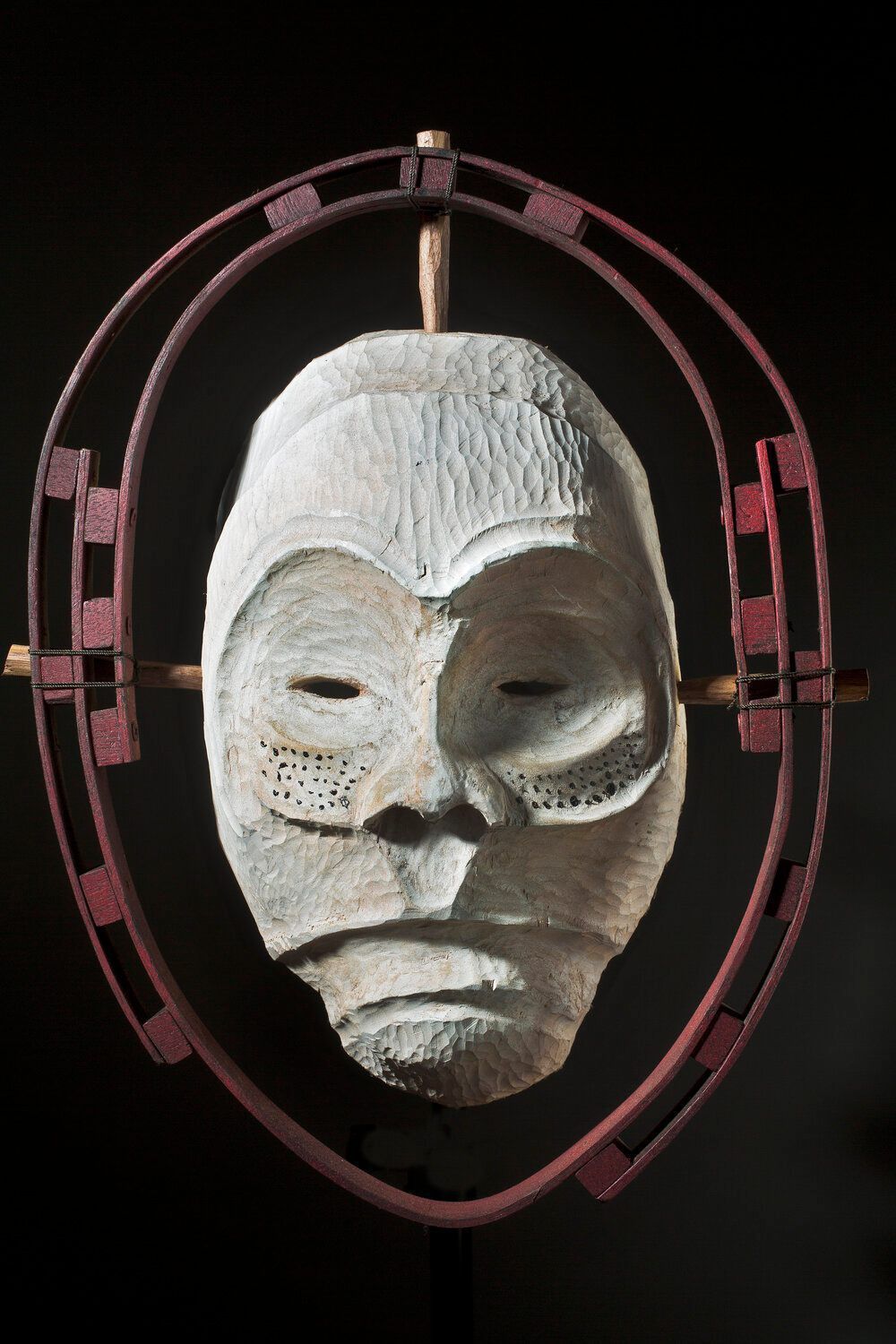 This mask is a depiction the relationship of the snowy owl and Iñupiat to the arctic lands. The owls main food staple, lemmings, are threatened by climate change because they need deep fluffy snow to insulate them from the elements of the harsh arctic winter. Lemming population numbers are dwindling under this new pressure and the owls existence is also being threatened because the lemming are a part of their primary diet. Humans are facing a similar fate and our Indigenous food systems are under a similar pressure.
