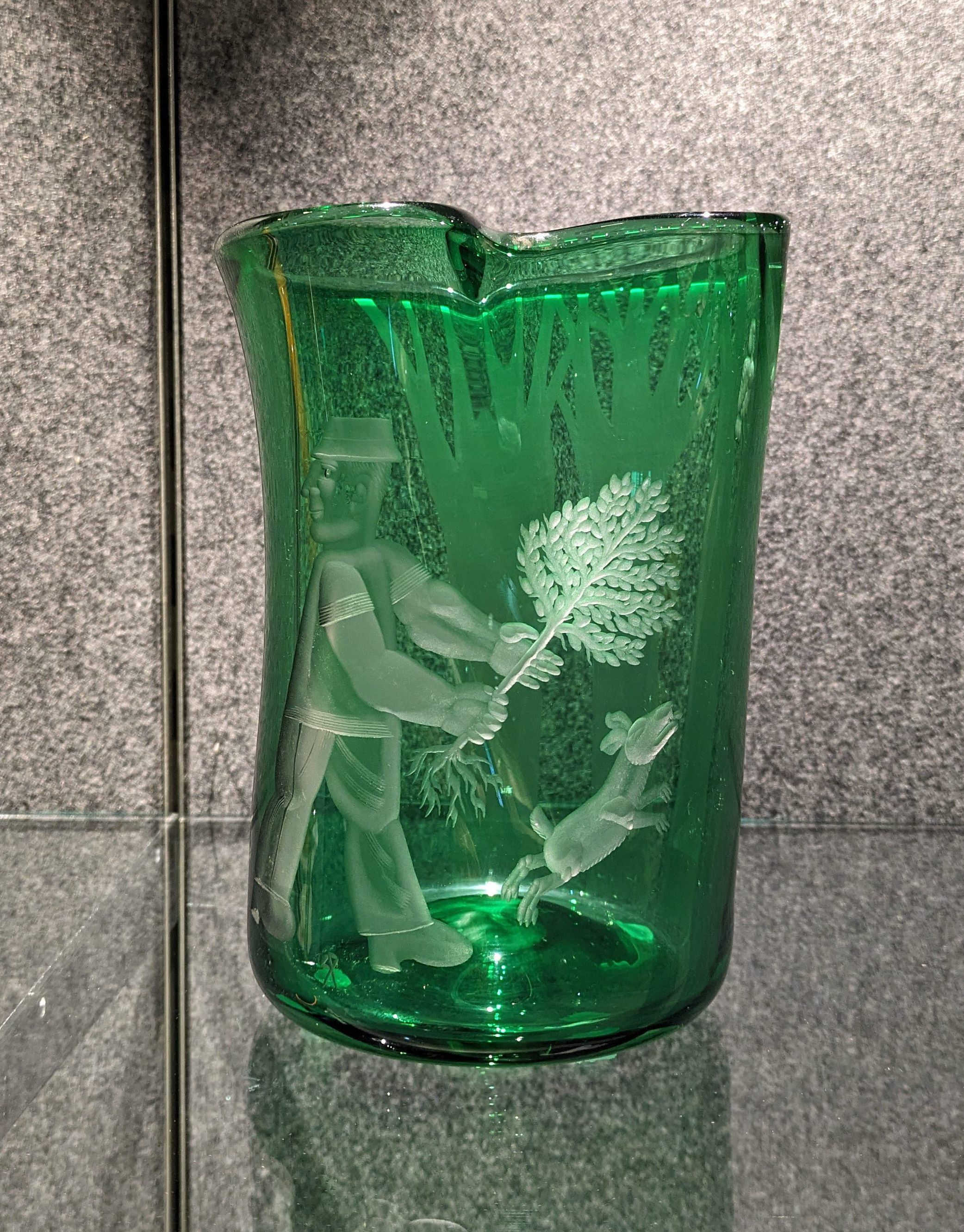 Blown glass with engraving, free-form, on green glass vessel. The engraving depicts the artist, a man wearing a hat, carrying a recently uprooted tree, walking in the wood with his terrier, while observed by a harpy sitting in a tree. Trees are engraved on the back of the vessel.Type of Sculpture