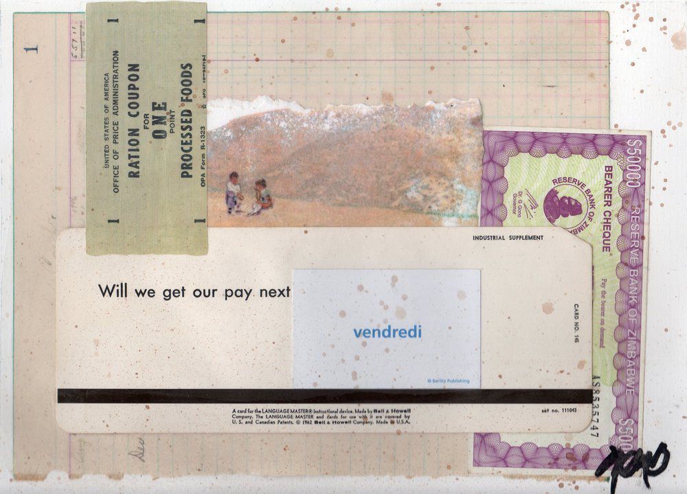 A meditative piece on the pandemic’s economic impact. Two children play amid symbols of work, in a collage built from the artist’s family archive, vintage currency and paper ephemera.