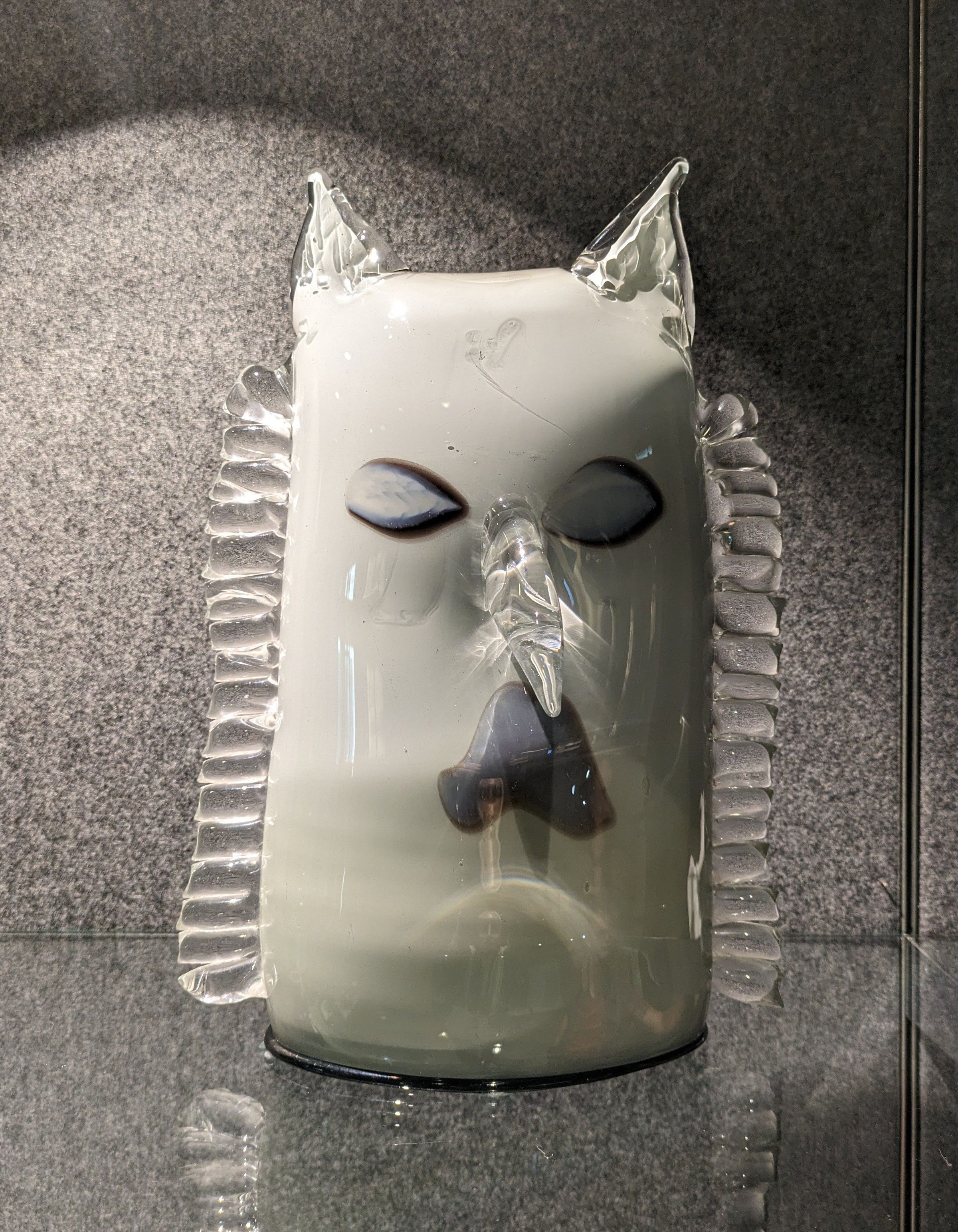 Paul Marioni is a self-taught glass artist who employs figurative imagery to explore human experience and spirituality. His work is about human nature and is inspired by his dreams. He uses inventive techniques in service of the image. Blue Bagman both entertains and threatens, with devilish ears, and tentacled arms reaching out.