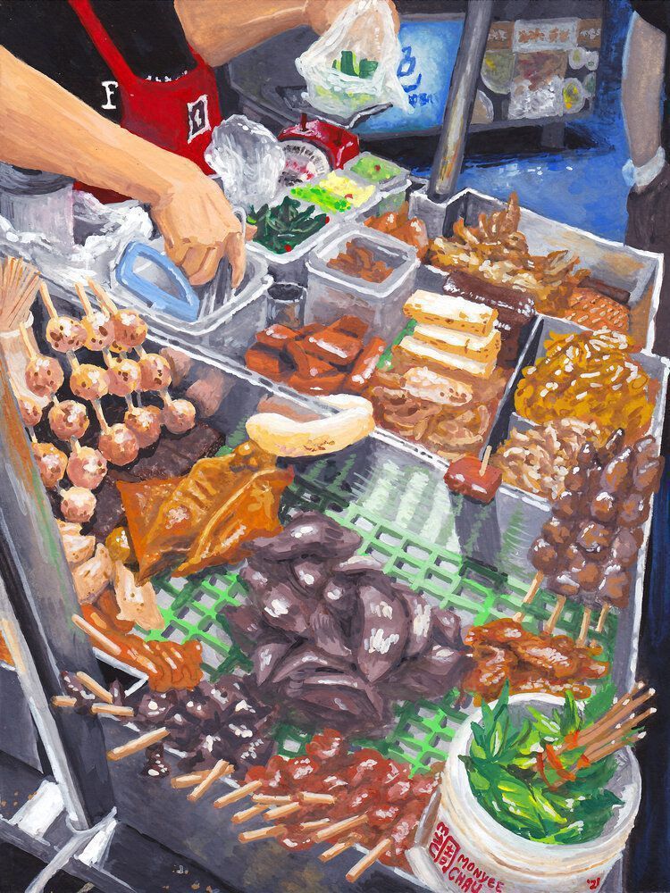 Digital print of a gouache painting on paper, depicting a Taiwanese street vendor using tongs to collect food into a bag, over food cart, with many containers full of meat balls, rice sausages, skewers and basil.Type of Print