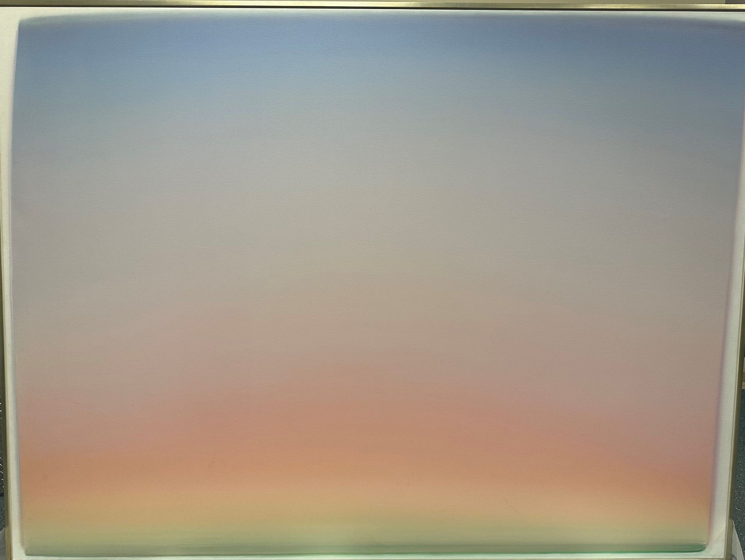 Sky-scape painting, comprised of horizontal bands of blended color, with subtle color shifts from blue at top, light blue, blush, orangey pink, yellow, down to green at the horizon line.Type of Painting