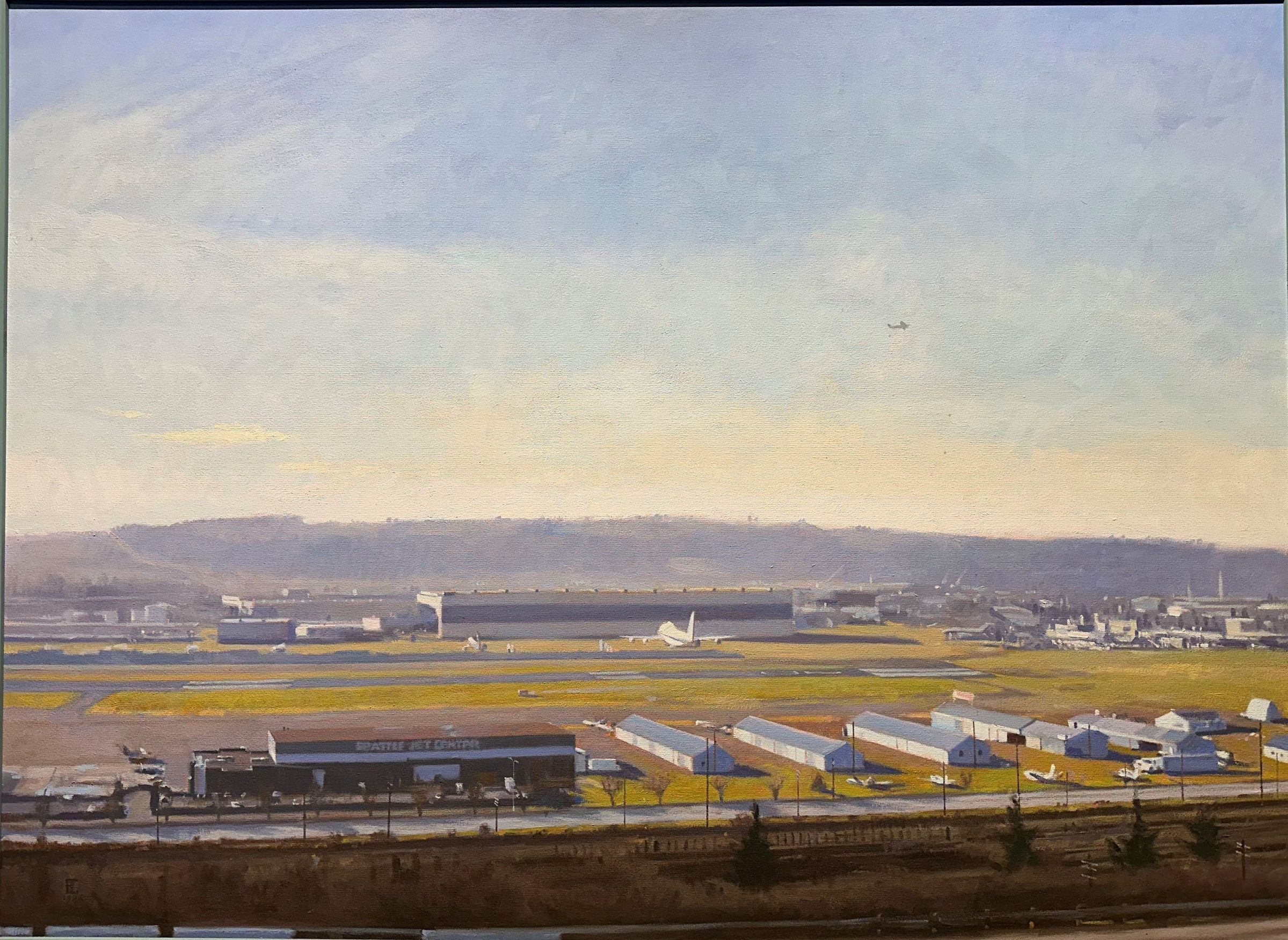 William Elston is known for painting urban and rural landscapes. This work was created "en plein air", painted on location outdoors, from the view of Beacon Hill looking westward over Boeing Field. The painting depicts the airfield, hangar buildings, parked planes, one plane in flight, with railroad tracks in foreground.