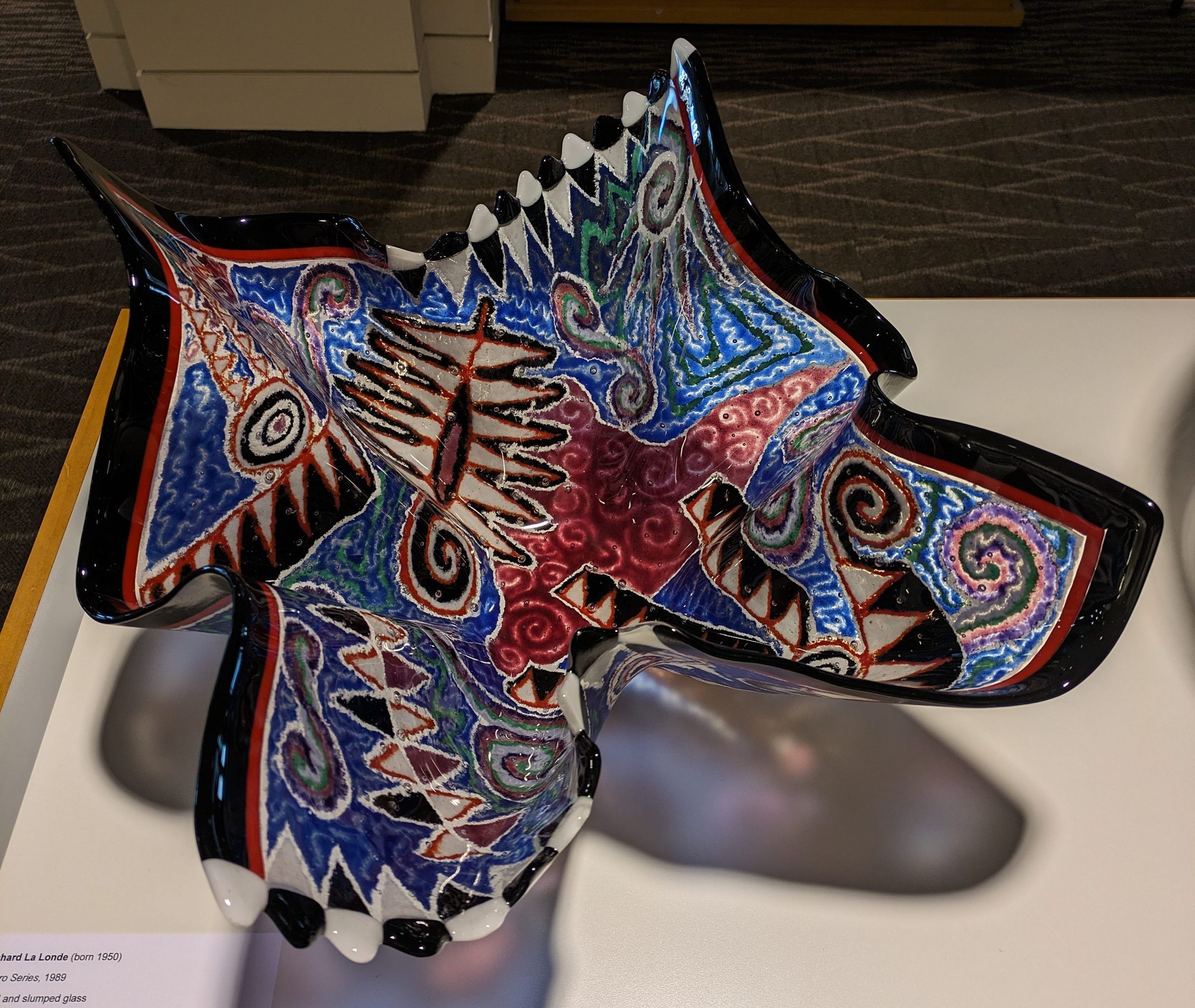 Richard La Londe creates fused and slumped glass vessels, decorated with crushed glass on clear sheet glass. The shape is achieved by heating glass in a kiln over a wavy stainless-steel mold until it takes shape. This example is a handkerchief shape, as if a colorful silk scarf became suddenly solid in the position where it fell.