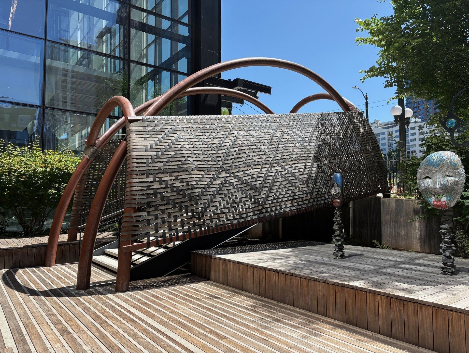 This large-scale mixed media sculpture encloses the stairway to the Pine Plaza, evoking the traditional shapes and weaving patterns of the burden baskets created and carried by Indigenous women throughout the world.Label