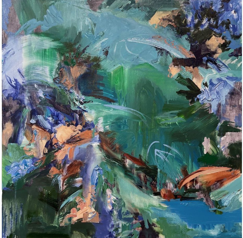 Oil on canvas, organic abstract painting in colors of blue, green, aqua and black.