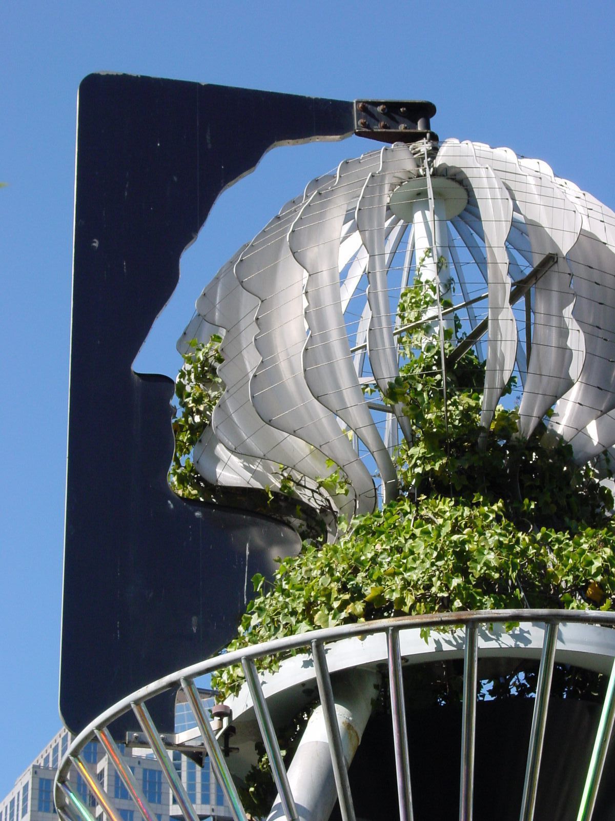 Seattle George Monument is a wind vane sculpture created by artist Buster Simpson. It features portraits of Chief Seattle and President George Washington. The central silhouette of Chief Seattle supports growing ivy. A cutout profile of George Washington moves with the wind around the sculpture. The artist notes, "The Indigenous culture is figuratively a foundation upon which the present is an overlay. The silhouettes are appropriated from both city and state government logos just as what was done with the name Seattle."