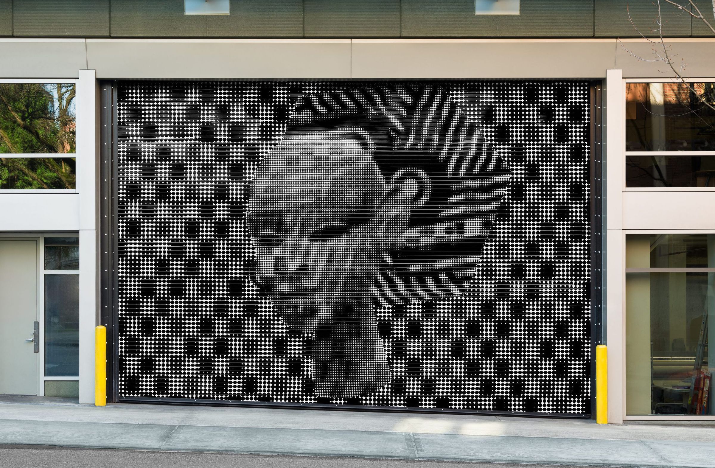 Originally a hand-rendered, mixed media collage, the figure in this composition is resultant of a photograph of one of the artist's sculptures printed on vellum and layered onto a hand-drawn Kente cloth pattern. For this iteration, the work has been realized as a digitized, large-scale print applied to the steel surface of the vehicle door. This work is a continuation of Alley-Barnes' decades long “exploration of Black figurative representation, ancestral veneration, and the continuum that is the eon-spanning Kemetic and African diasporic aesthetics.”