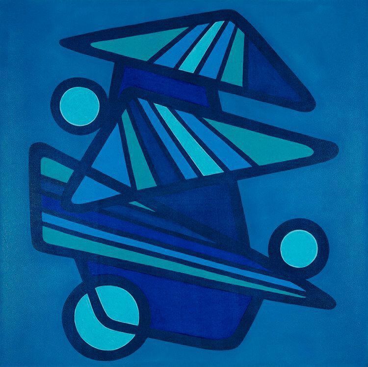 Acrylic on canvas, utilizing simple geometric forms of triangles, circles, and the shapes created between, rendered in shades of blue.Type of Painting