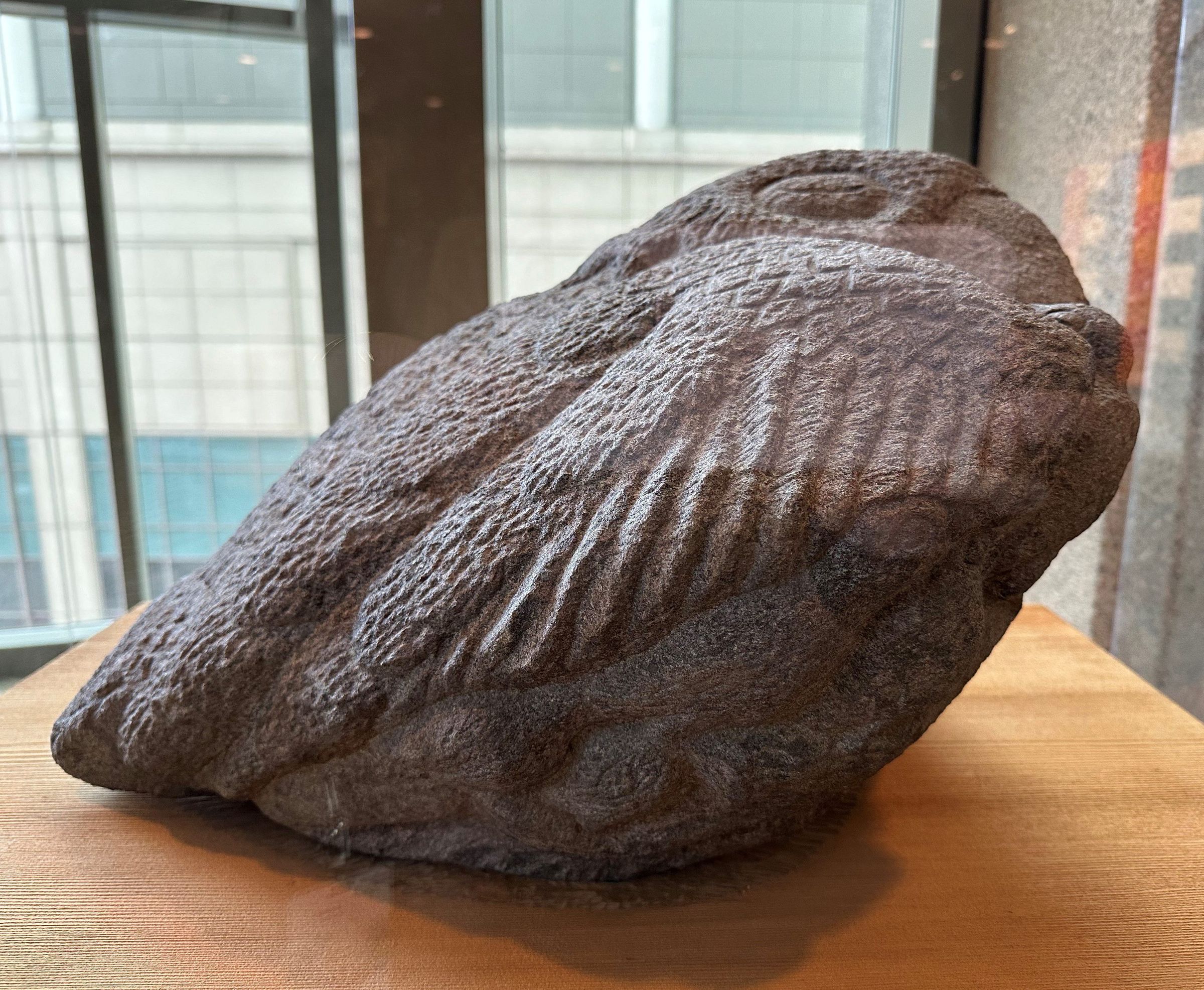 Granite sculpture of a nesting bird holding a protective wing over a brood of young birds.