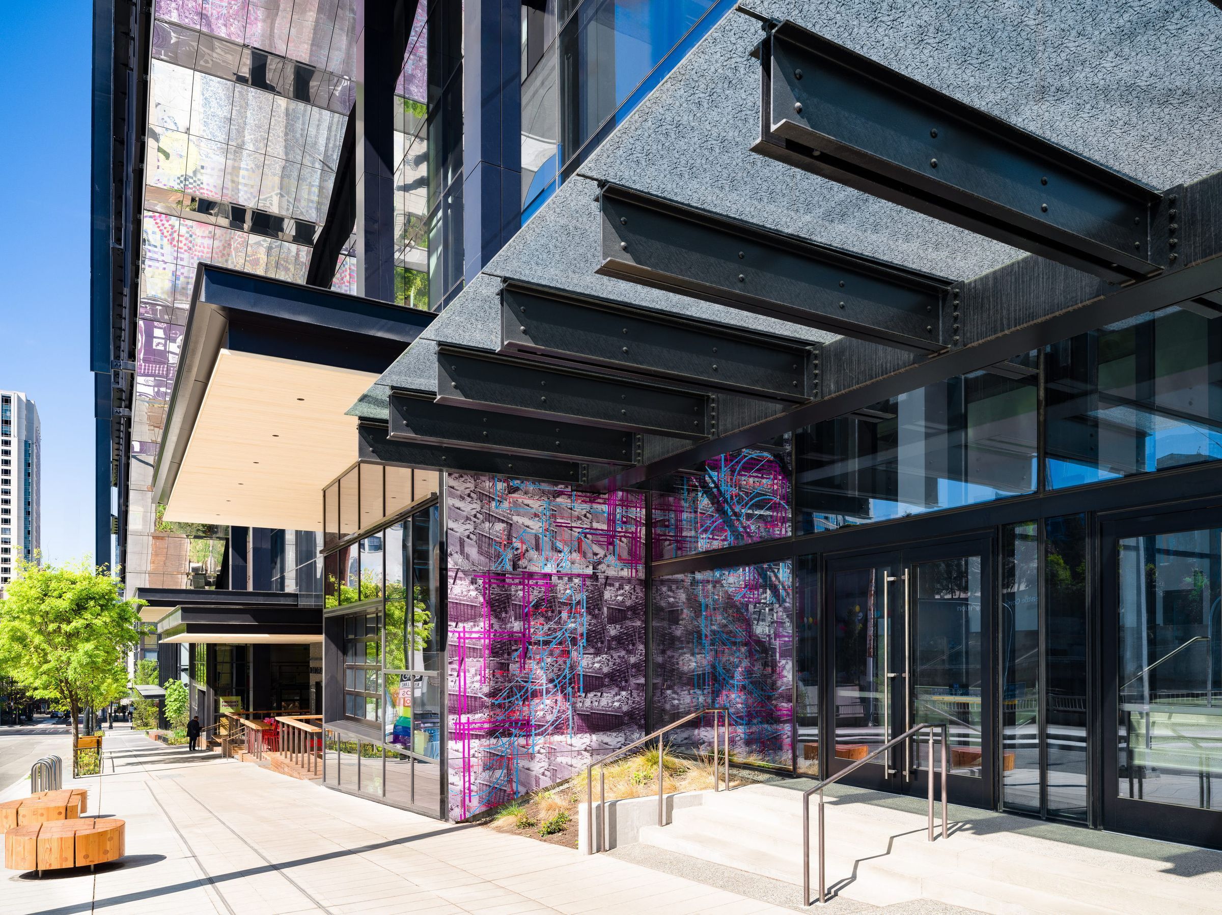The artist approached the creation of this mural in the same way that he approaches his everyday life in the city: by documenting the historical changes and events through art and color. Mariscal embraces moments of change and construction, seeing only a “beautiful chaos.” Influenced by his childhood in Mexico City, and its legacy of Mexican muralism, the artist realized that art is “not just a visual tool but a very powerful piece of knowledge and history that can change or question the way people or governments think and influence future generations.”