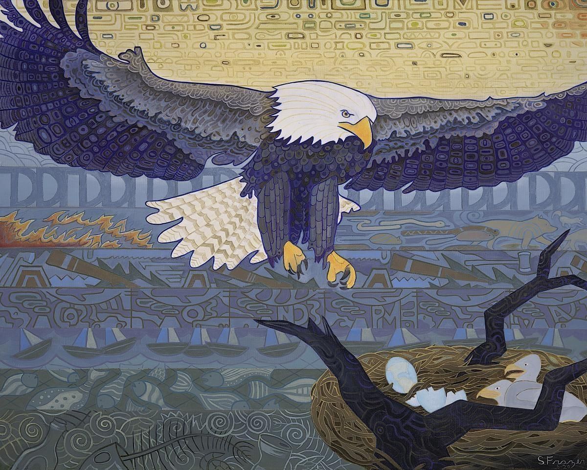 Eagles Nest portrays a world in distress, shaped by human‑driven climate change and relentless industrial expansion. Within the composition unfolds a visual chronicle of environmental threats—poisoned oceans, fractured food chains, polluted skies, deforestation, wildfires, the legacy of DDT, and more.