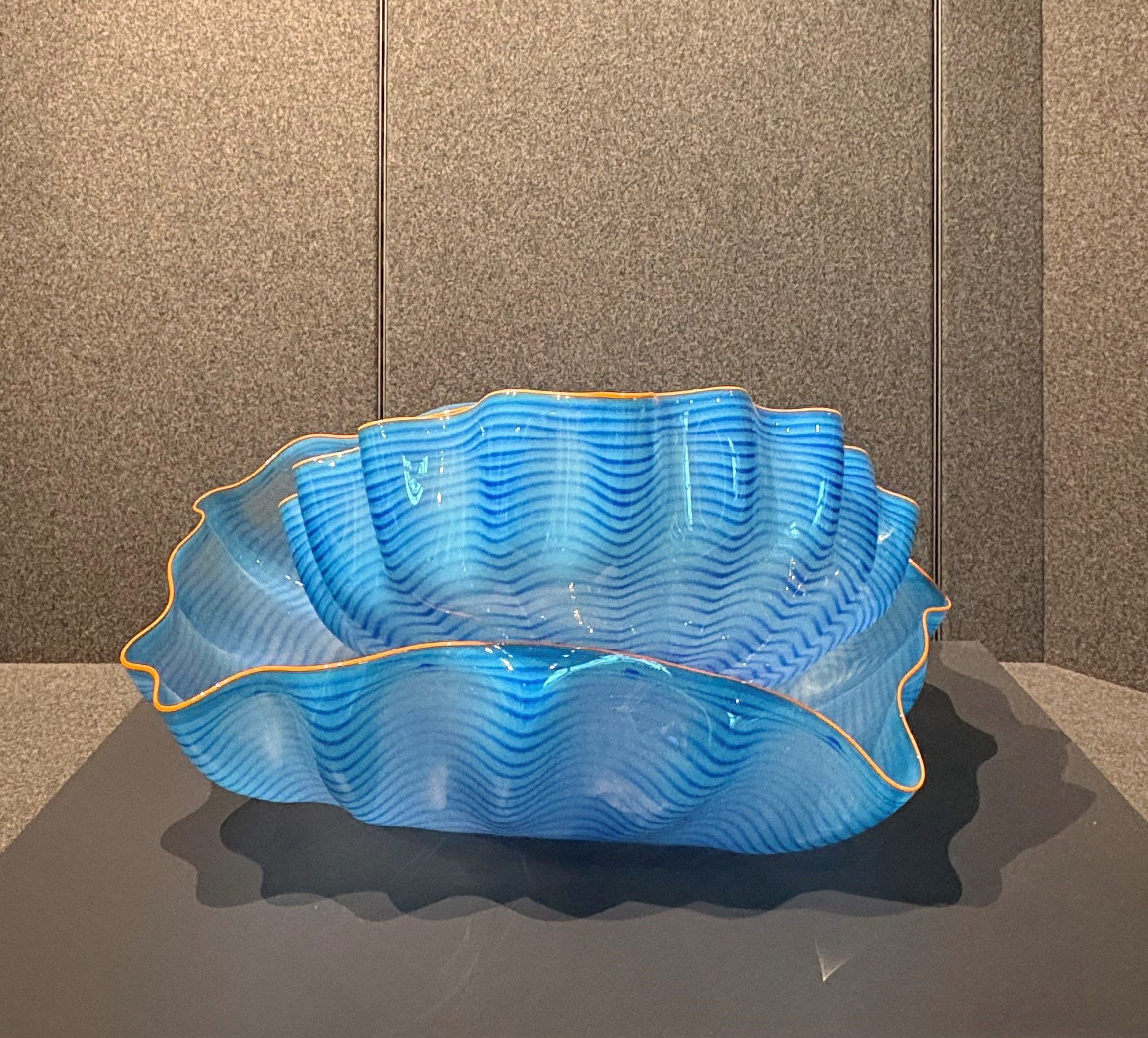 The Seaforms conjure up underwater life, but do not imitate it. The use of optic molds in the glassblowing process creates ribs that increase the strength of the thin-walled glass, and thin lines of color, known as "body wraps," emphasize their undulating form. They are often grouped in sets.
