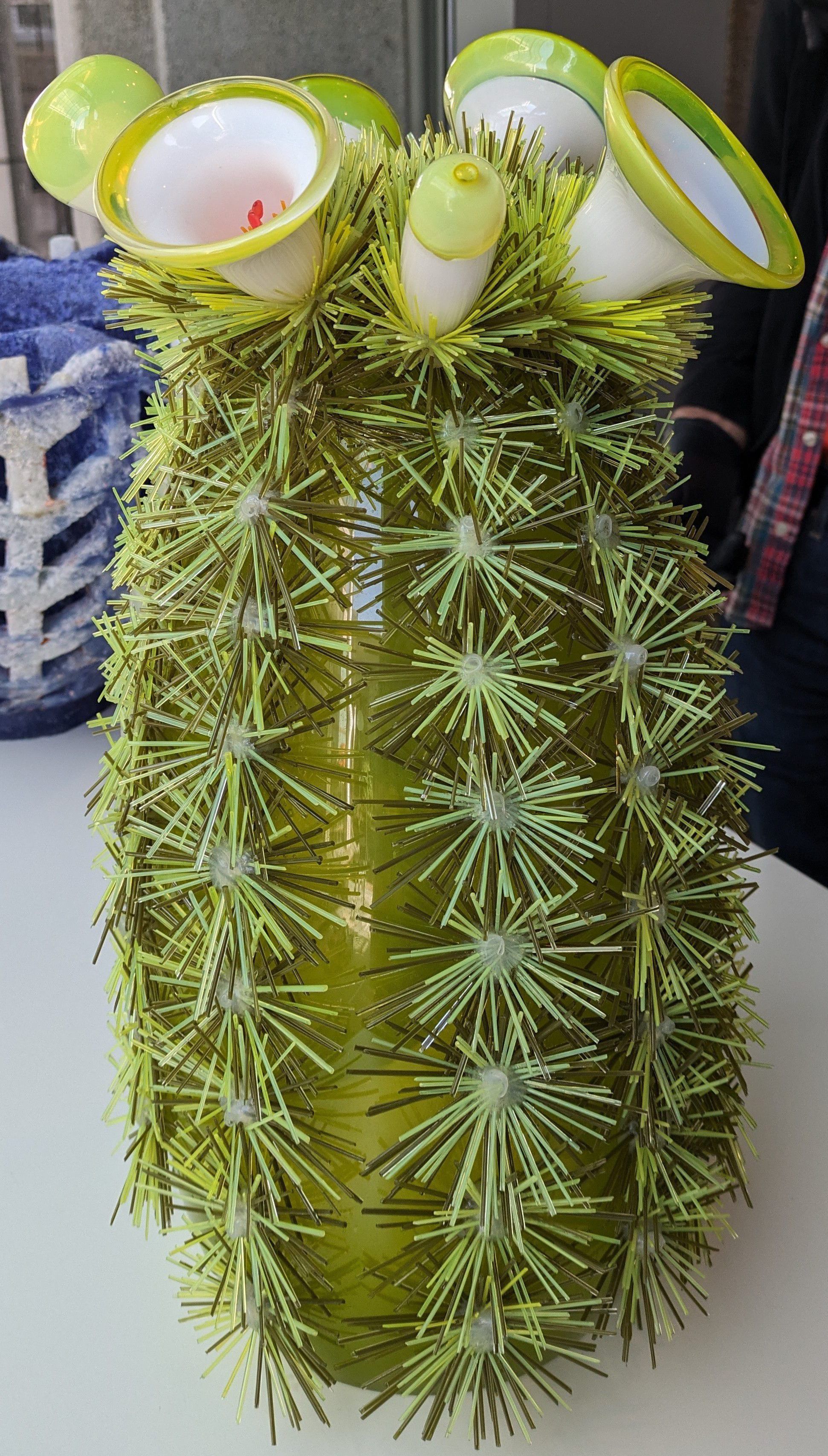Flo Perkins’s work takes inspiration from the native flora of her home state, New Mexico, including a variety of cacti and other plants. The artist views both glass and plants as having a similar technical process. In blowing glass, the bubble forms, then the opening and folding. Just as in the blooming of a plant, a flowers buds, then the blossoming and collapsing. This yellow, pincushion, cactus has vertical rows of needle clusters.