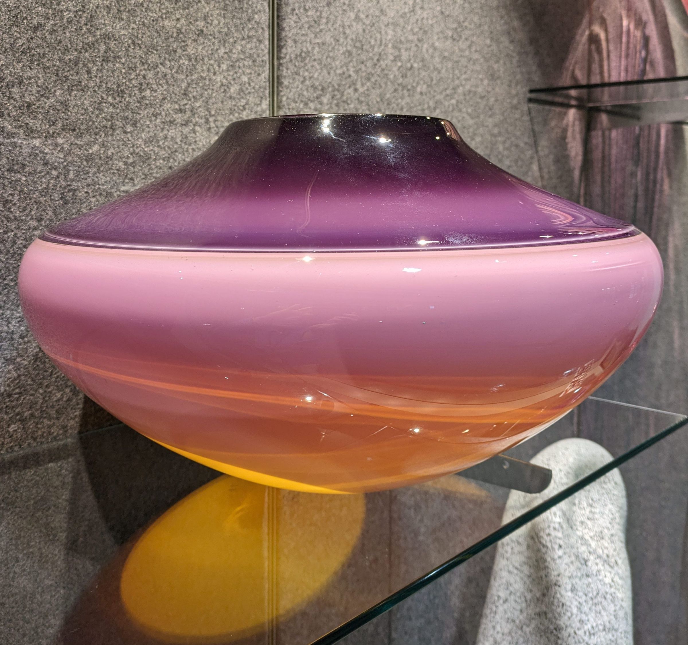 Sonja Blomdahl has devoted her career to experimenting with abstract layers of color through the vehicle of the vessel. Although her vases have classical proportions, their forms do not recall any specific historical shapes. Blomdahl always works in incalmo, an Italian glass working technique in which two or three bubbles of the same size are joined during the blowing process. In this example, violet and peach colors are joined together.