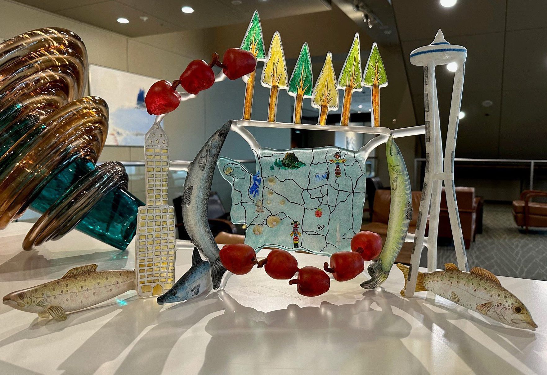 Ginny Ruffner creates sculptural assemblages through a site-specific vocabulary of images. The elements of this sculpture represent iconic and important aspects of the state of Washington. A map of Washington at center, bearing recognizable landmarks, is surrounded by fish of the Pacific Northwest, apples, pine trees, Seattle’s Smith Tower and the Space Needle.