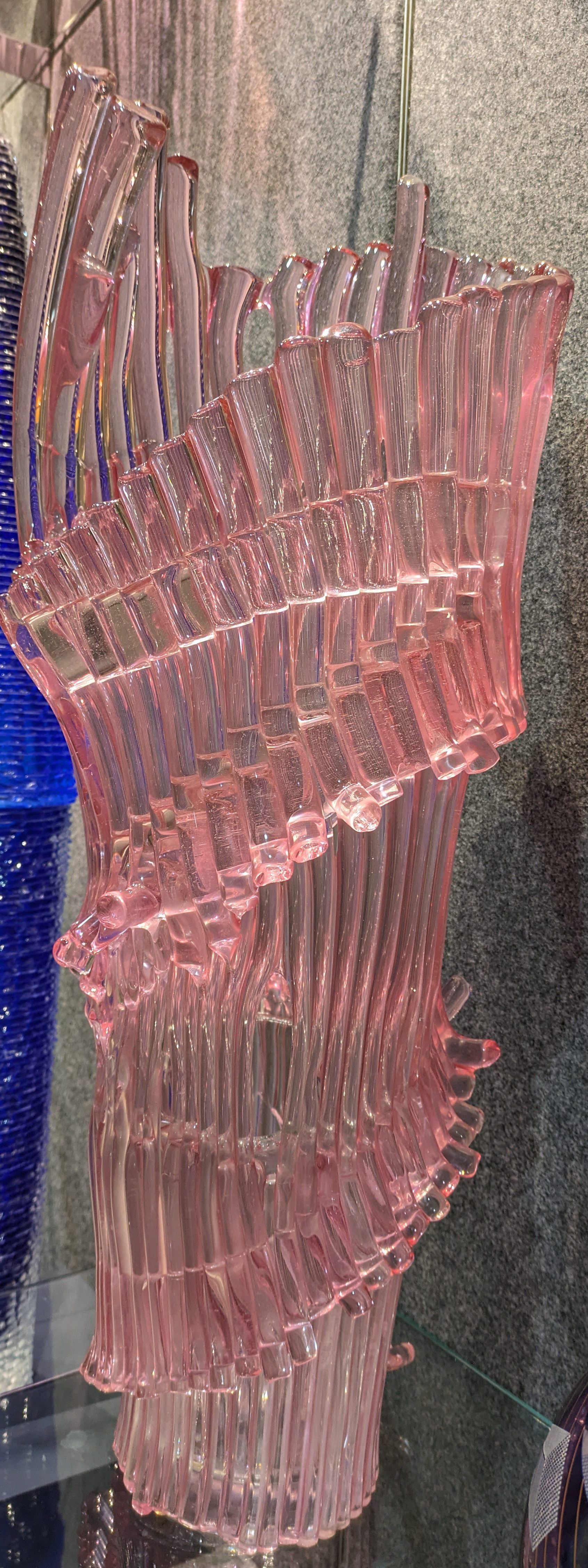 The forms in the Shelter series are created with a Venetian technique called, “Pastarelli.” The process requires pulling approximately 150 feet of cane which is then cut and spirals upward around the vessel. The artist intends the work to connect with refuge, harbor, and dwelling. The shape is reminiscent of a cornucopia, a horn shaped vessel bearing the abundance of fruits and flora.