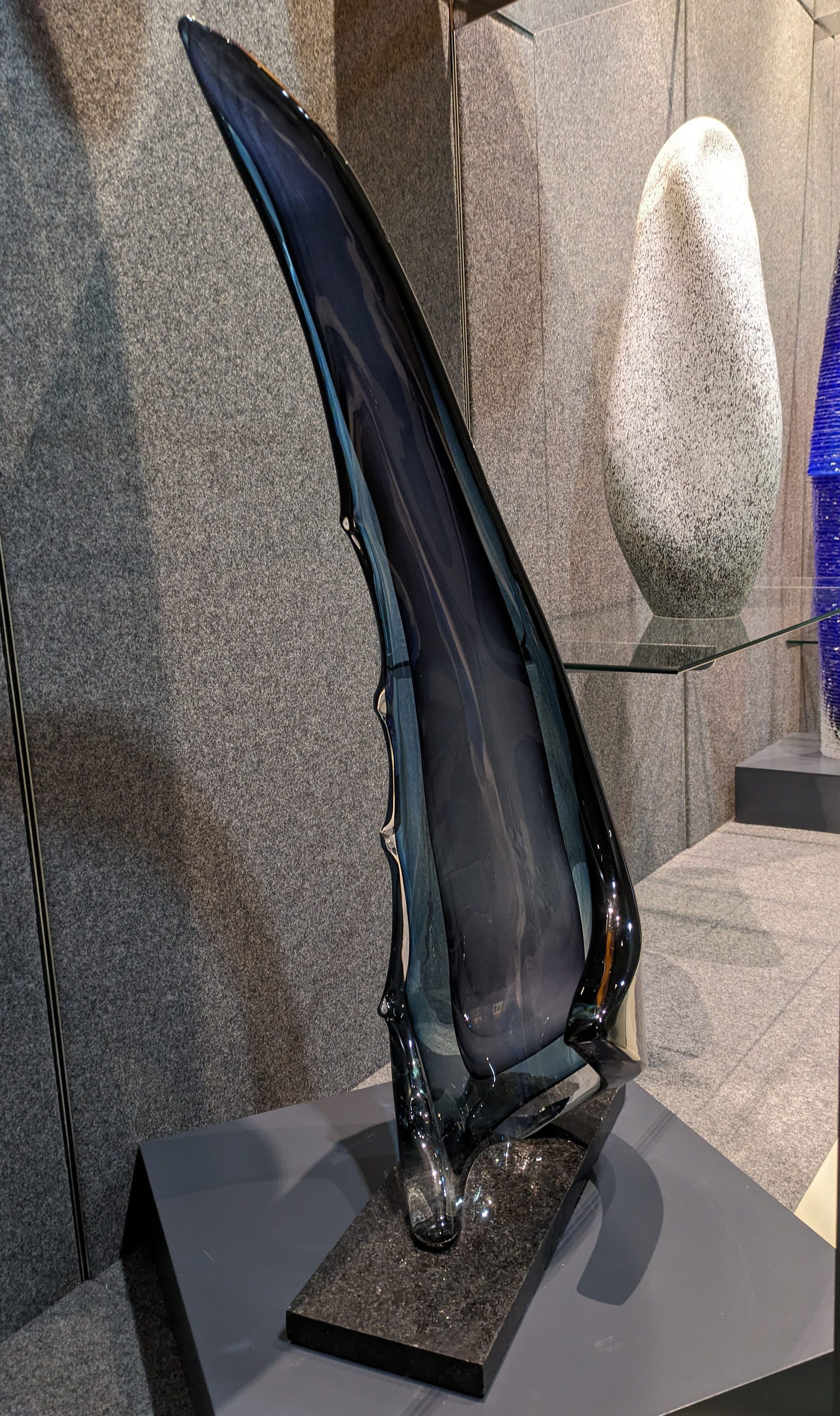 Paul DeSomma’s work is typified by his embrace of minimalism, highlighting the essence of the medium. He prefers freehand, solid glass sculpting, emphasizing the clarity, form, and optical nature of colorless and colored transparent glass. This example is a meditation on blue.